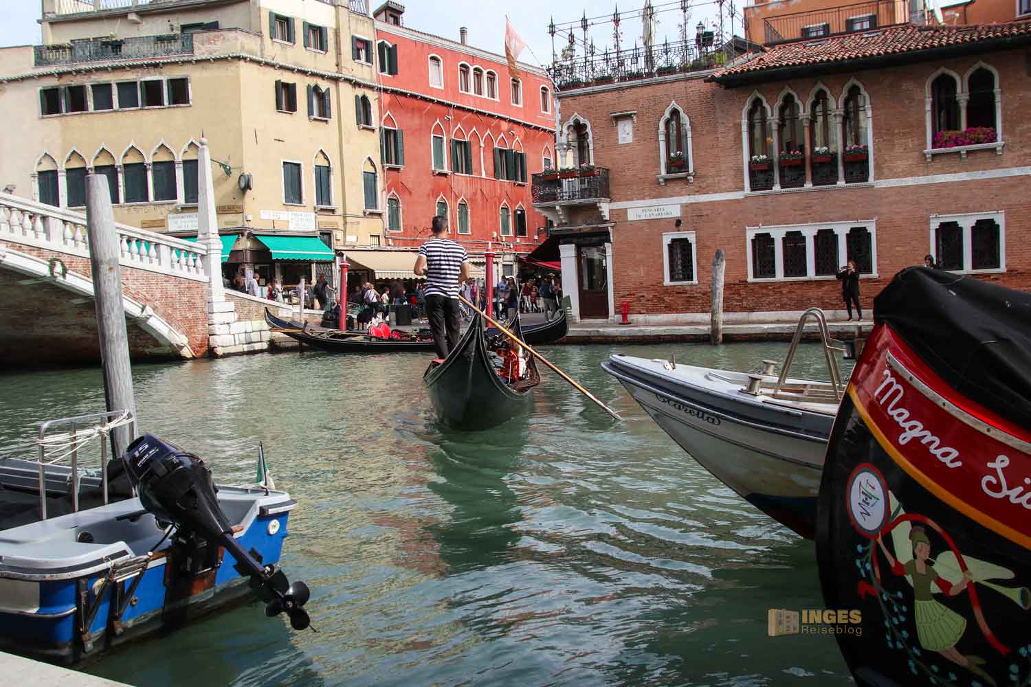 Es war für mich immer wieder spannend die Gondolieri bei ihren Fahrten auf dem Canal Grande und in den Seitenkanälen zu beobachten. Hier beginnt die Fahrt hinunter zum Canal Grande, denn den restlichen Canale di Cannaregio befahren die Gondoliere nicht. Zwei Jahre Ausbildung haben die Männer hinter sich sich, bevor sie die Touristen in den Gondeln durch Venedig schippern dürfen. 80 Euro für 30 Minuten Gondelfahrt kostet das Vergnügen, und gilt einheitlich für ganz Venedig. Denn der Betrieb ist mit genauen Vorgaben und Lizenzierungen geregelt.