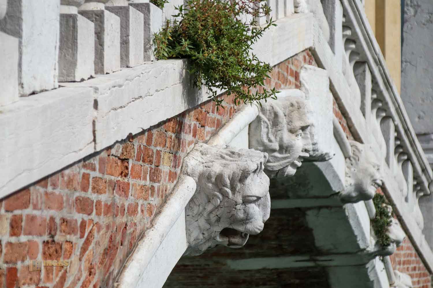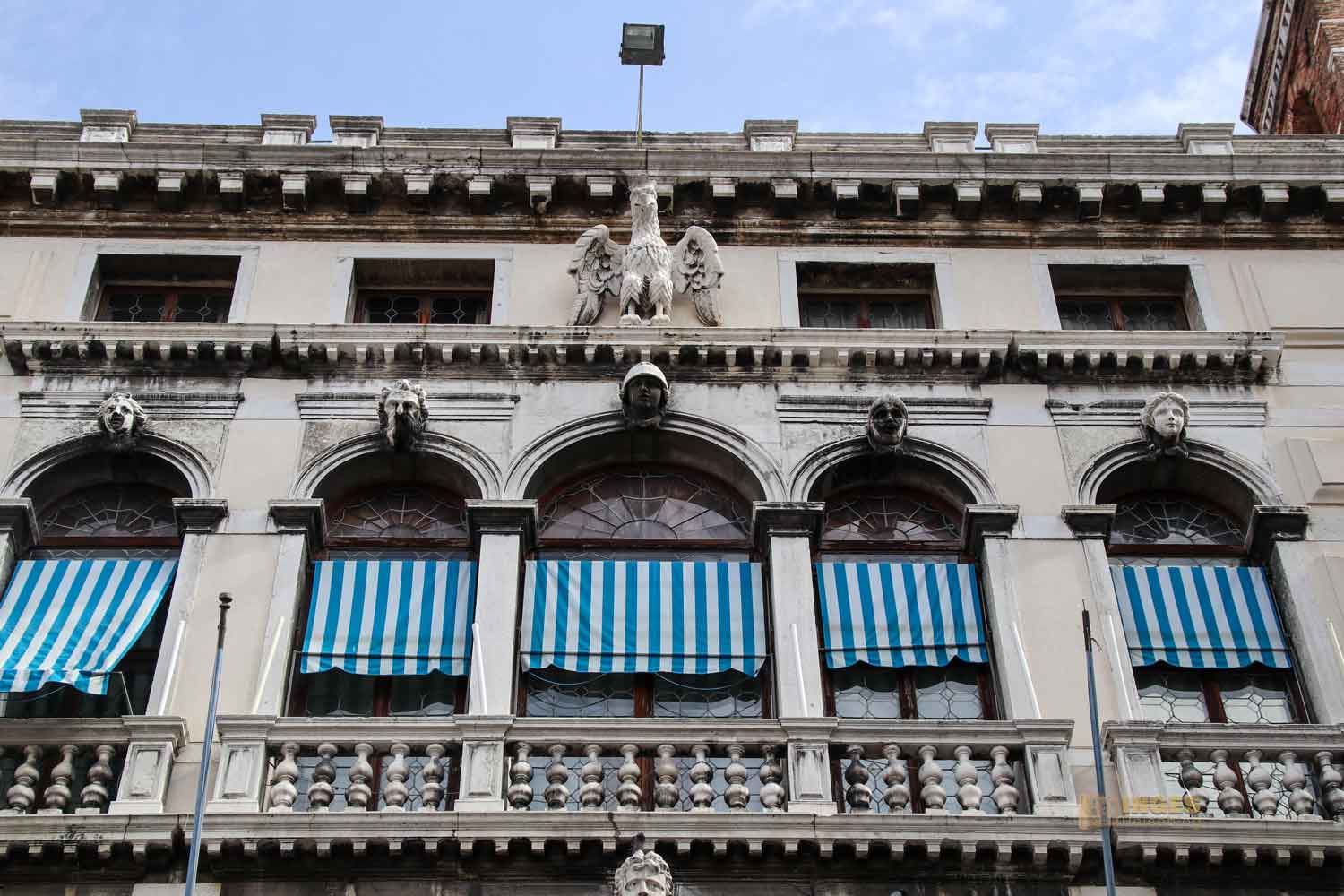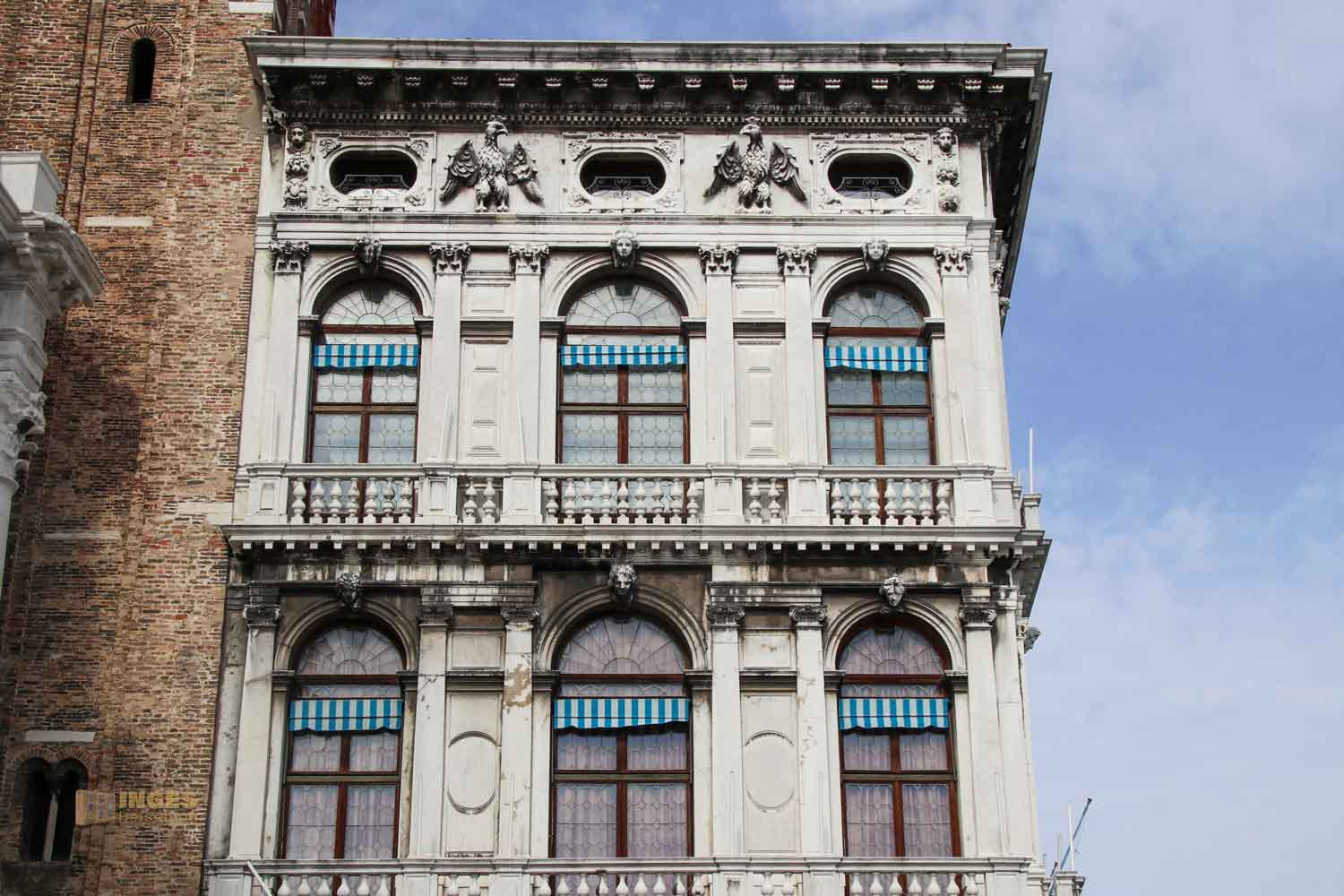 Natürlich muss man auch an der Fassade zeigen, zu wem das Gebäude gehört - die gekrönte Adler, das Wappen der Familie. Männliche und weibliche Skulpturenköpfe schauen zum Campo. Nachdem die Familie Labia nach dem Fall der Republik ihr gesamtes Vermögen verloren hatte und nach Österreich umsiedelte, begann das 'Ringlein-Spiel'. Ihr kennt es sicher aus meinen Berichten - der Besitz wanderte von einer Hand in die andere. Anfang des 19. Jahrhunderts vergrößerte die böhmische Familie Lobkowitz, die auch in Prag Gebäude hat, mit dem Kauf des Gebäudes ihre Besitztümer. Heruntergewirtschaftet wurde das Gebäude mit einer Sägemühle, die im Obergeschoss einzog. Die vielen Besitzerwechsel taten ihr übriges, dass das Gebäude mehr und mehr verkam. Eine Munitionsexplosion in unmittelbarer Nähe gab dem nochmal einen Schub.