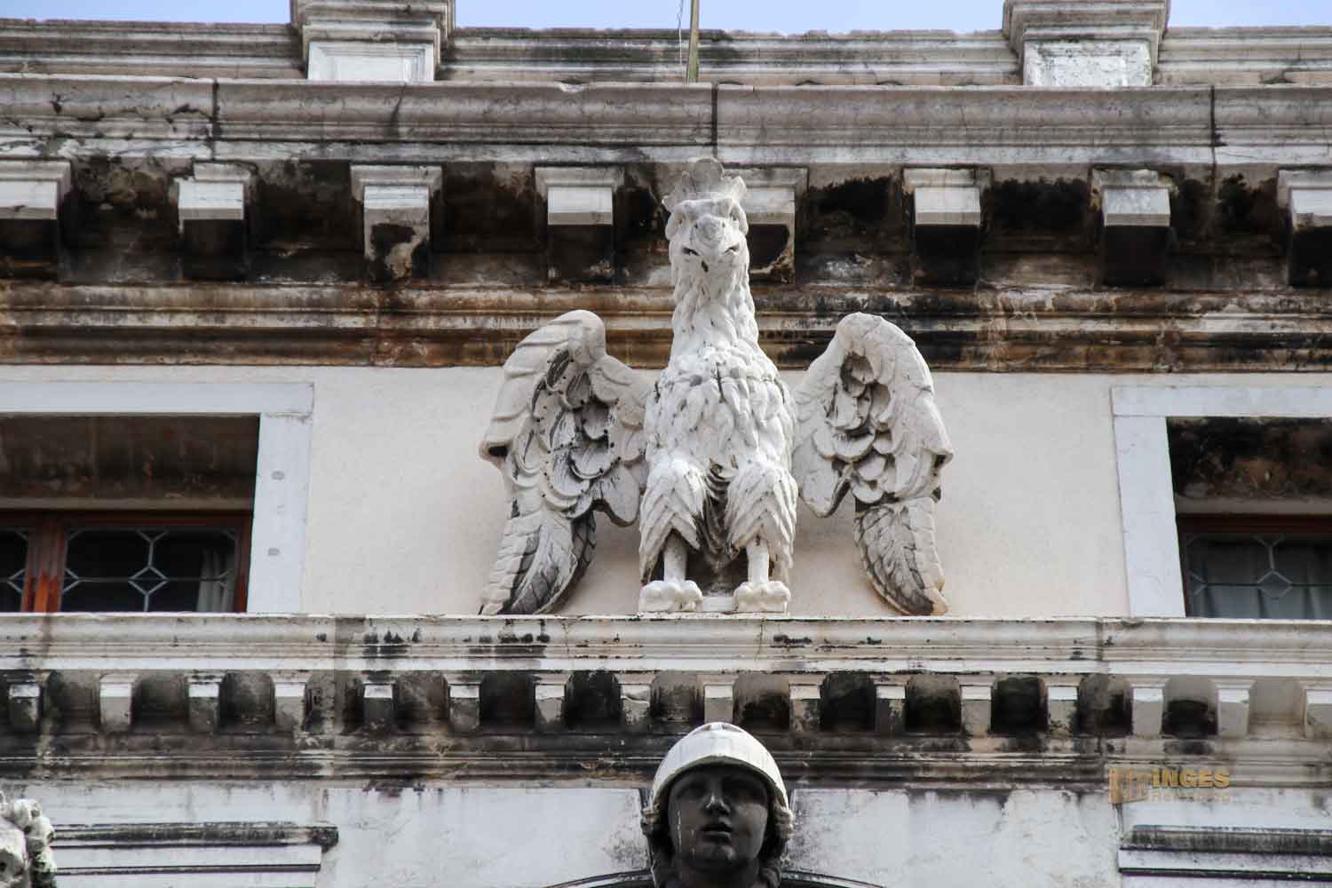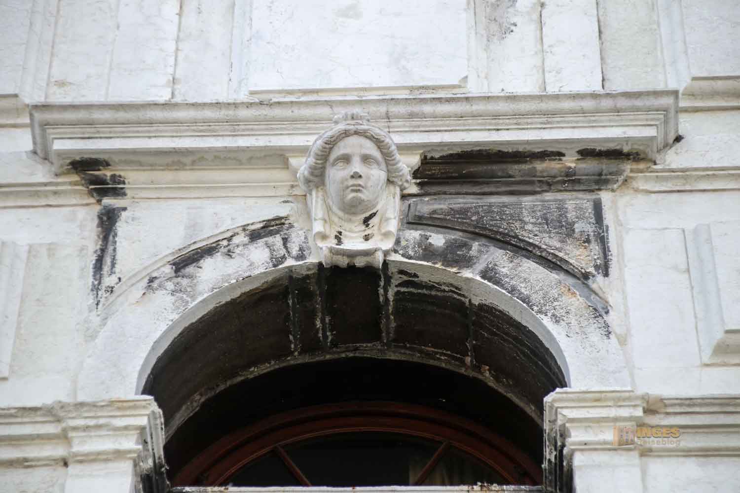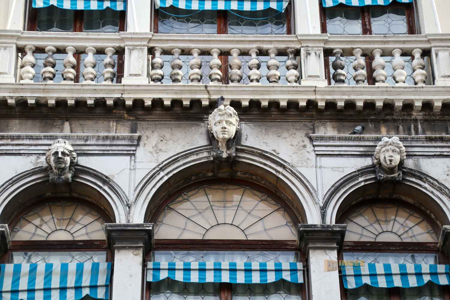 Natürlich muss man auch an der Fassade zeigen, zu wem das Gebäude gehört - die gekrönte Adler, das Wappen der Familie. Männliche und weibliche Skulpturenköpfe schauen zum Campo. Nachdem die Familie Labia nach dem Fall der Republik ihr gesamtes Vermögen verloren hatte und nach Österreich umsiedelte, begann das 'Ringlein-Spiel'. Ihr kennt es sicher aus meinen Berichten - der Besitz wanderte von einer Hand in die andere. Anfang des 19. Jahrhunderts vergrößerte die böhmische Familie Lobkowitz, die auch in Prag Gebäude hat, mit dem Kauf des Gebäudes ihre Besitztümer. Heruntergewirtschaftet wurde das Gebäude mit einer Sägemühle, die im Obergeschoss einzog. Die vielen Besitzerwechsel taten ihr übriges, dass das Gebäude mehr und mehr verkam. Eine Munitionsexplosion in unmittelbarer Nähe gab dem nochmal einen Schub.