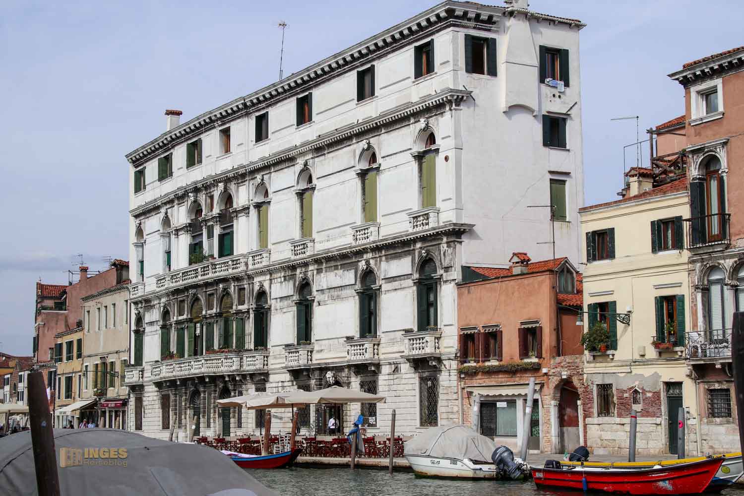 und der ist auch verdient, gilt er doch als wichtigster Palazzo hier am Kanal. Im 17. Jahrhundert wurde er für die Patrizierfamilie Surian gebaut. Das blieb aber nur für kurze Zeit so, bevor er Ende des 17. Jh. an die Familie Bellotto kam. Die französische Botschaft durfte dann in dem vierstöckigen, barocken Gebäude eine Heimat auf Zeit finden. Wenn Steine reden könnten, dann würde dieser Palazzo von einer Zeit des Verlustes und Untergangs seiner einst prächtigen Ausstattung reden. Das alles ging im 19. Jahrhundert für immer verloren. Heute ist es ein ganz normales Wohnhaus. (Ich möchte gerne Mäuschen sein und schauen 😀
