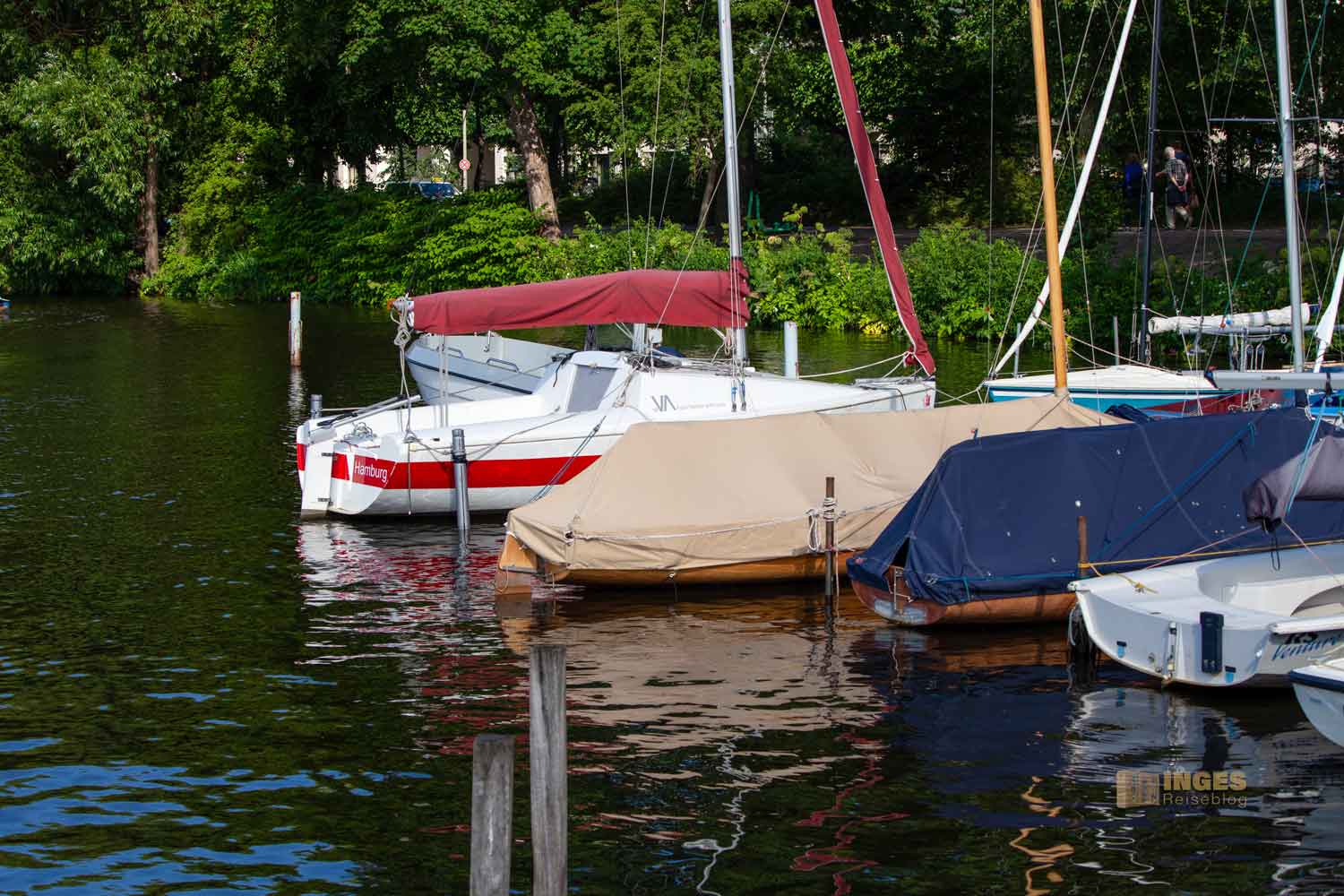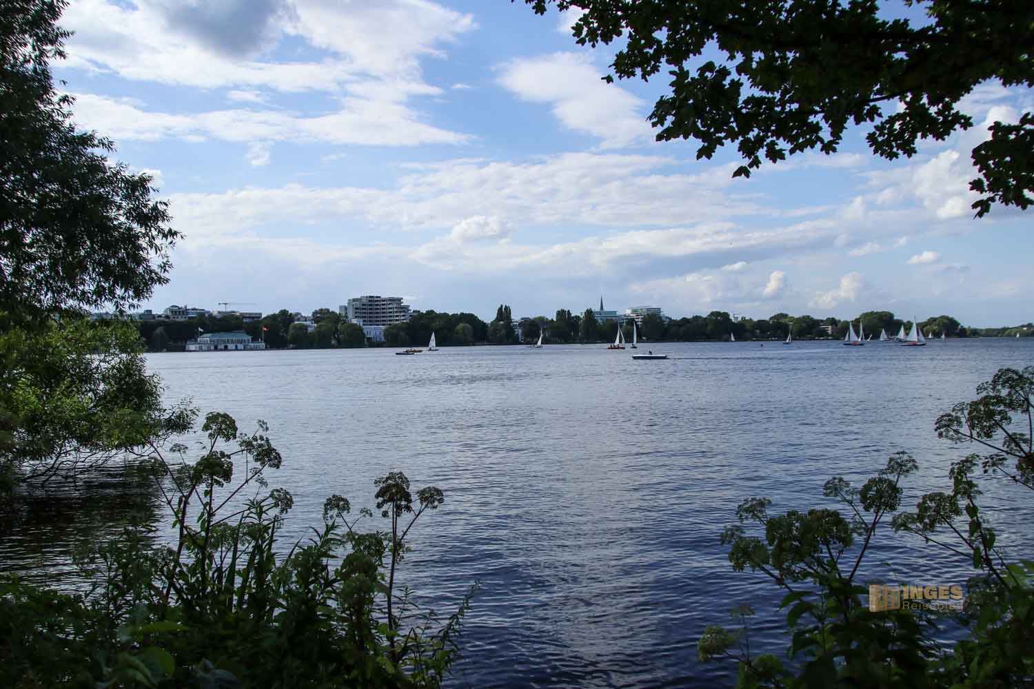 Rund um die Außenalster führt ein 7,4 km langer Weg und es gibt einige Parks. So verwundert es nicht, dass zu Land dieser Teil den Joggern und Radfahrern, aber auch den Fußgängern gehört. Zu Wasser wird er von den vielen Segelschiffen, Booten und Kanuten erobert. Aber auch hier gelten Vorschriften, wie auf manchen Straßenkreuzungen gilt hier ständig "rechts vor links". Und so wie wir es bei unserer Kanufahrt auf der Spree erklärt bekommen haben, gilt es auch hier - die Berufsschiffahrt hat immer Vorfahrt.
