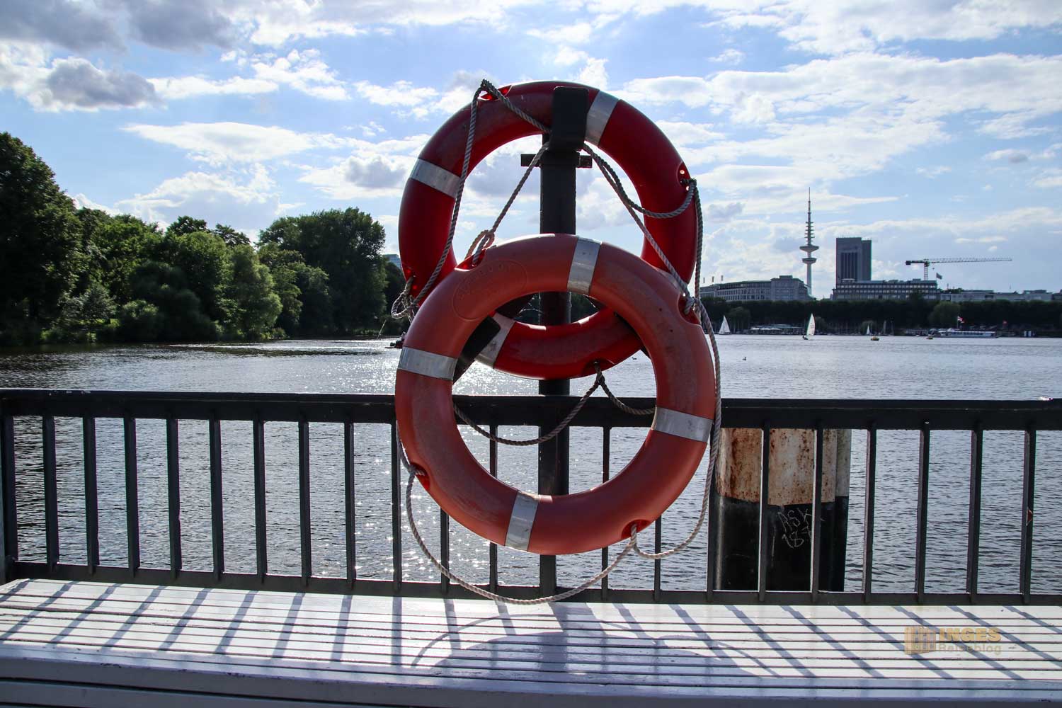 Mein Mann hat mein Zögern erkannt, aber mein Wunsch da vorne zu sitzen war so überstark, dass ich so nach dem Motto 'Augen zu und durch' tapfer über den schaukeligen Holzsteg bin. Ja, auch das sind die Nachwirkungen die mir nach einigen kleinen Schlaganfällen geblieben sind, und mit denen ich einfach klar kommen muss. Ich hab sie auch bei der Turmbesteigung am Michel geflissentlich ignoriert - diese kleinen Gleichgewichtsprobleme, die sich nur in Höhe oder auf nicht festem Grund auswirken. Vorbei an dem kleinen Bootsanlegeplatz (und falls doch was schief geht, mit Rettungsringe) führte mich mein Schatz an der Hand langsam nach vorne - ich liebe ihn einfach 🥰😘