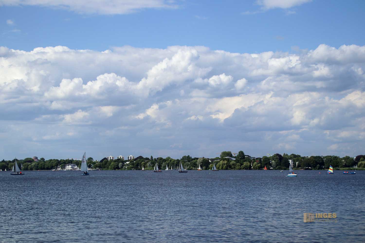 Ich habe es am Schluchsee im Schwarzwald schon erlebt, wieviel Betrieb man innerhalb einer halben Stunde am gleichen Ort, mit gleichem Blick erlebt. Hier an der Außenalster war es noch ein bisschen extremer. An diesem wunderschönen sonnigen Tag war einiges los da draußen. Schaut mal ....