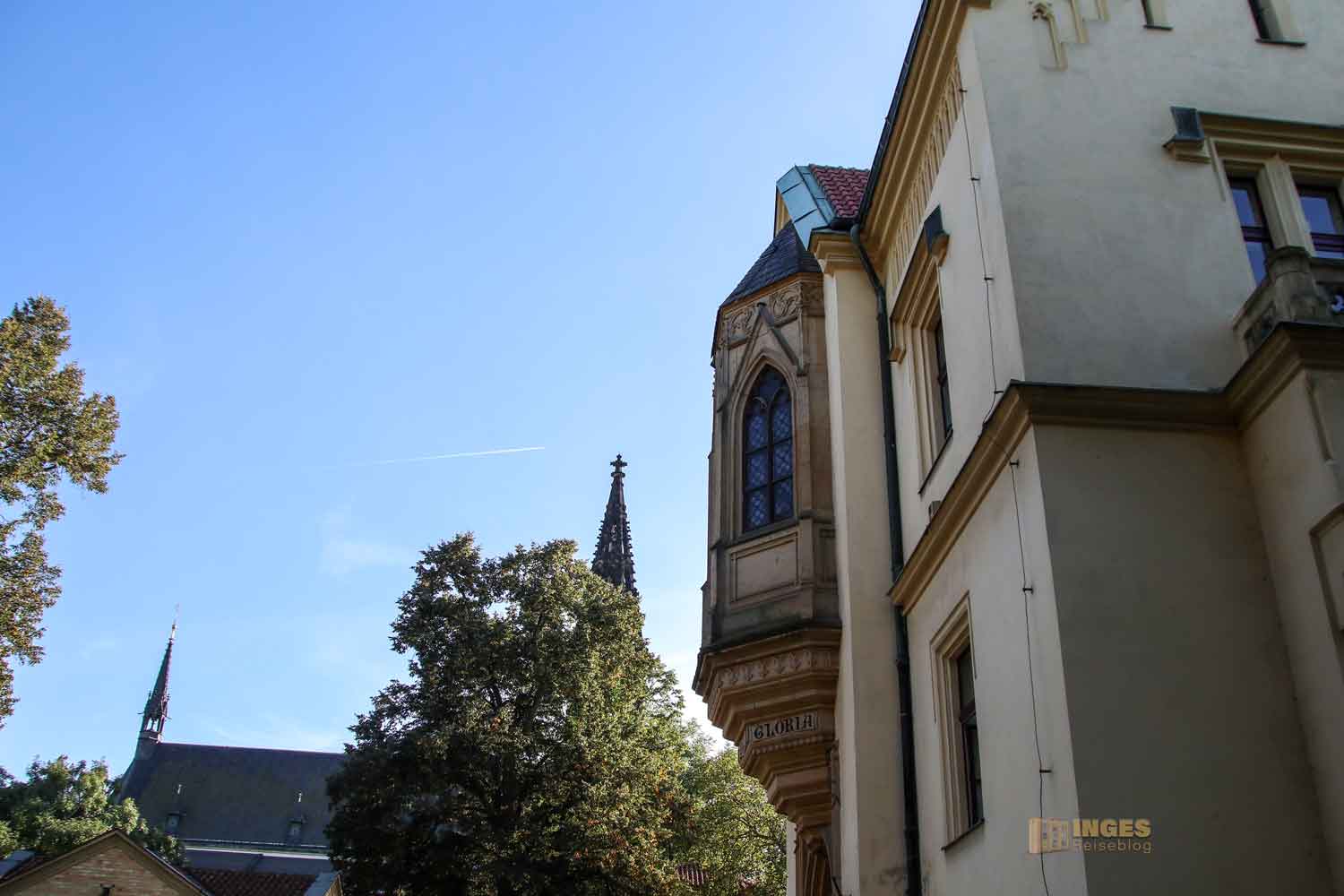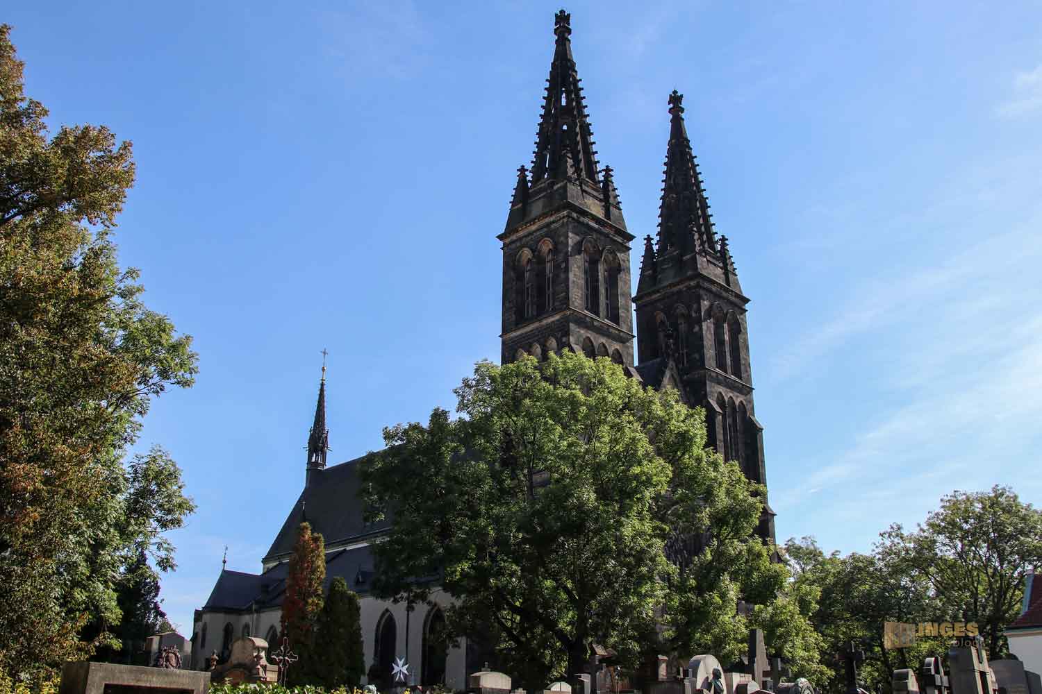 Auf einigen Fotos seht ihr links von der Kirche mit der Kuppel im Hintergrund zwei schwarze Türme. Das ist der Zwilling von der Kirche auf dem Vyšehrad, die Kirche St. Ludmilla.
