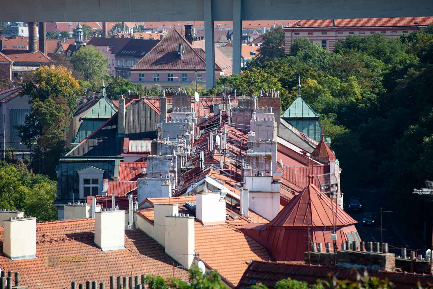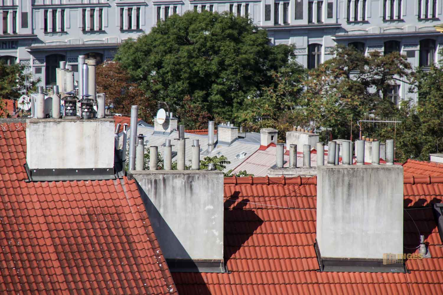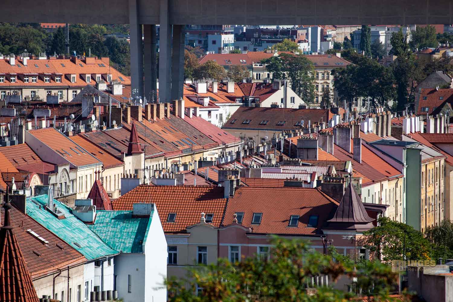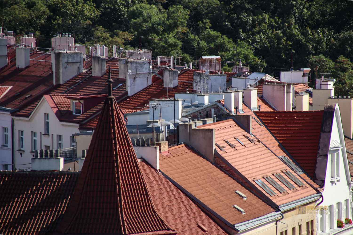 Auch dieser Blick auf die Dächer bietet vom Vysehrad eine interessante Perspektive. Ob sich da noch jemand auskennt mit den vielen Kaminen und Abluftrohren?