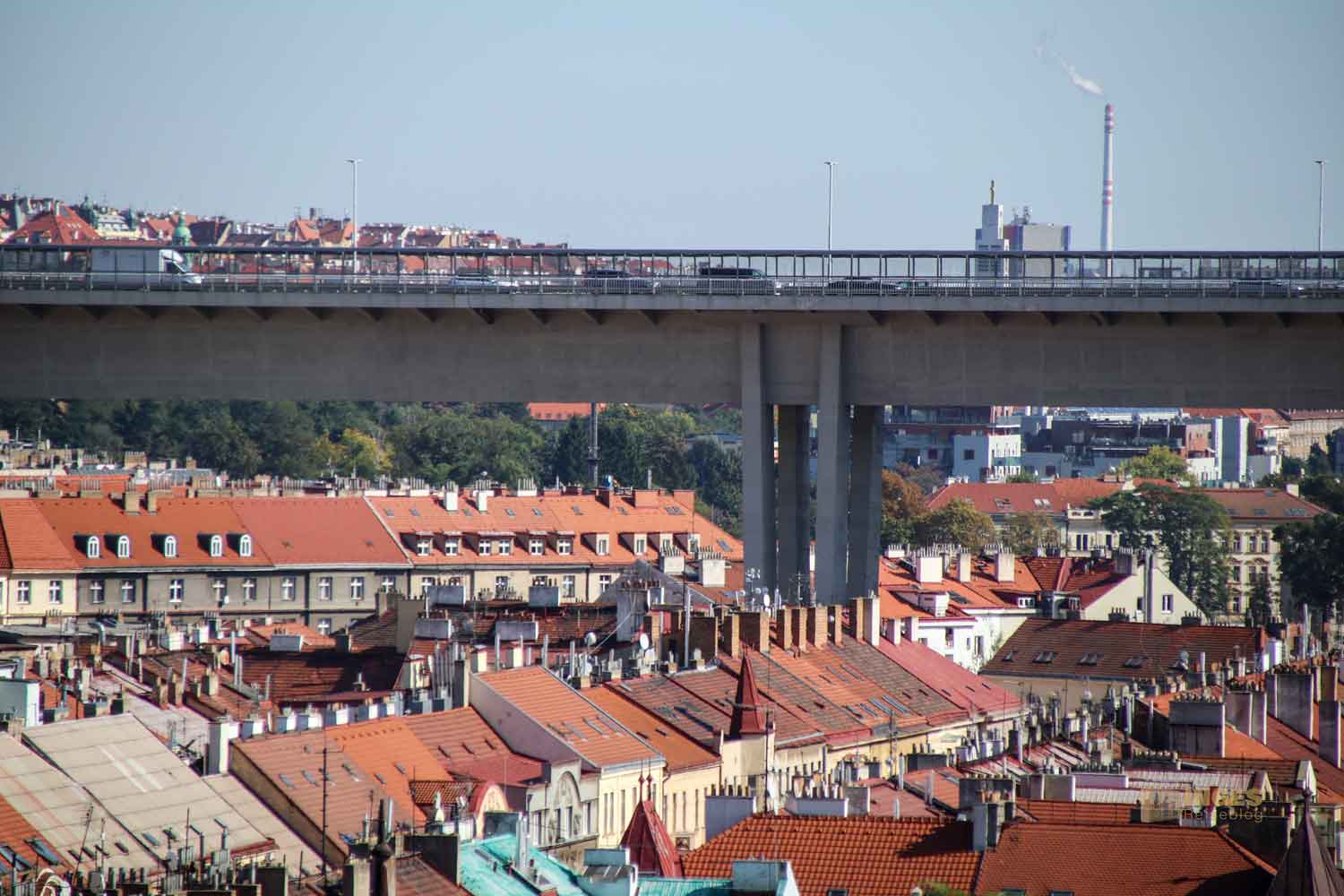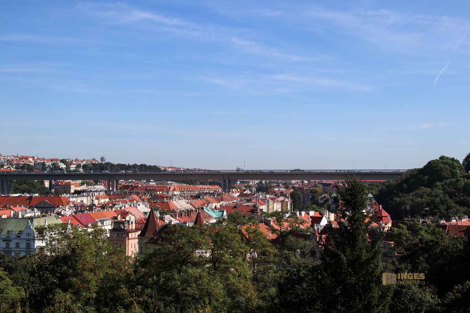 Bei diesem Blick hinüber zur Brücke übers Nusle-Tal kam der fragende Blick zu meinem Mann: Dort rechts von der Brücke sind wir doch von der Metro ausgestiegen? Dort beim Kongresszentrum von Prag. Beim genauen Blick stellten wir fest, dass die Metro unterhalb der Brücke fährt. 485 Meter ist die Nuselský-Brücke lang, und ist eine der größten Brücken in Tschechien. 1975 wurde mit dem Bau begonnen. Nach 14 Jahren Bauzeit verbindet sie jetzt Prag 2 mit Prag 4 (die großen Stadtteile in Prag sind nur durchnummeriert).