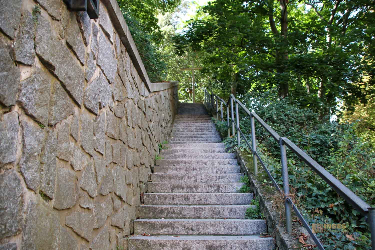 Gegenüber dem Kloster steht die Kirche zu Ehren des Hl. Johannes Nepomuk auf einem Felsen. Damit man nicht klettern musste, bekam die Kirche eine wunderschöne Freitreppe, die wirklich sehenswert ist. Auch zu dieser Kirche gibt es einen ausführlichen Bericht auf meinem Reise- und Fotoblog.