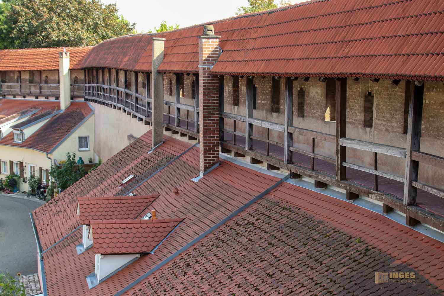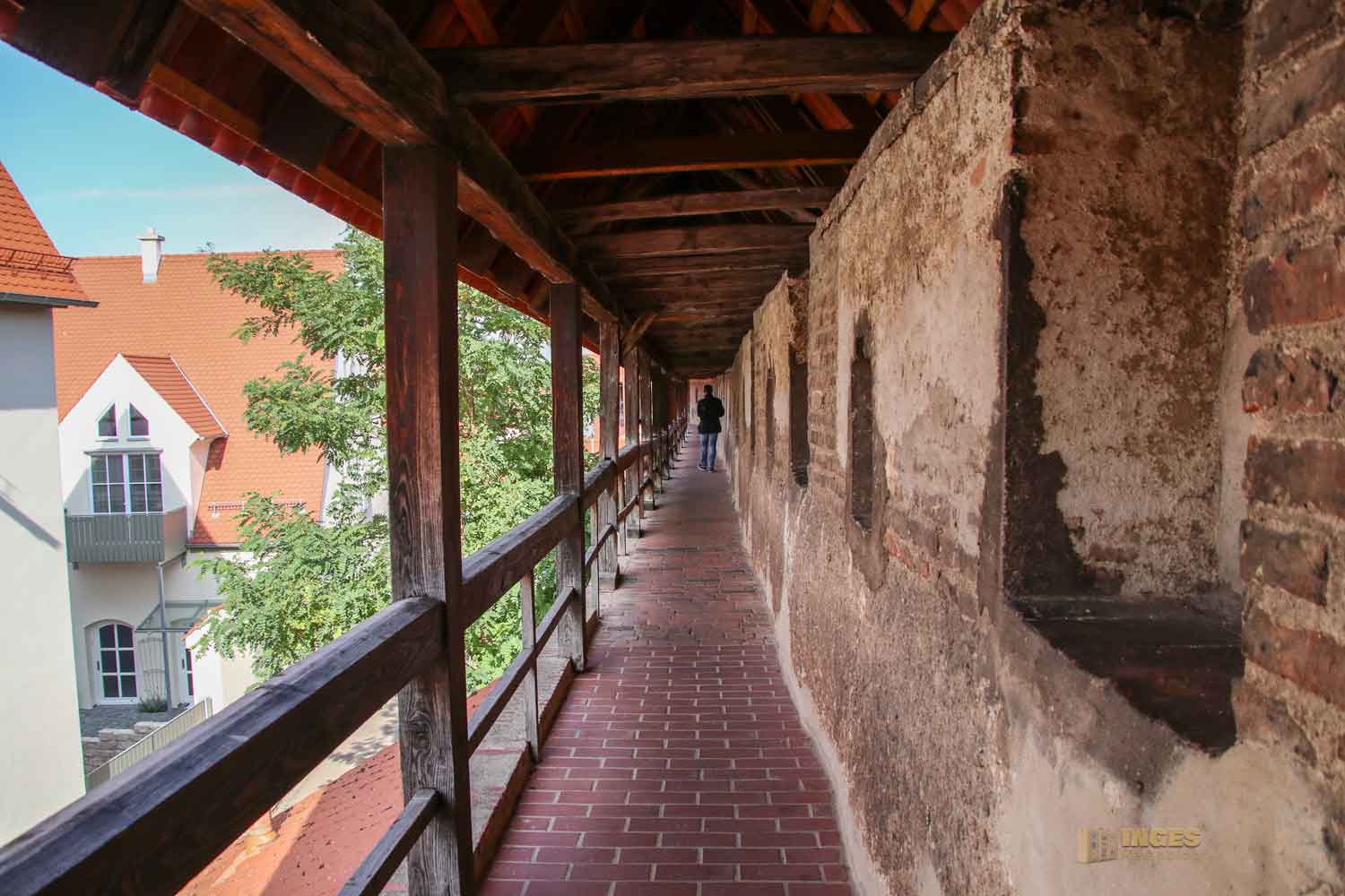 Einzigartig in Deutschland ist in Nördlingen die völlige Umrundung einer Stadt auf der Stadtmauer. Auf 2,6 Kilometer Länge ist der überdachte Wehrgang um die mittelalterliche Stadt Nördlingen ohne Unterbrechung begehbar.