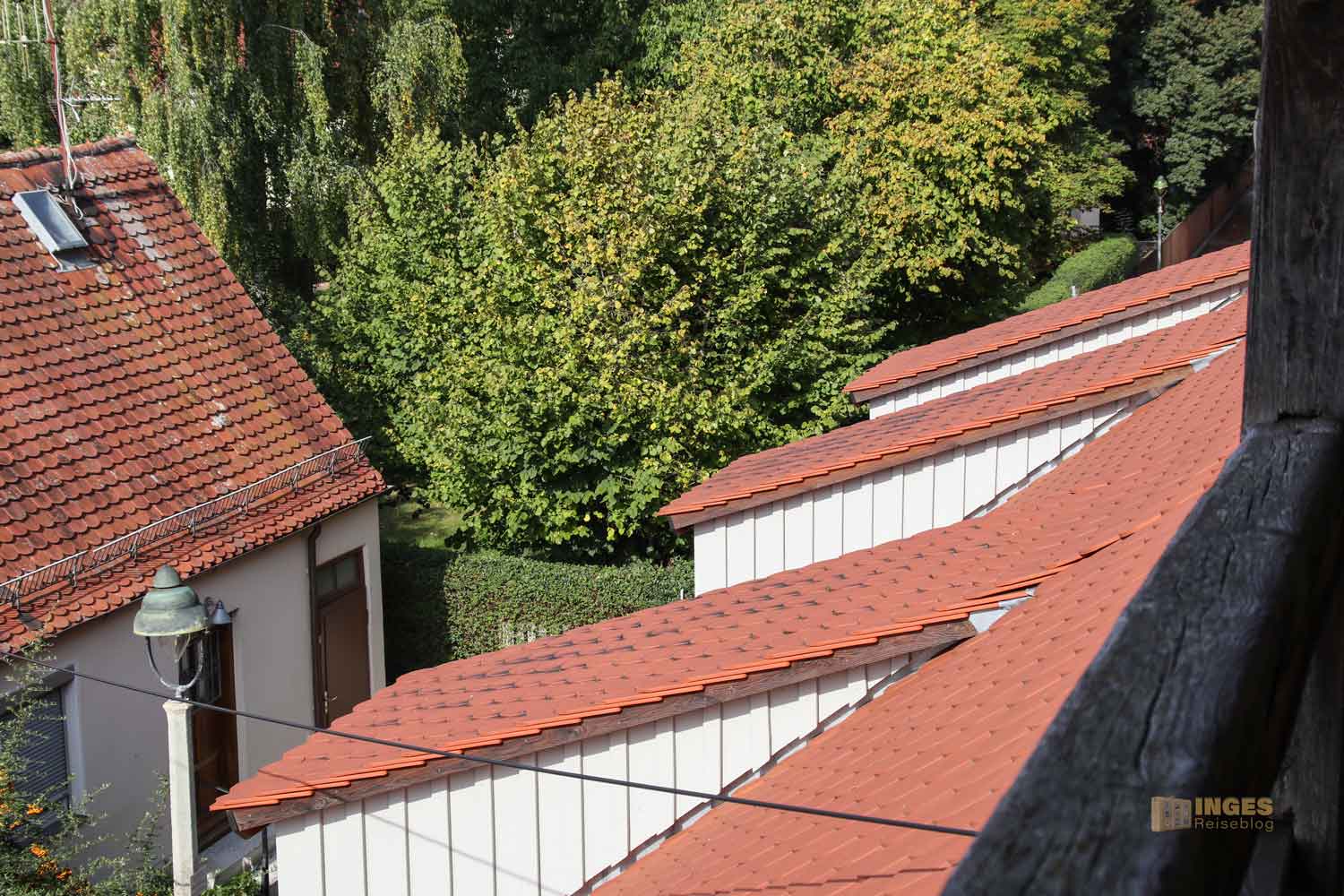 mit einem Blick von oben. Kleine Häuschen sind an die Stadtmauer angebaut und dienten in früheren Zeiten entweder den Mitgliedern der Stadtwehr oder armen Bürgern Wohnraum. Groß sind sie ja wahrlich nicht. Zu gerne würde ich da mal einen Blick hinein werfen. So blieb mir jetzt nur der Blick von oben auf die liebevoll geschmückten kleinen Häuschen.