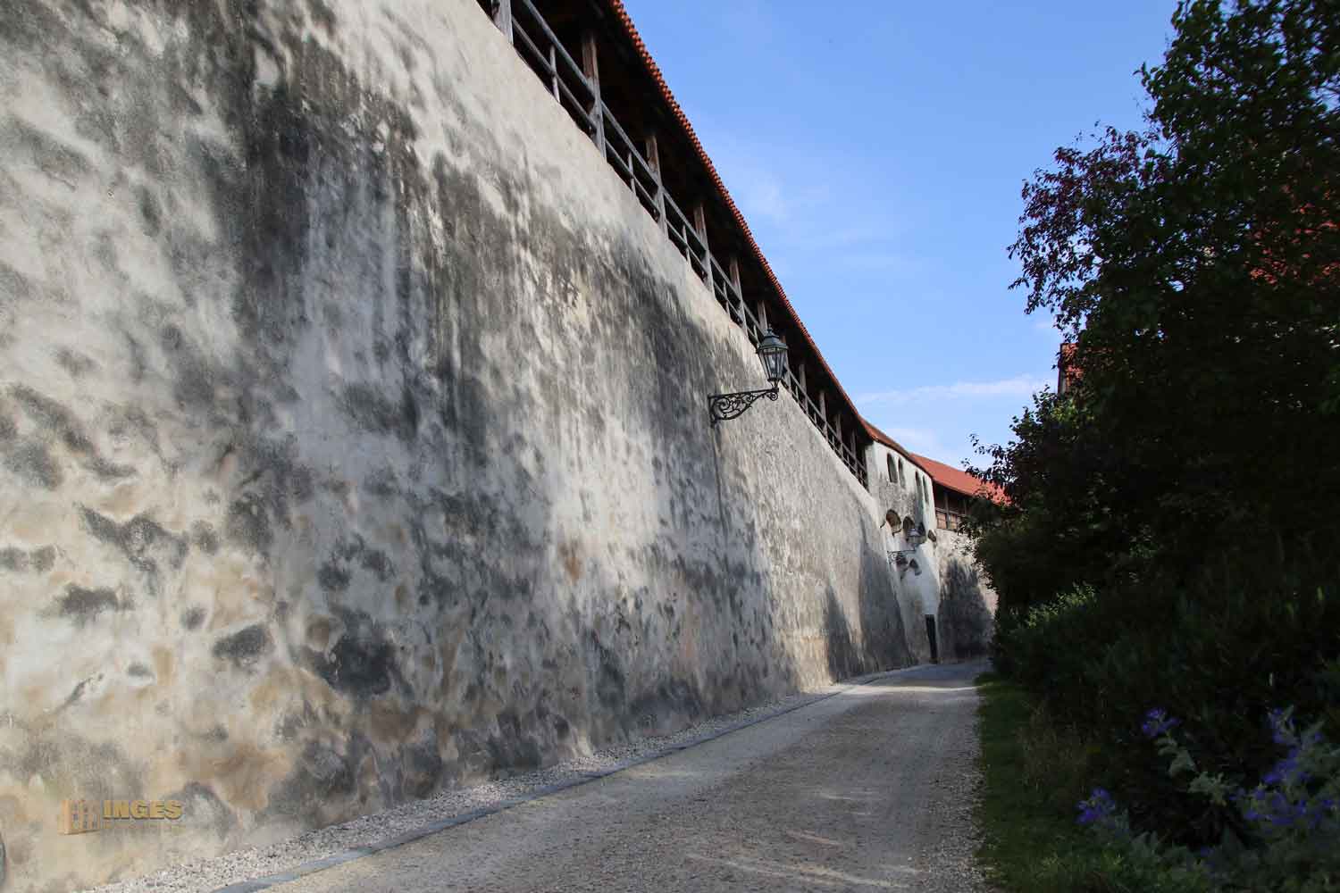 den wir nach der Besichtigung der St. Salvator Kirche, die am Ende unserer Stadtbesichtigung stand, begonnen haben. Wir haben ungefähr zwei Drittel der gesamten Strecke geschafft. Und wenn man da oben auf, und unten an der Stadtmauer geht, dann weiß man, warum sich die Stadt diesen Slogan gewählt hat. "Die schönsten Ecken sind rund" - stimmt! Die Stadtmauer geht im Rund rings um die Altstadt.