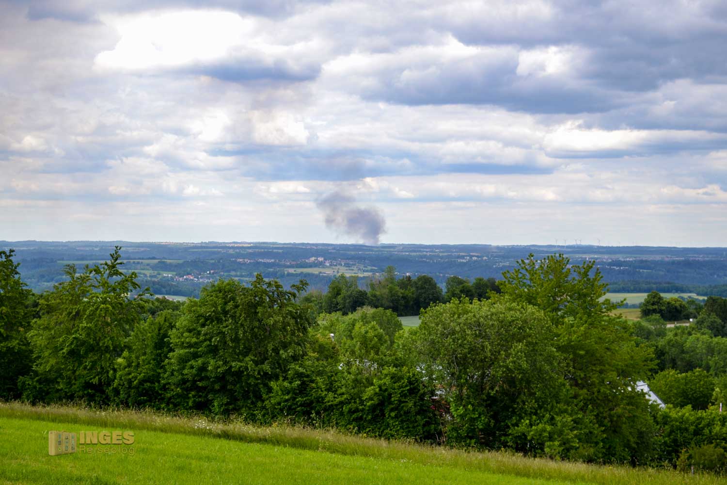 Zeigt das zweite Foto den herrlichen Blick auf den Rechberg im Vordergrund und den Stuifen, so verheißt die Rauchschwade auf dem ersten Foto nichts Gutes. Schon am Ortsende von Waldstetten waren die dunklen Wolken in ca. 30 km Entfernung zu sehen, am Fuß des Hohenstaufens noch deutlicher. Ein Großbrand in einem Sägewerk war die traurige Ursache dieser Rauchsäule.