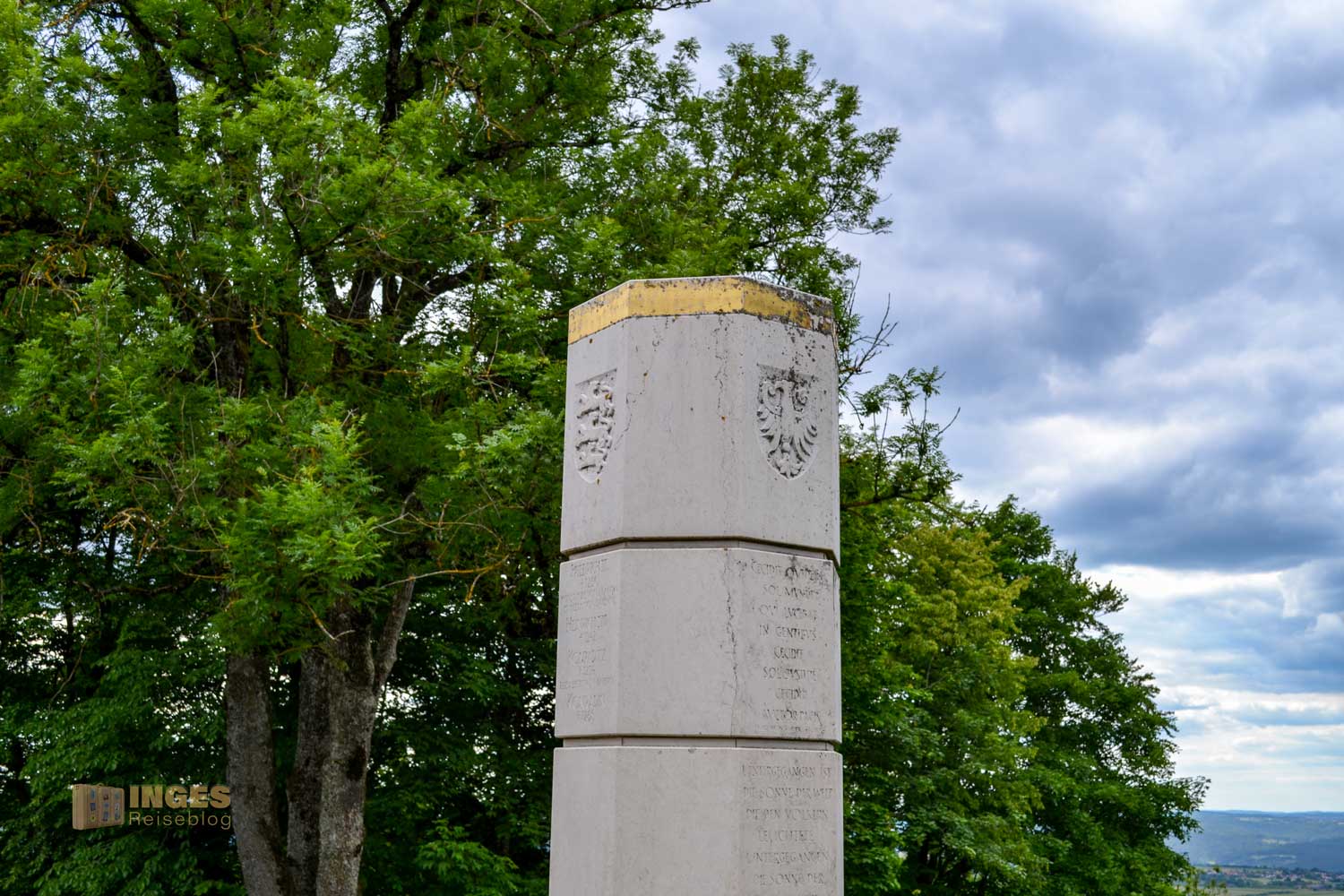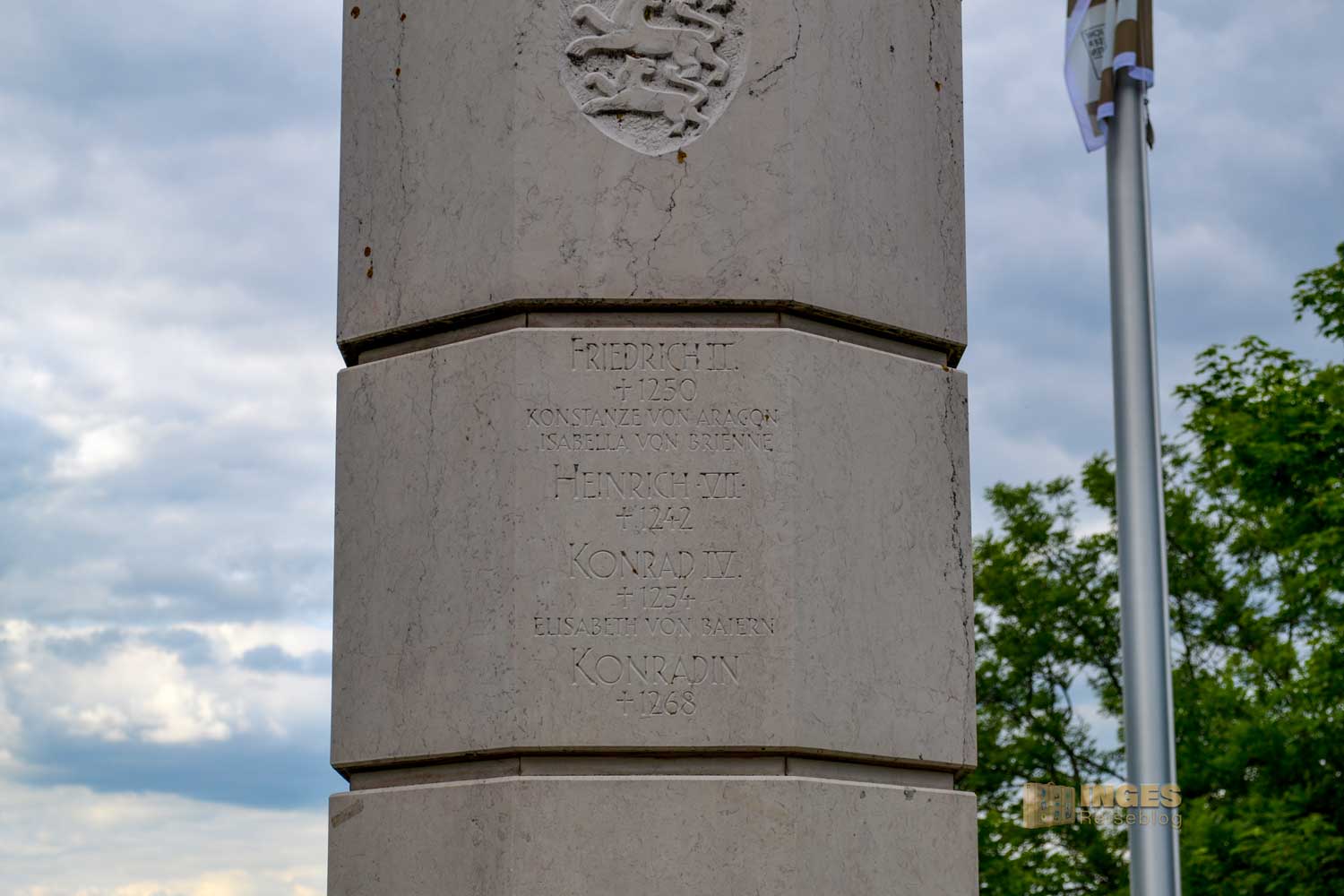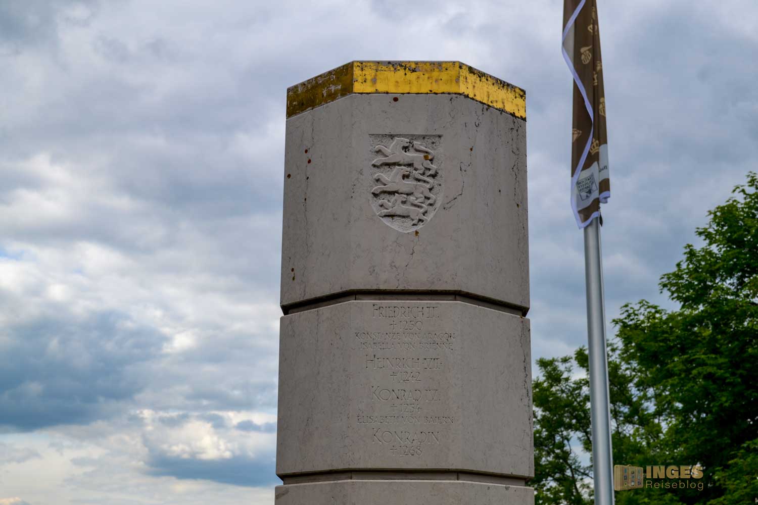 Die vier Seiten der Stele zieren die Wappen des Reiches und des Herzogtums Schwaben mit jeweils unterschiedlichen Inschriften. Wenn ihr mehr über diese Stele, sowie den anderen Stauferstelen nachlesen möchtet, dann klickt HIER.