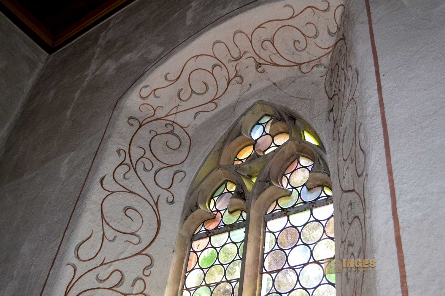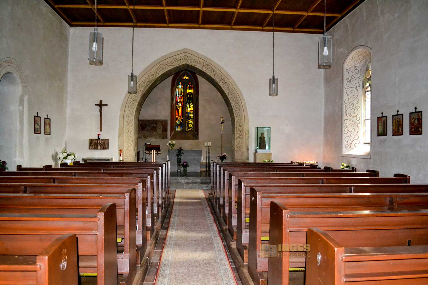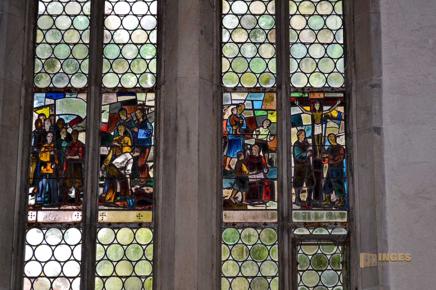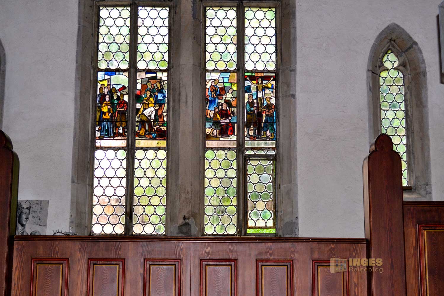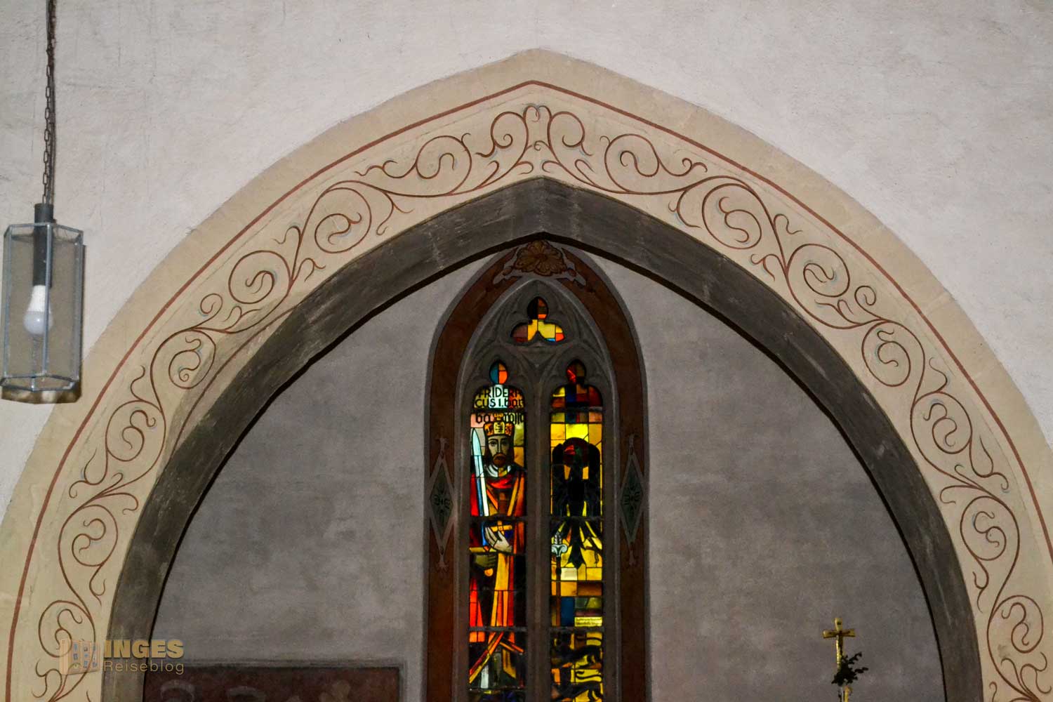Das Chorfenster zeigt das Bildnis Kaisers Friedrich I. Barbarossa, den Reichsadler und das Stauferwappen. Aber auch die Verglasung an der Westwand ist ein Blick wert.