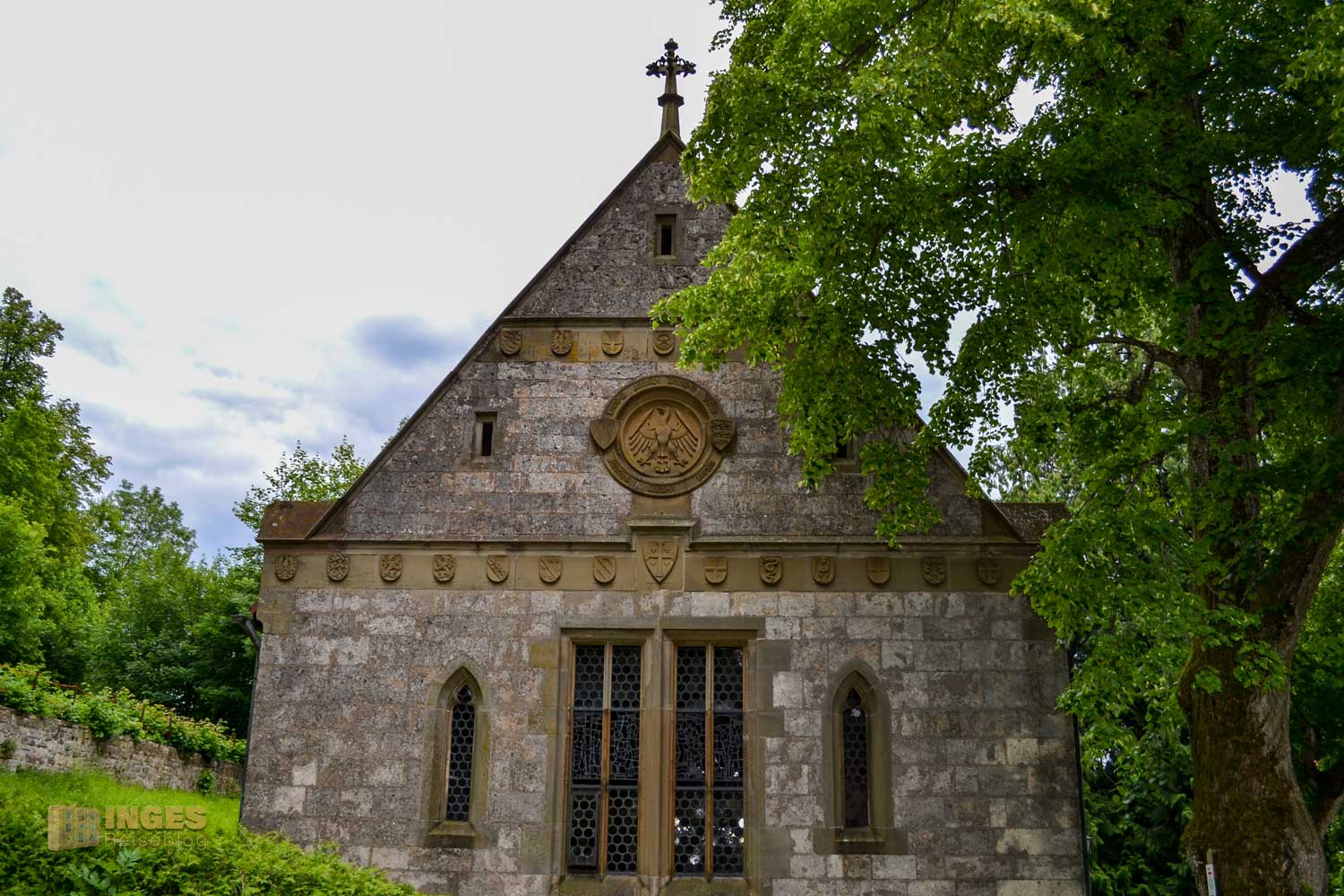 Die äußere Umgestaltung der Kirche begann 1859, indem der Westgiebel die Wappen der staufischen Herrschaftsgebiete, der sieben Kurfürsten und Ministerialengeschlechter bekam. Der große Reichsadler sollte den gesamtnationalen Aspekt der Stauferherrschaft hervorheben. Die Mächtigkeit des Stauferreiches wurde durch die Wappen aller europäischen und kleinasiatischen Lehensgebiete hervorgehoben.