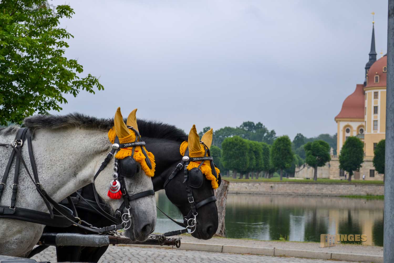 Die Zufahrtsstraße durch den Ort Moritzburg führt fatzgerade auf das Schloss zu. Es geht vor den Seen nur noch links oder rechts. Fridolin haben links auf dem großen Parkplatz für einen moderaten Parkpreis abgestellt. Und dann ging es Richtung Schloss. Viele Pferdegespanne haben auf die Besucher gewartet um sie durch Moritzburg (den Ort) zu bringen. Fast so wie in alten Zeiten, denn an dieser Stelle war wohl früher auch die Postkutschenstation.