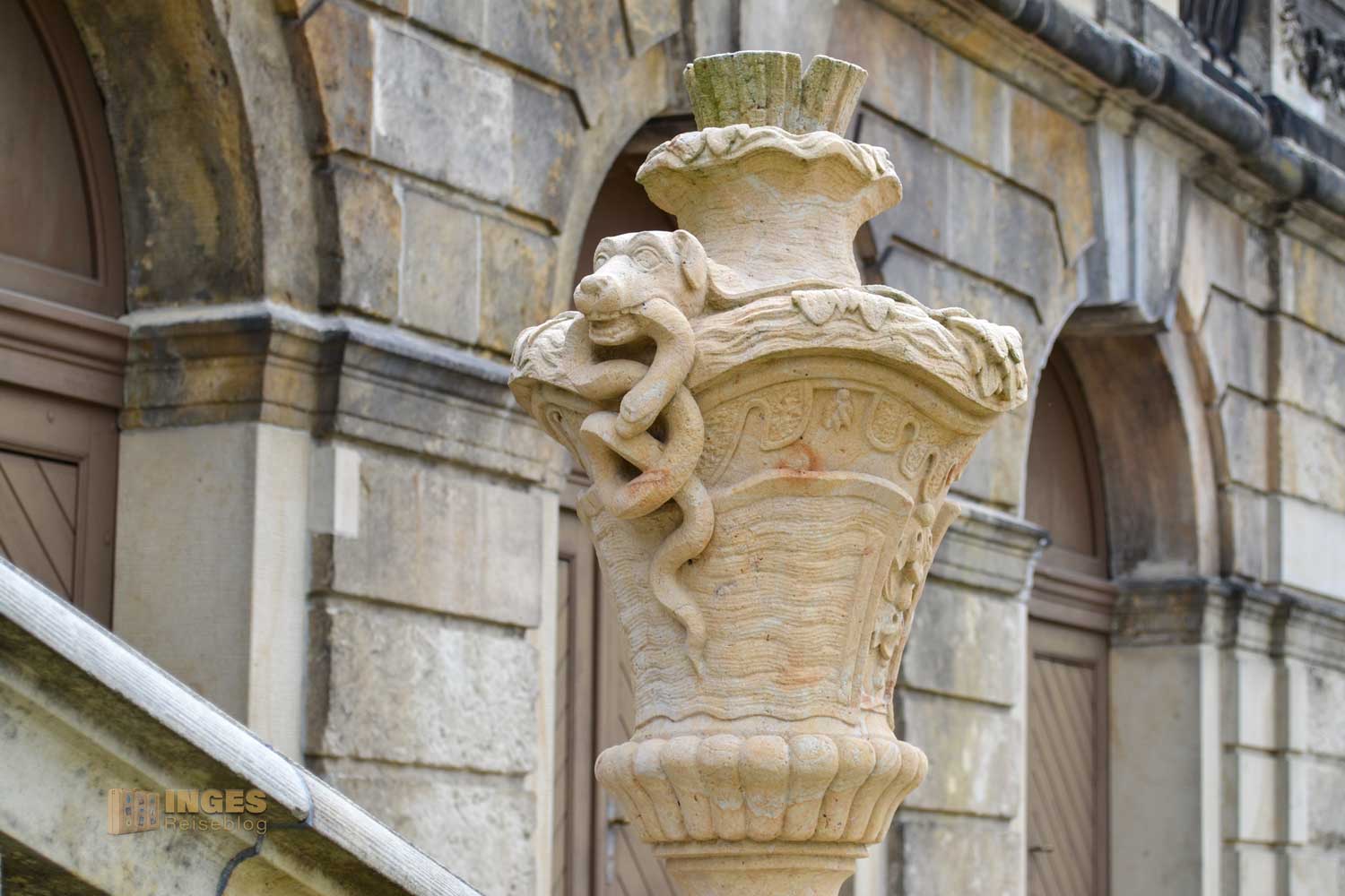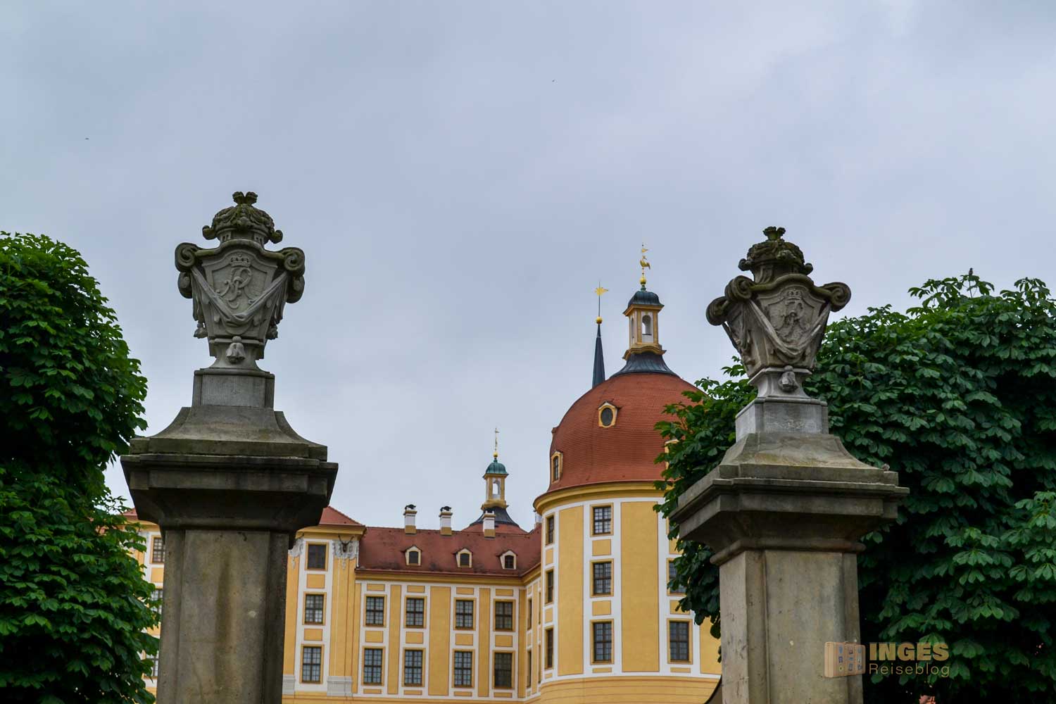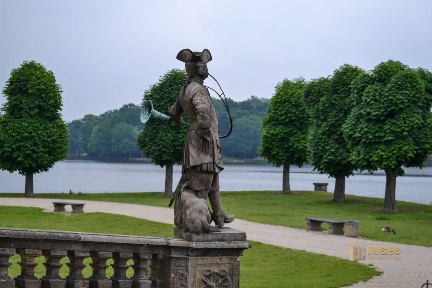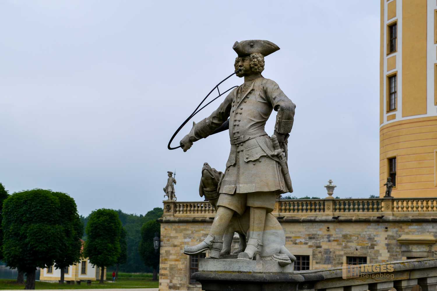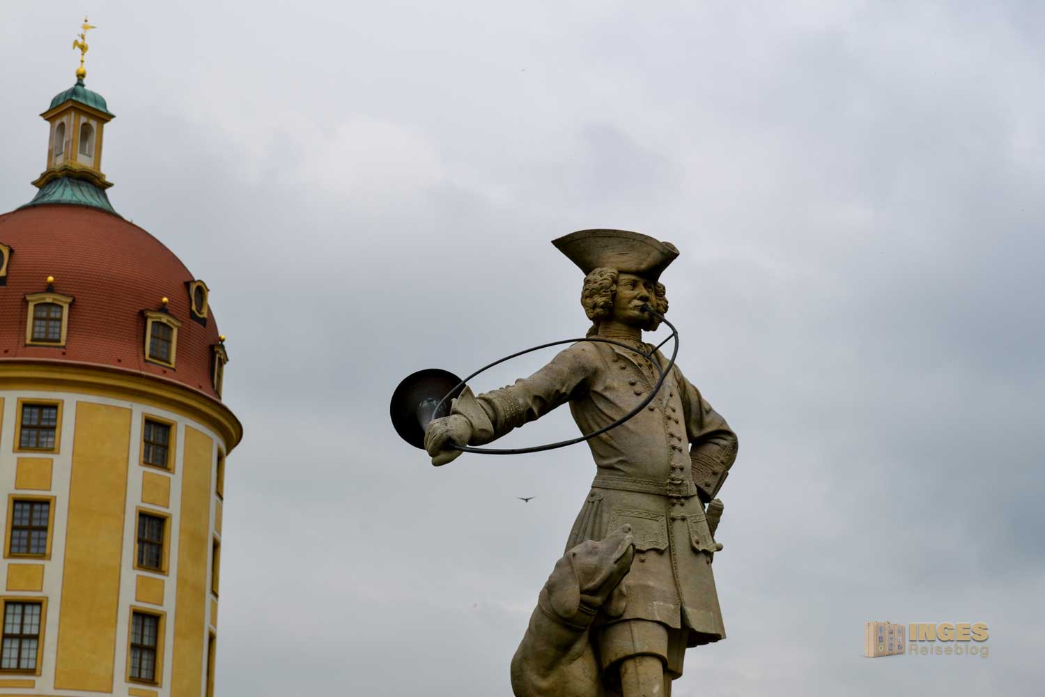 Die Sandsteinskulpturen an der Schlossauffahrt lassen schon darauf schließen welchem Zweck Schloss Moritzburg einst gegolten hat - ein Jagdschloss.