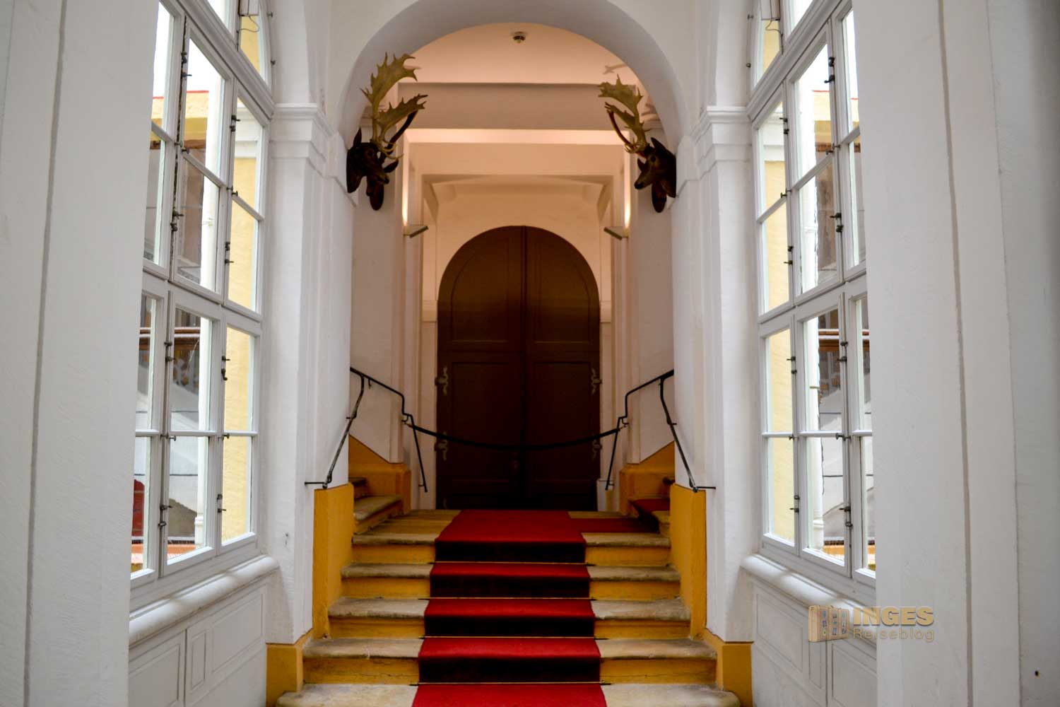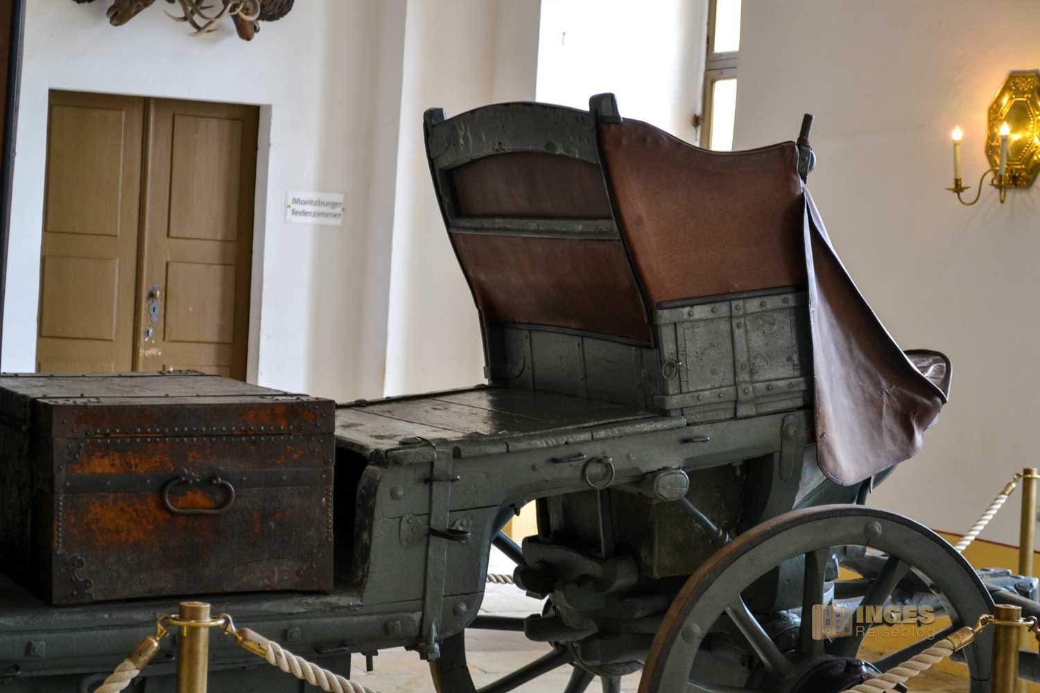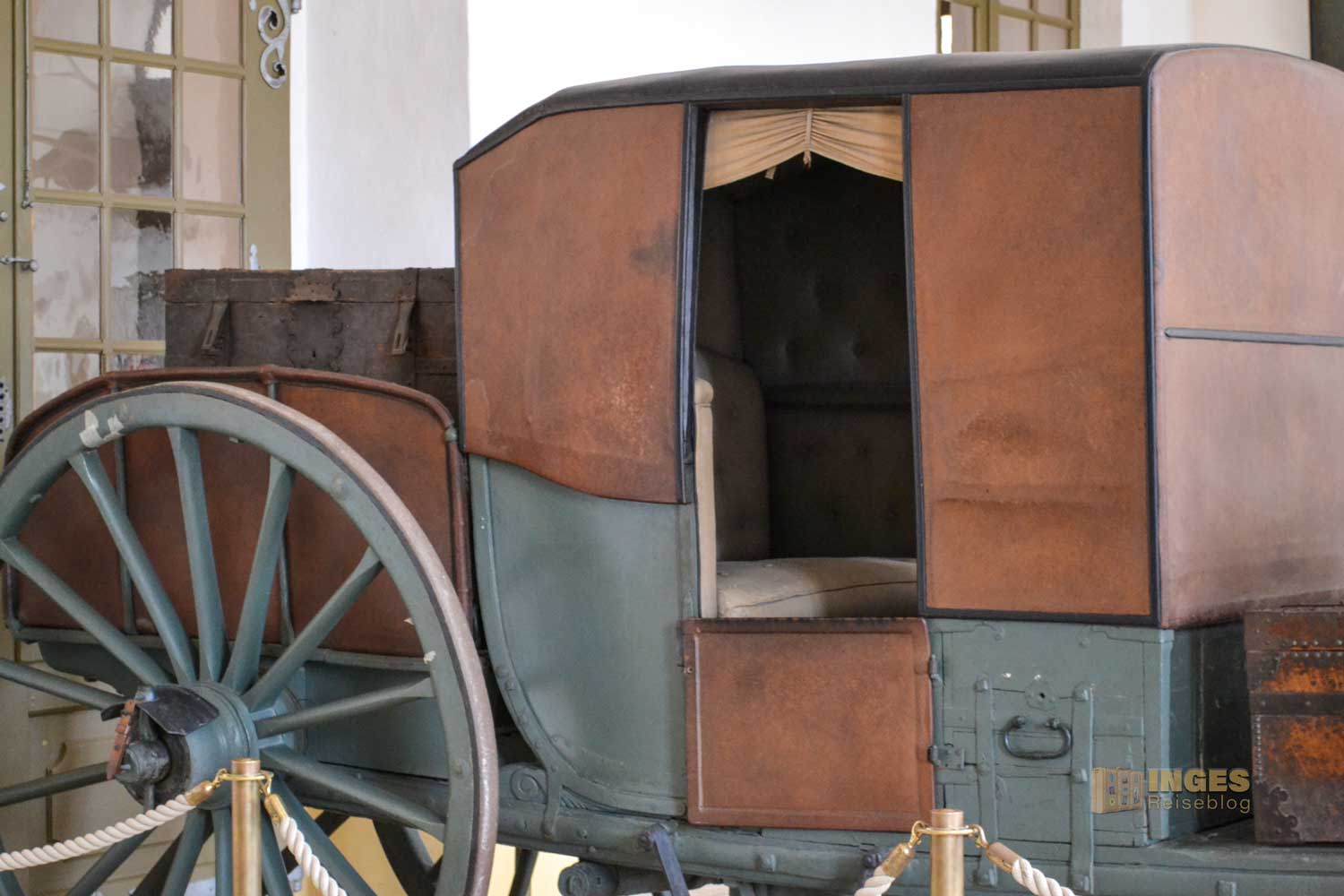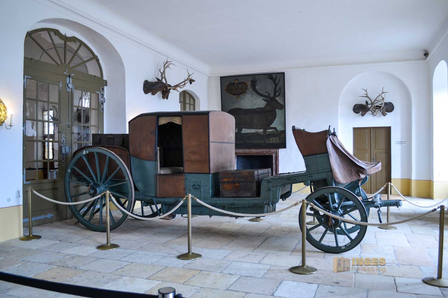 Der Rundgang endet in der Eingangshalle bei der Kutsche aus dem 18. Jahrhundert. Diese diente früher als Wagendurchfahrt, denn die königliche Familie fuhr samt ihren Gästen direkt in das Jagdschloss hinein. In dieser Halle stieg man dann aus, um über die seitlichen Treppenhäuser in die Gemächer zu gelangen. Geschickt gelöst.