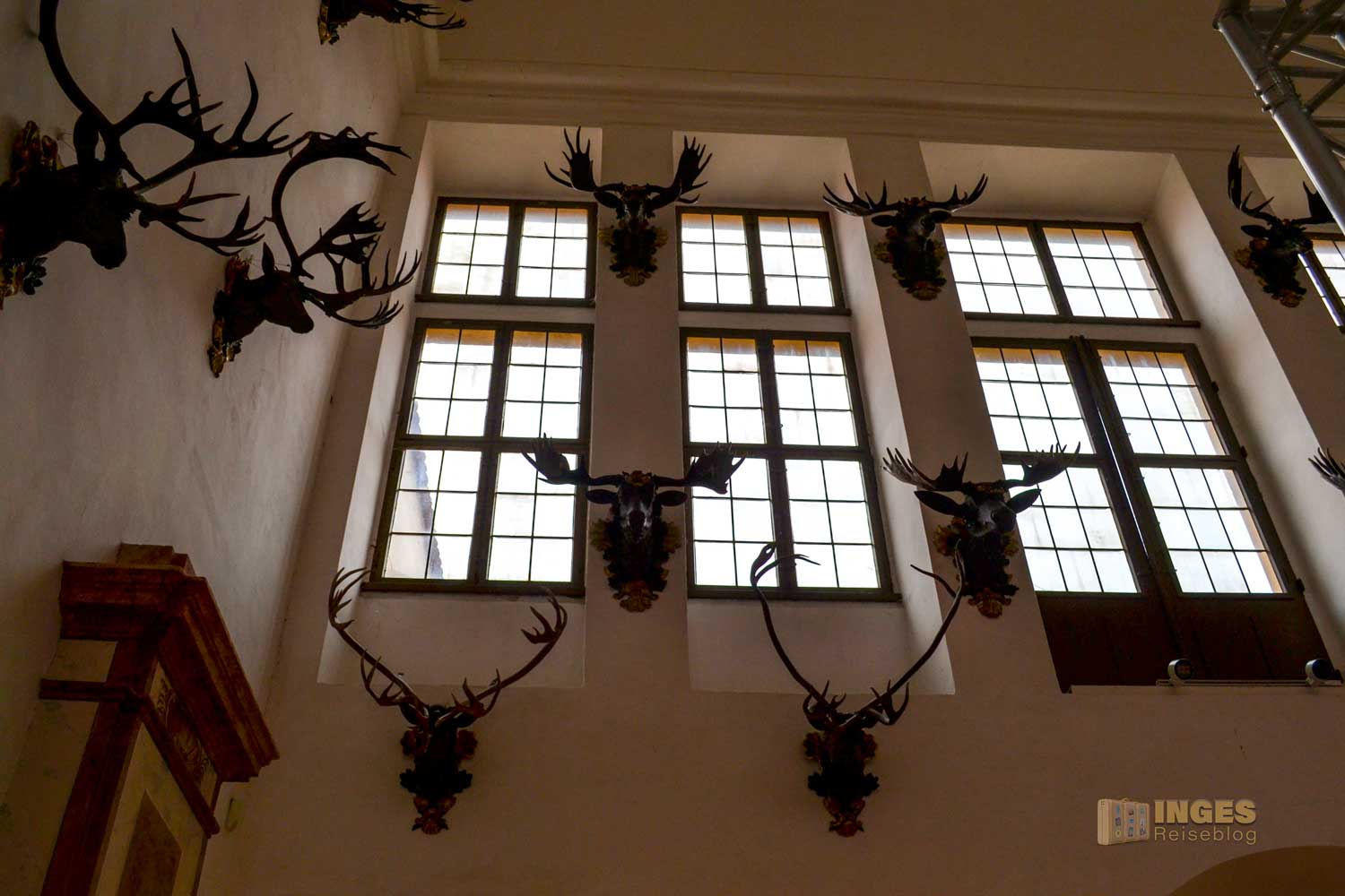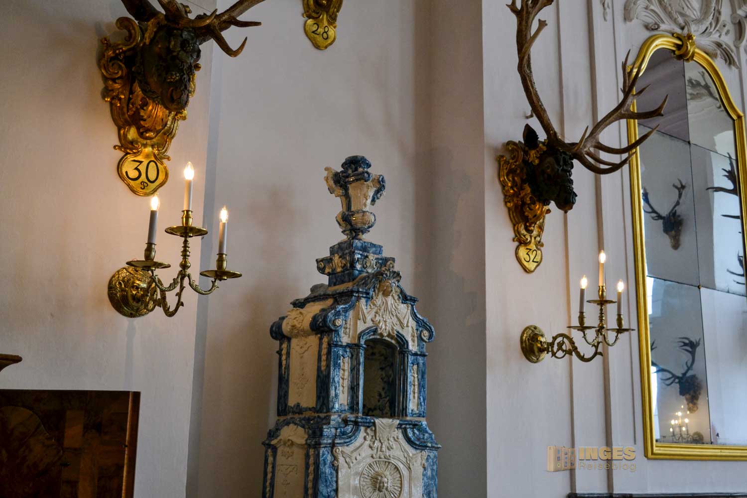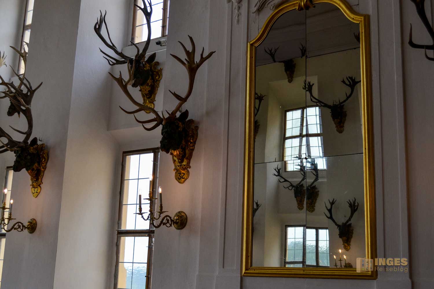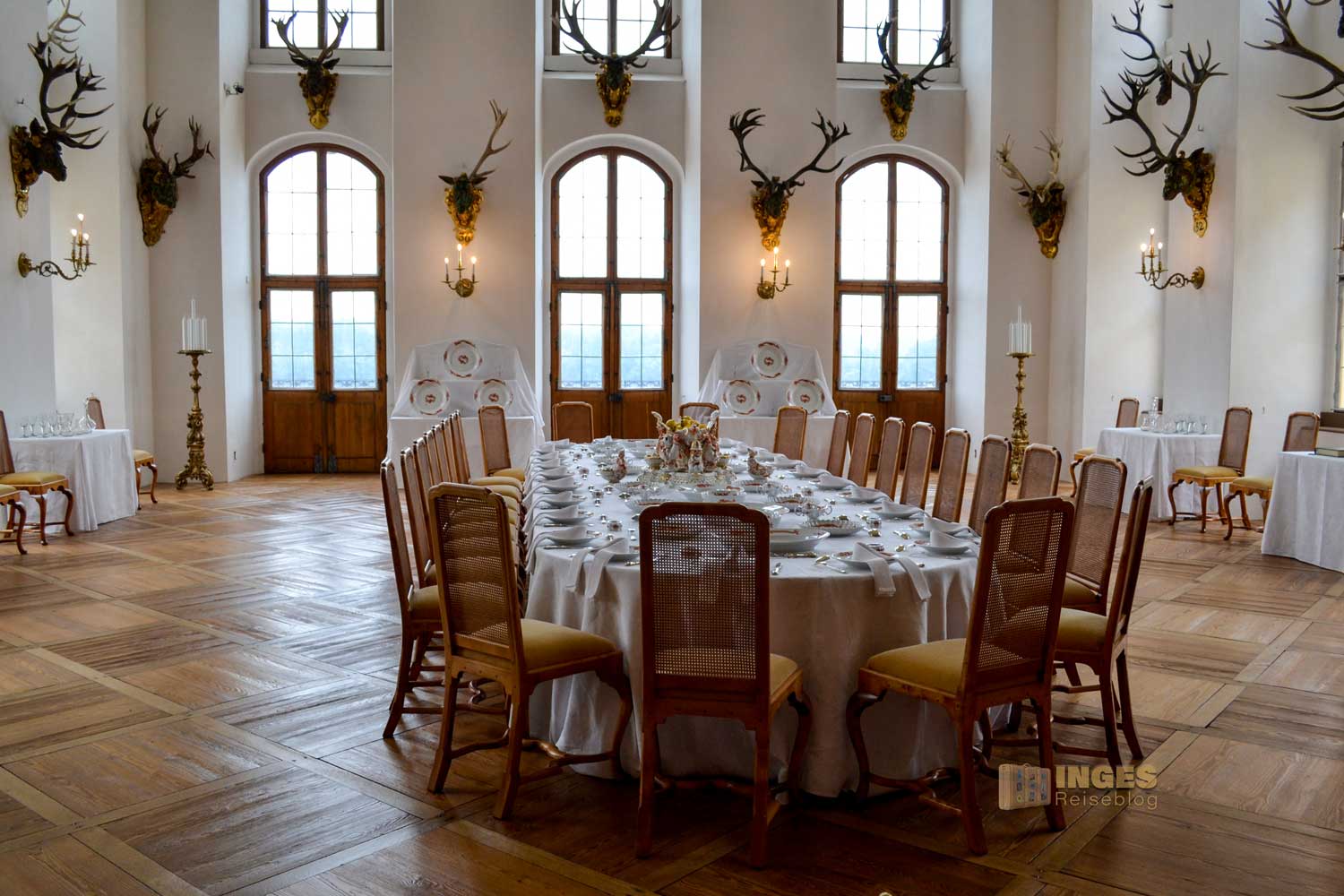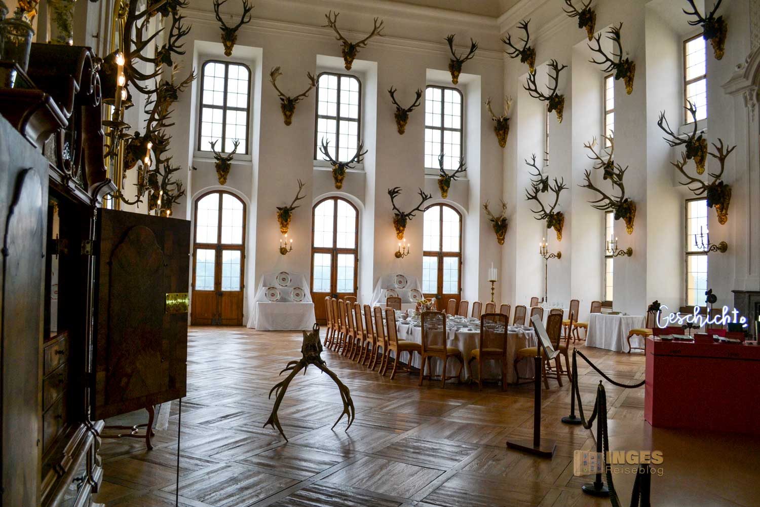 Er wurde im Ostflügel als Pendant zur Schlosskapelle geschaffen und diente der Hofgesellschaft als Fest- und Speisesaal. Die Wände geschmückt mit einer, einem Jagdschloss passenden Dekoration, Geweihe. Und wenn ihr selbst im Schloss seid, dann haltet Ausschau nach dem weltweit stärksten Rothirschgeweihs, sowie der zweitstärksten Rothirschtrophäe der Welt. Beides findet ihr im Speisesaal.