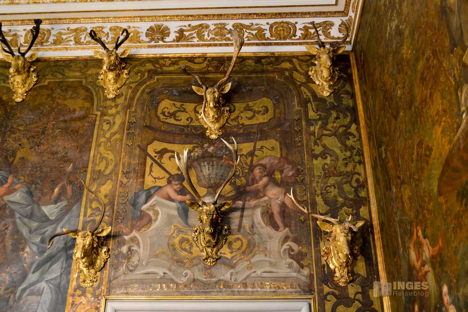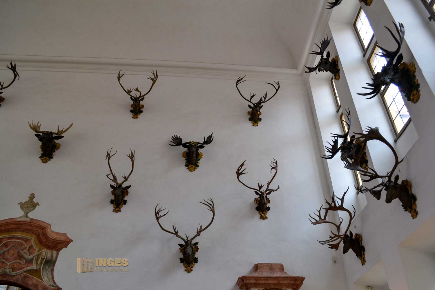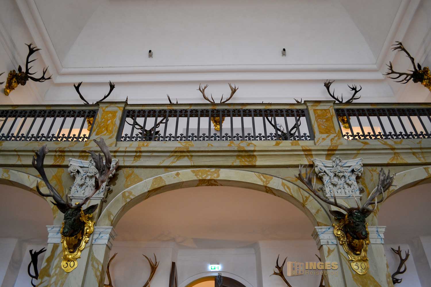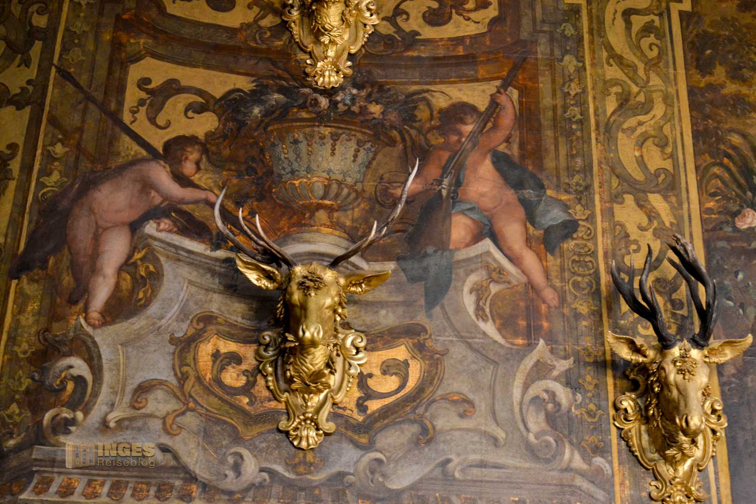 Er wurde im Ostflügel als Pendant zur Schlosskapelle geschaffen und diente der Hofgesellschaft als Fest- und Speisesaal. Die Wände geschmückt mit einer, einem Jagdschloss passenden Dekoration, Geweihe. Und wenn ihr selbst im Schloss seid, dann haltet Ausschau nach dem weltweit stärksten Rothirschgeweihs, sowie der zweitstärksten Rothirschtrophäe der Welt. Beides findet ihr im Speisesaal.