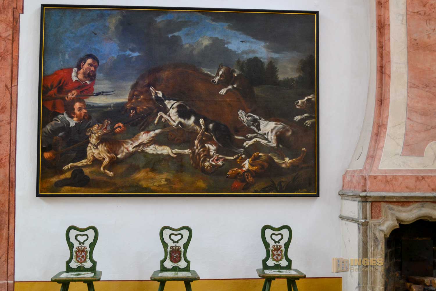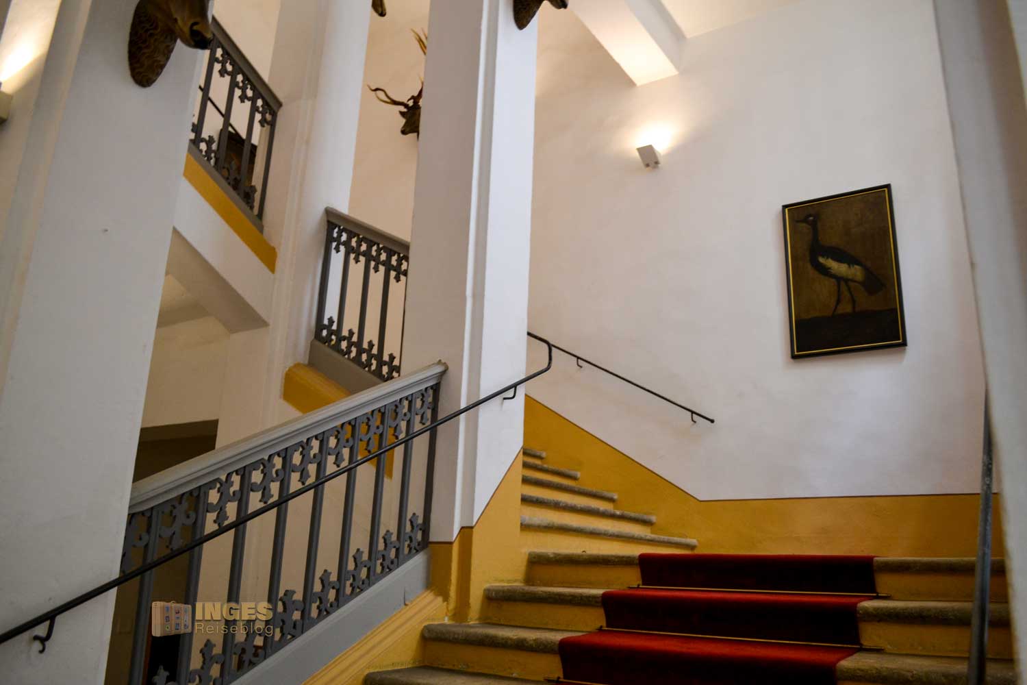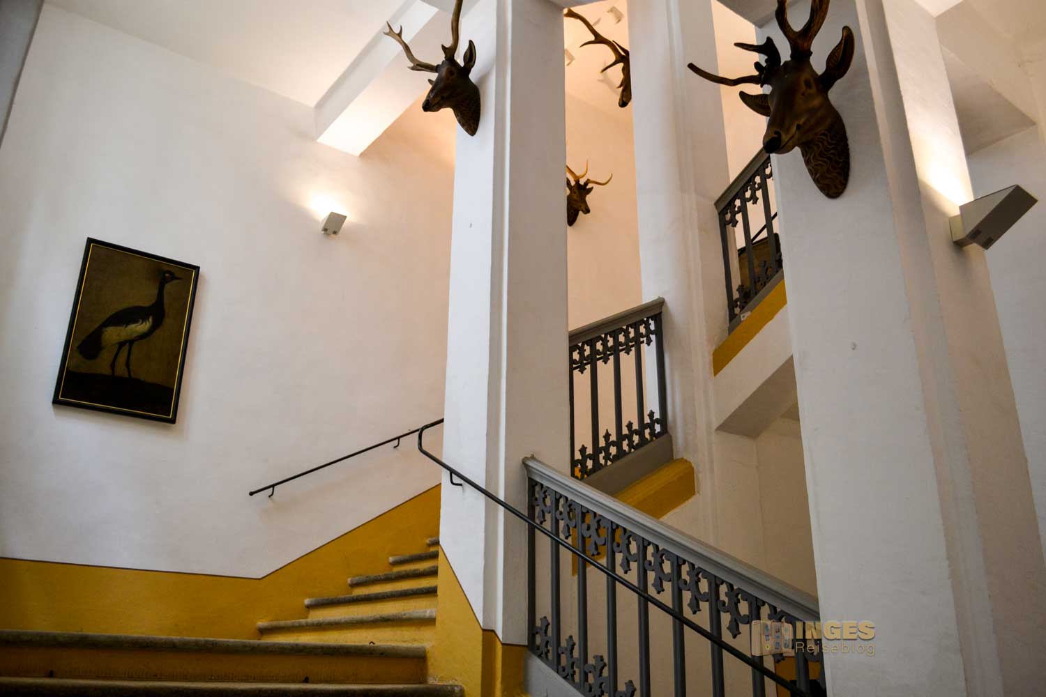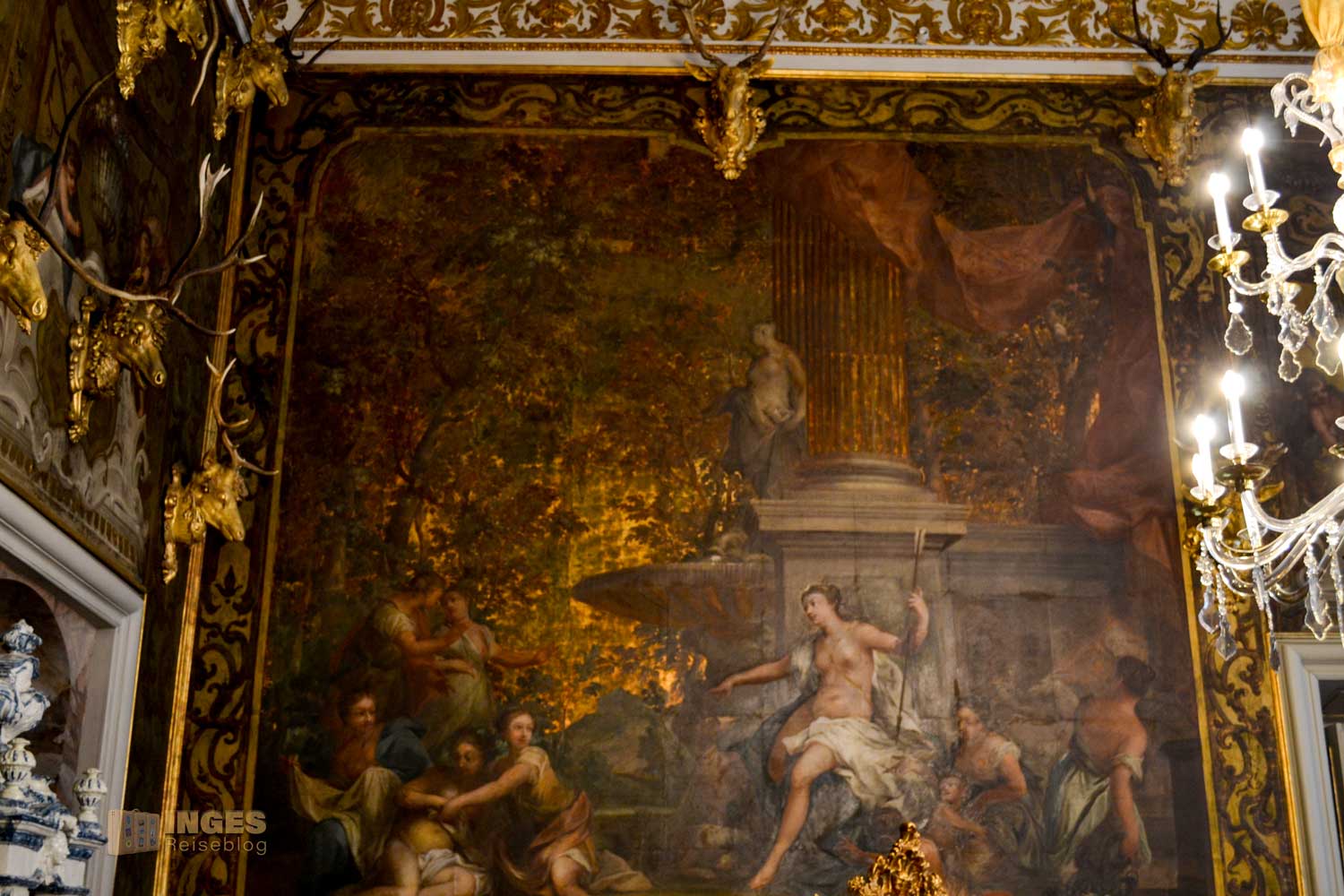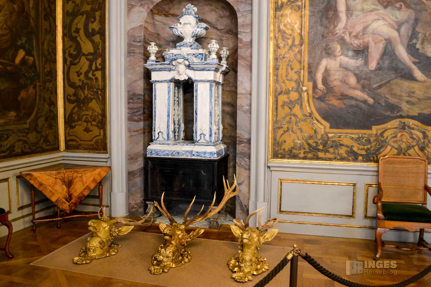 Er wurde im Ostflügel als Pendant zur Schlosskapelle geschaffen und diente der Hofgesellschaft als Fest- und Speisesaal. Die Wände geschmückt mit einer, einem Jagdschloss passenden Dekoration, Geweihe. Und wenn ihr selbst im Schloss seid, dann haltet Ausschau nach dem weltweit stärksten Rothirschgeweihs, sowie der zweitstärksten Rothirschtrophäe der Welt. Beides findet ihr im Speisesaal.