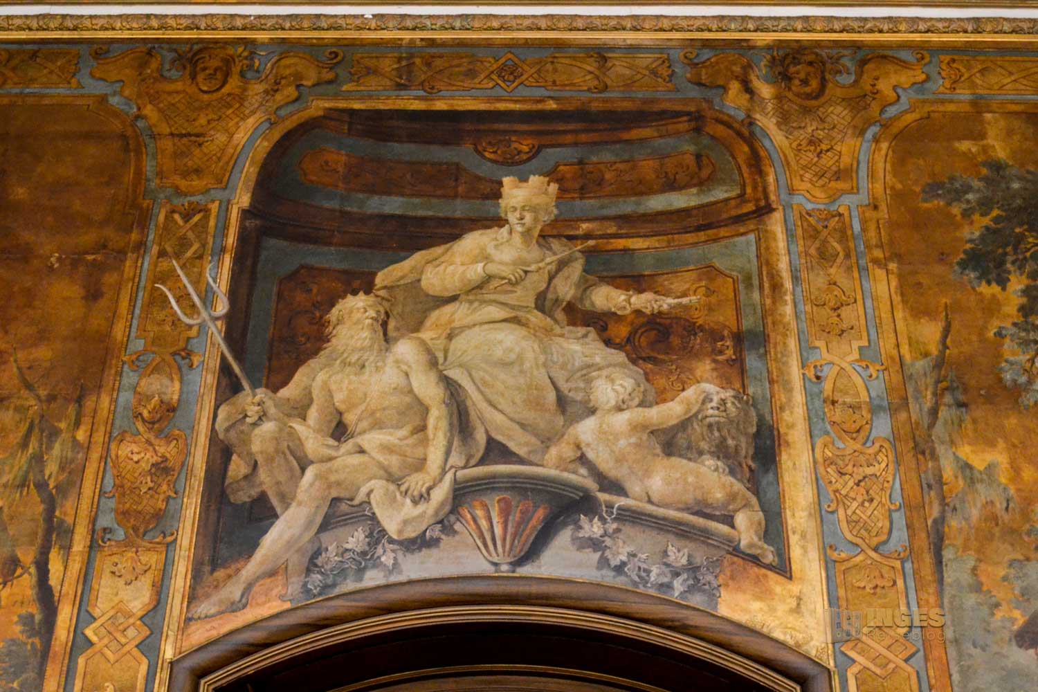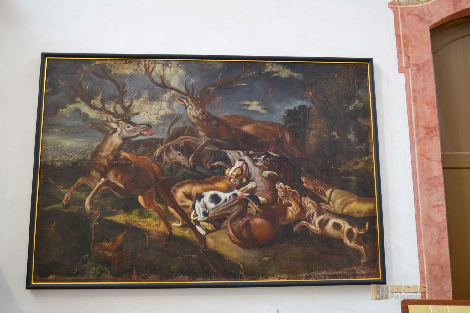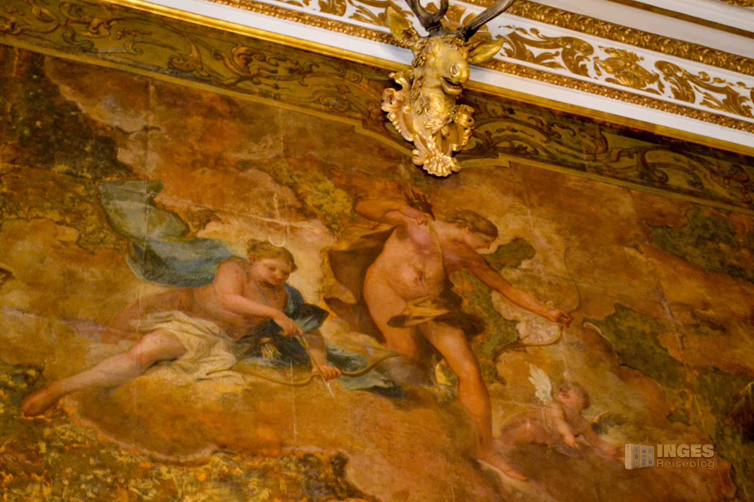 Über neun Meter ist der Raum hoch und ringsum mit wandhohen Ledertapeten, die Bemalungen haben, bespannt. Diana, die Göttin der Jagd, steht auf den Darstellungen im Mittelpunkt. Seinen Namen hat der Saal von den 'monströsen' Rothirschgeweihen, die auf vergoldeten Hirschköpfen präsentiert werden.