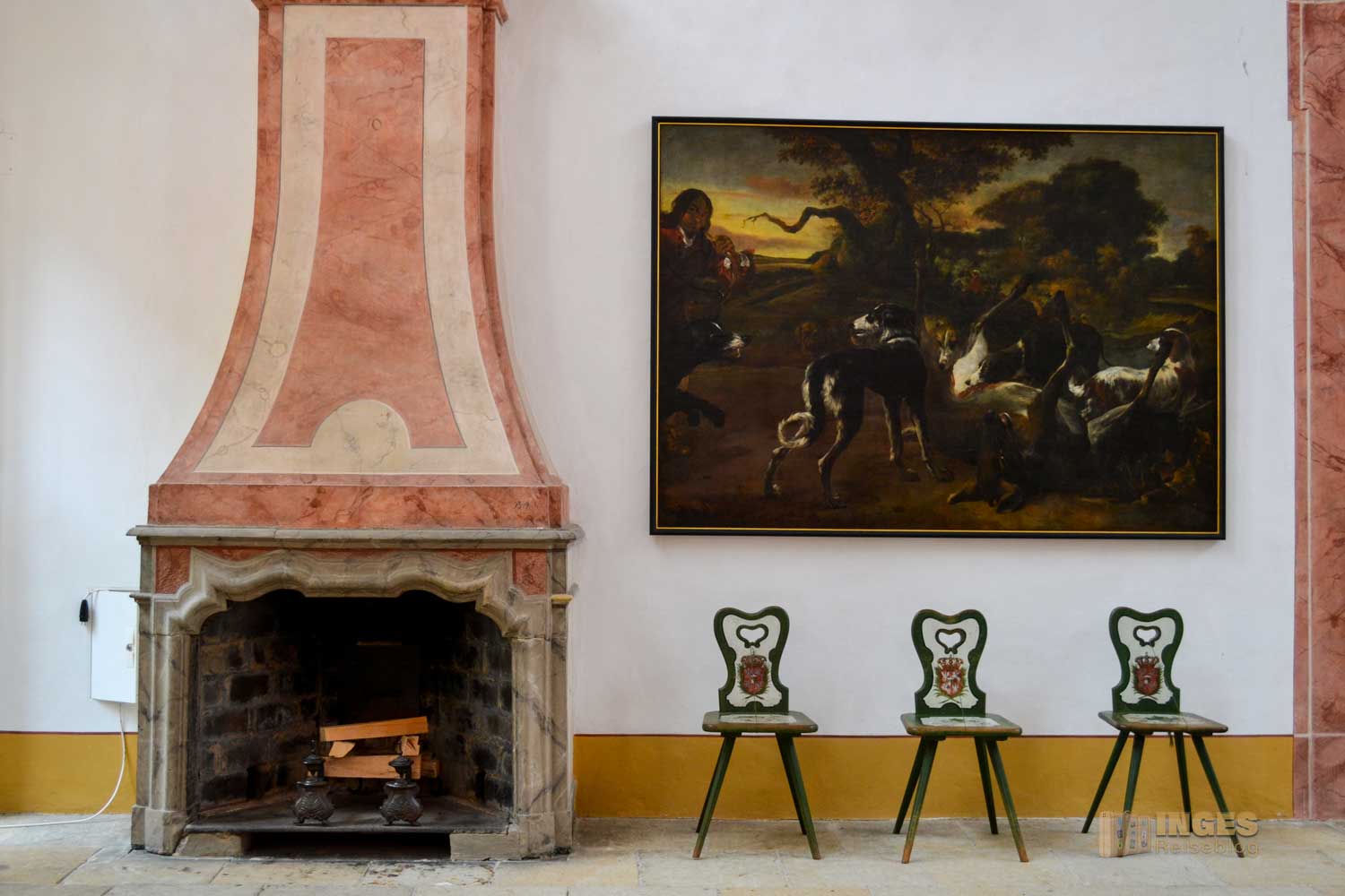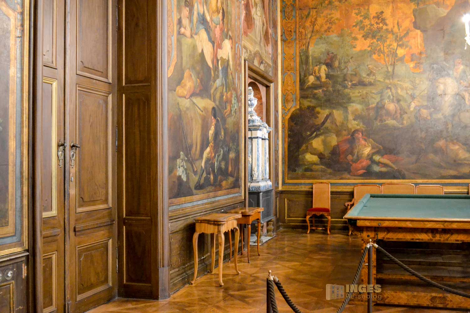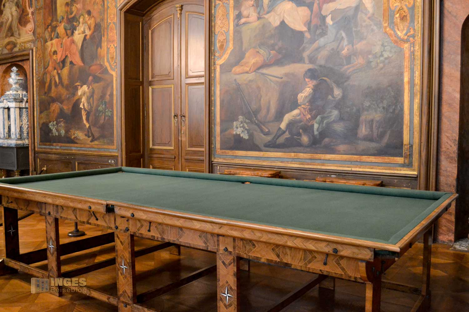 Einer der ältesten weltweit erhaltenen Billardtische steht in dem Raum, der früher auch als Speisesaal genutzt wurde. Die bemalten Ledertapeten zeigen Szenen von der Jagd und Fischerei.