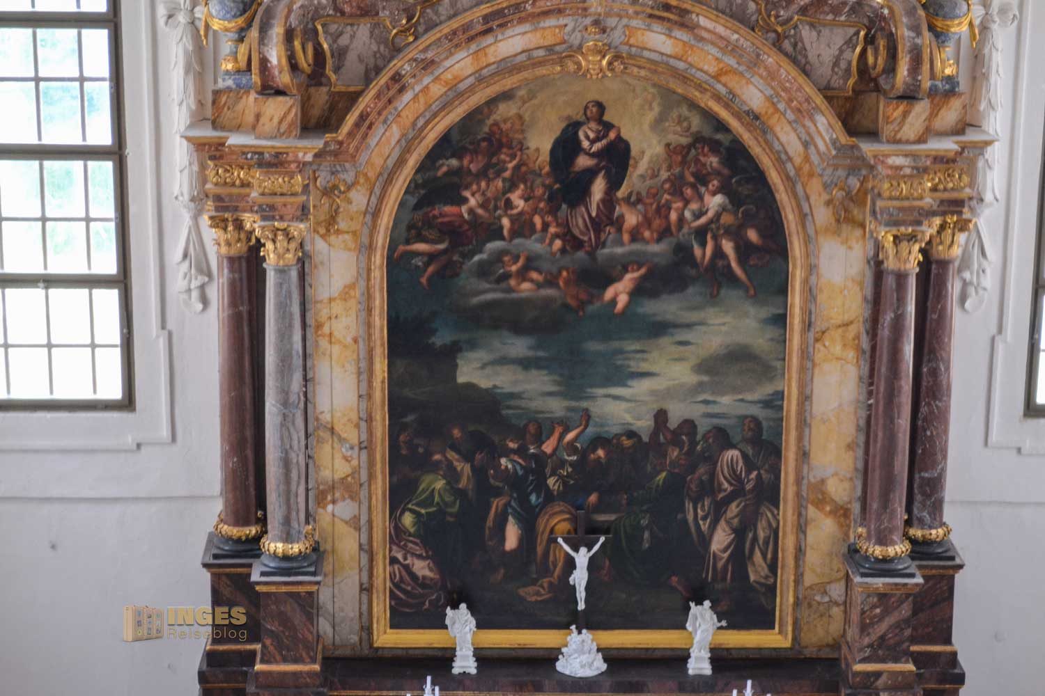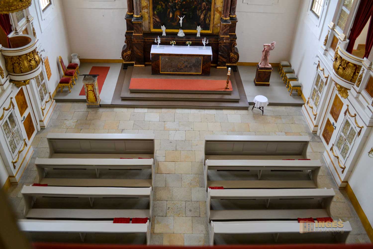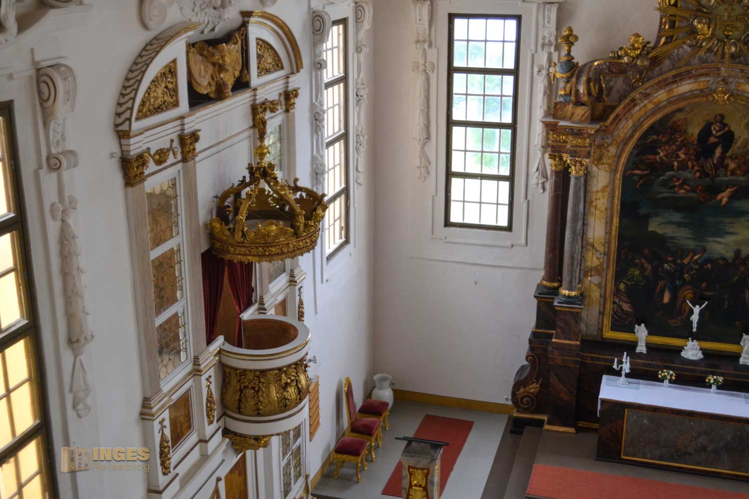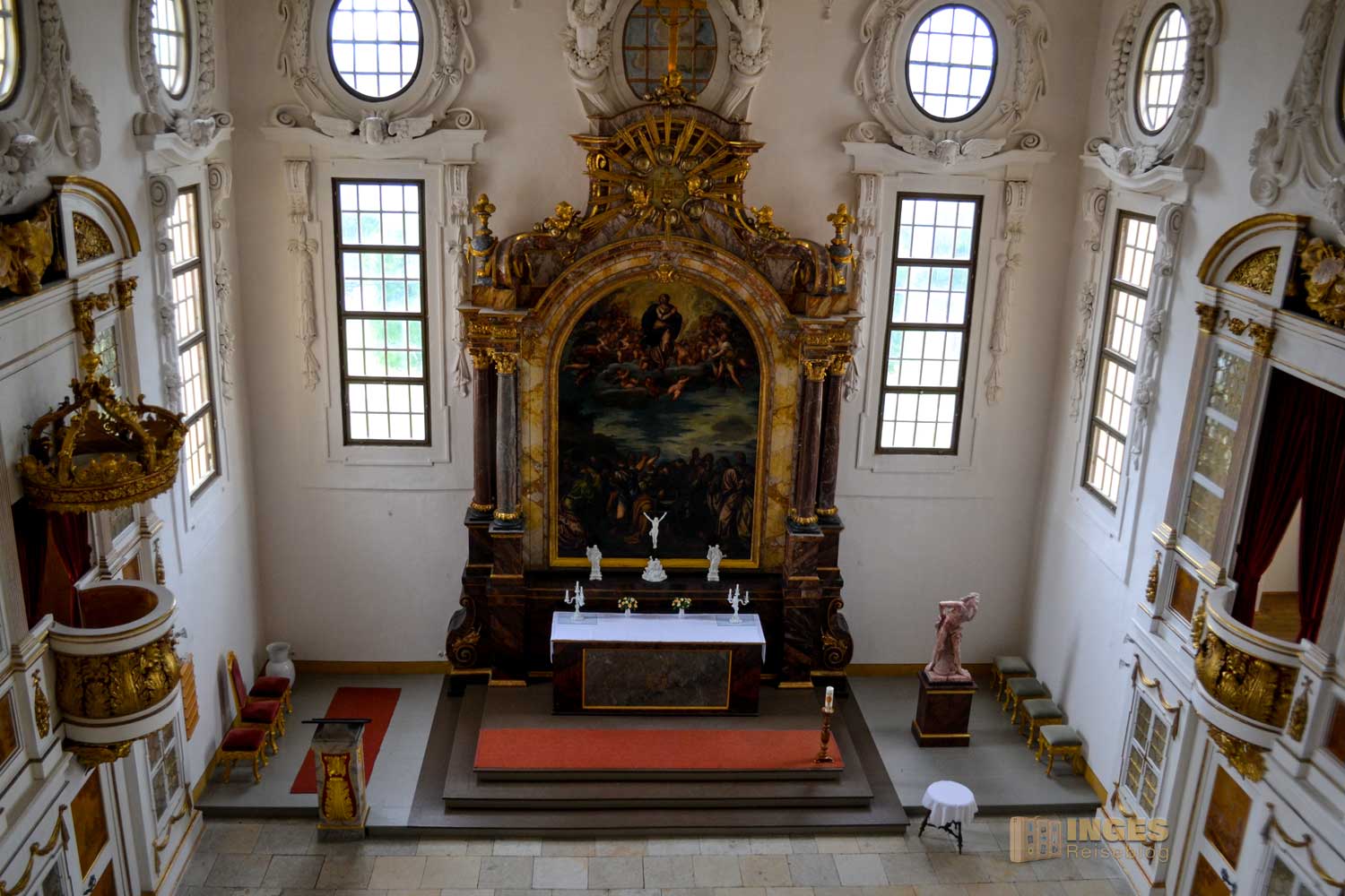 Zwischen 1661 uns 1672 wurde sie in einen Seitenflügel des Schlosses eingegliedert. Die rechts und links befindlichen Emporen sind die Kanzelempore und der Heerespaukenstand. Hier haben die Musiker der Hofkapelle die Gottesdienste begleitet. 1746 wurde das ursprüngliche Altarbild durch ein Gemälde ersetzt, das die Himmelfahrt Mariens darstellt.