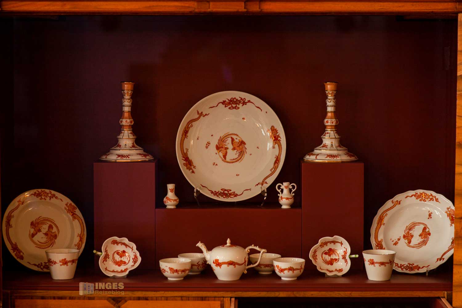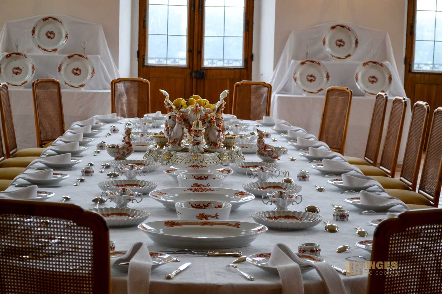 Die Speisetafel ist mit Meißner Porzellan eingedeckt, welches mit dem Muster "Roter Drache" alleinig dem Königshof vorbehalten war.
