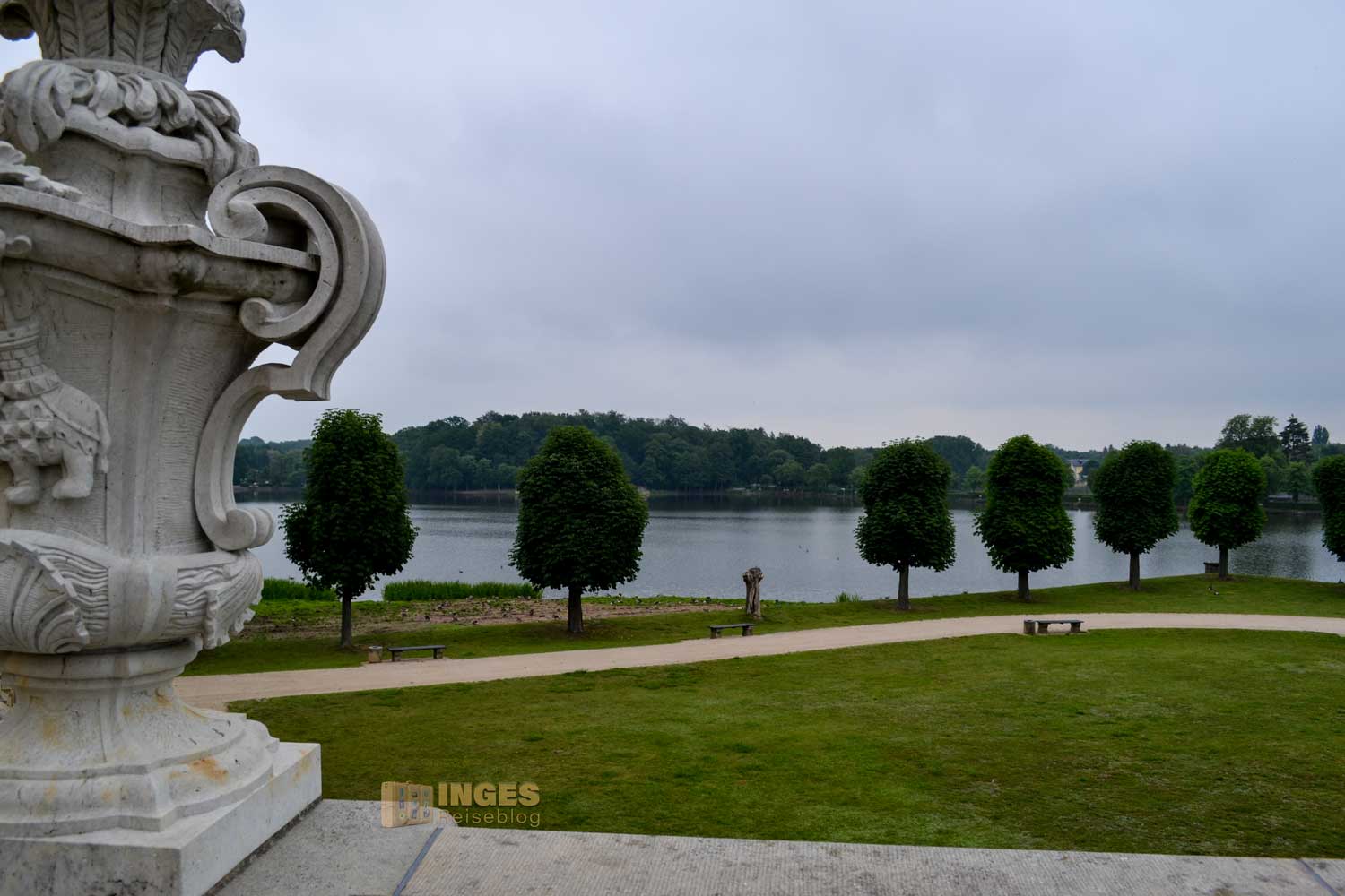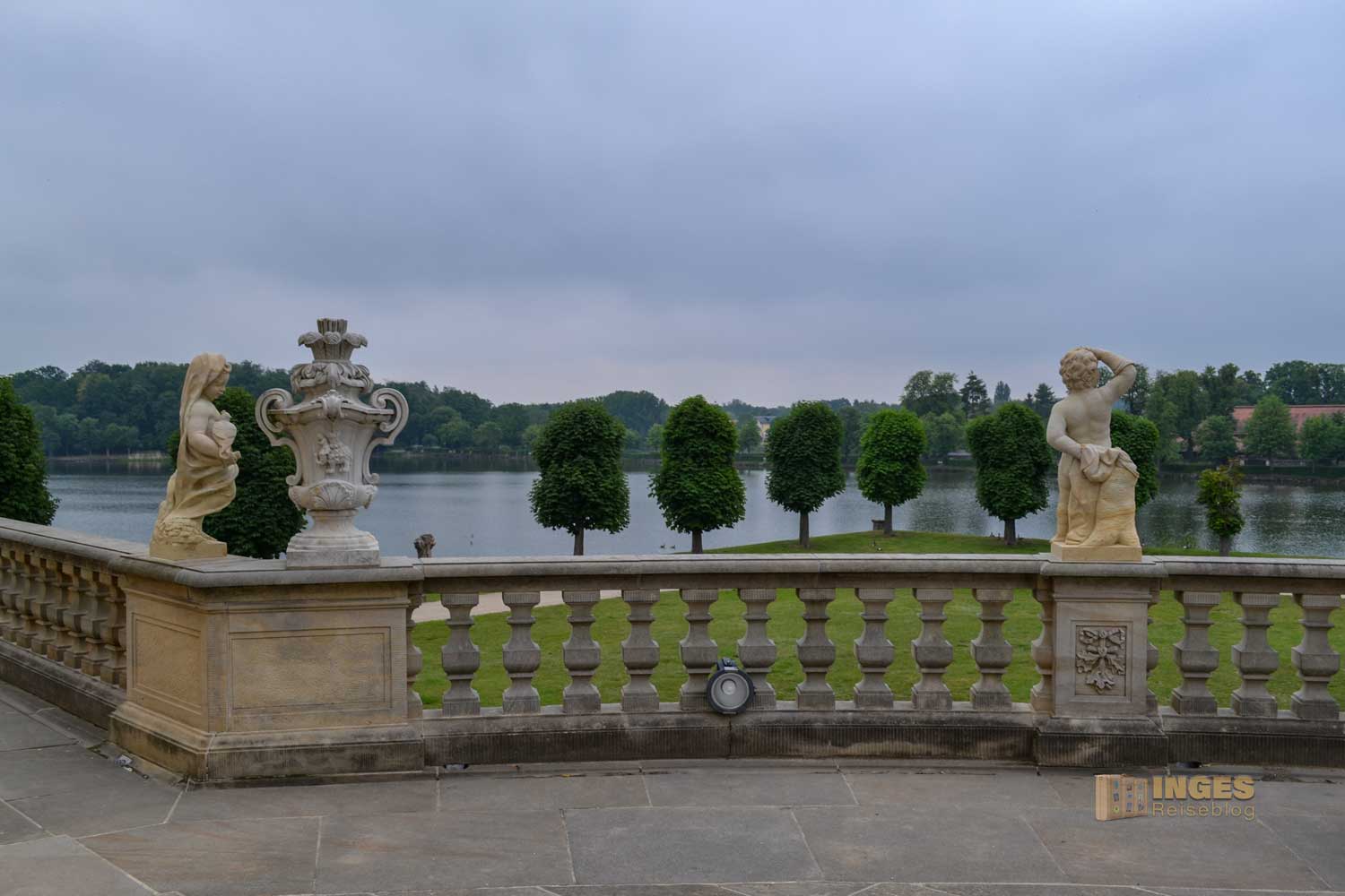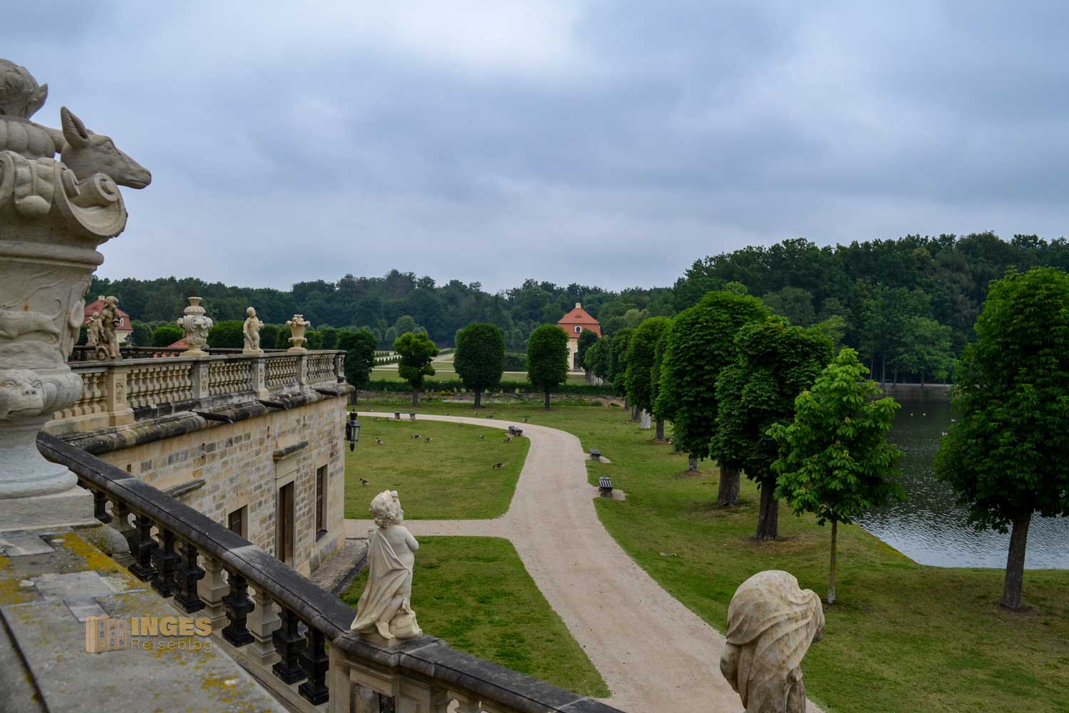 Ich musste den Anblick des Barockschlosses erstmal auf mich wirken lassen. So etwas Schönes wurde von Menschenhand geschaffen und liegt doch wie natürlich in einer Landschaft zwischen Wäldern und Teichen. Auf einer künstlichen Inselerhebung liegt der barocke Vierflügelbau mit seinen markanten Türmen, die jeden Flügel miteinander verbinden. Acht Wachhäuschen sind unten auf der Insel rings um das Schloss angeordnet.
