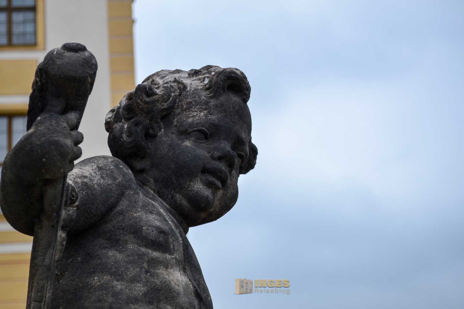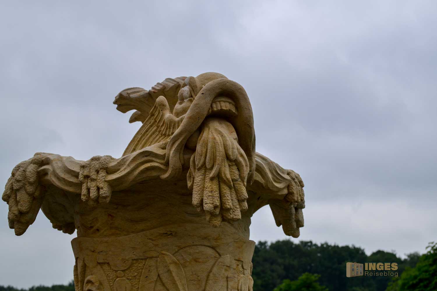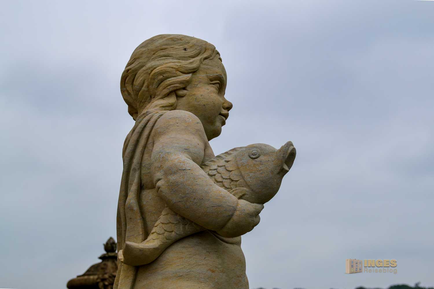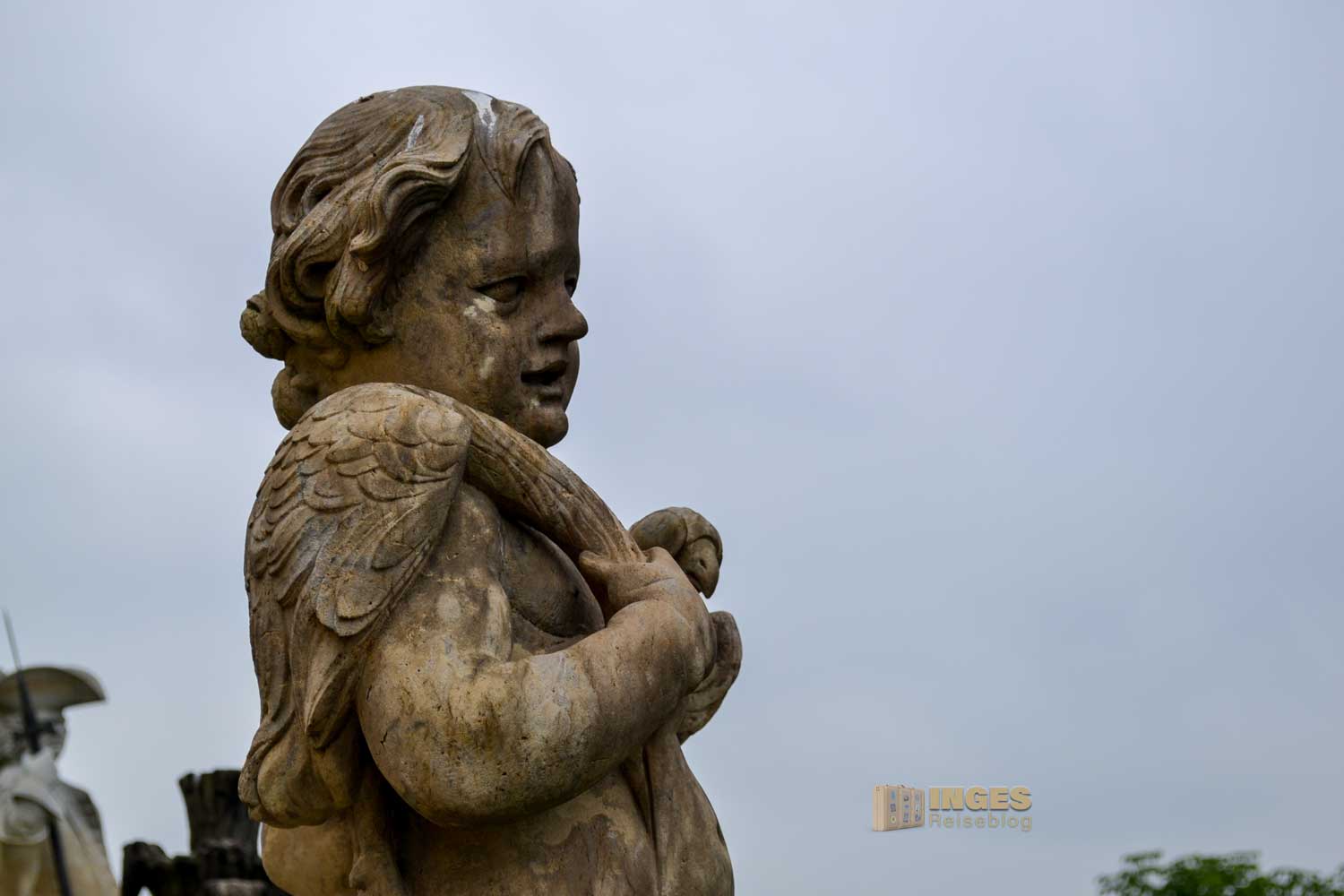 Überall auf den Balustraden der Terrasse stehen sie - die lieblichen Kinderfiguren, die ich am liebsten allesamt fotografiert hätte, die Jägerfiguren und die Vasen. Ich war fasziniert, wie ausdrucksvoll die Gesichtchen sind ... seht selber. Nicht verwunderlich, dass mir hier mein Mann immer ein Stück voraus war 🙂