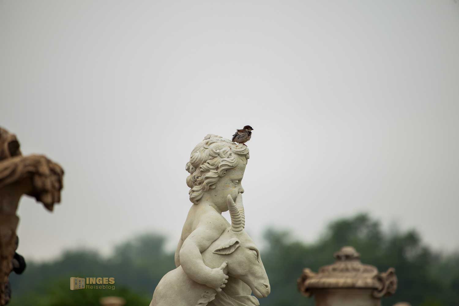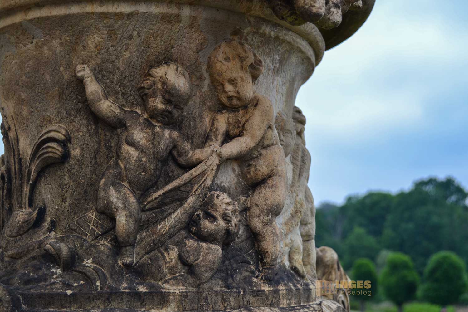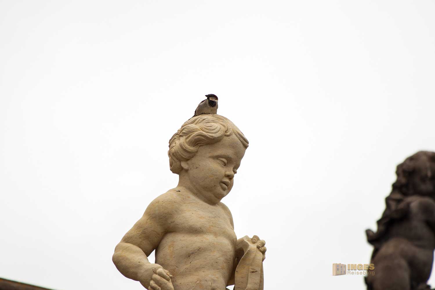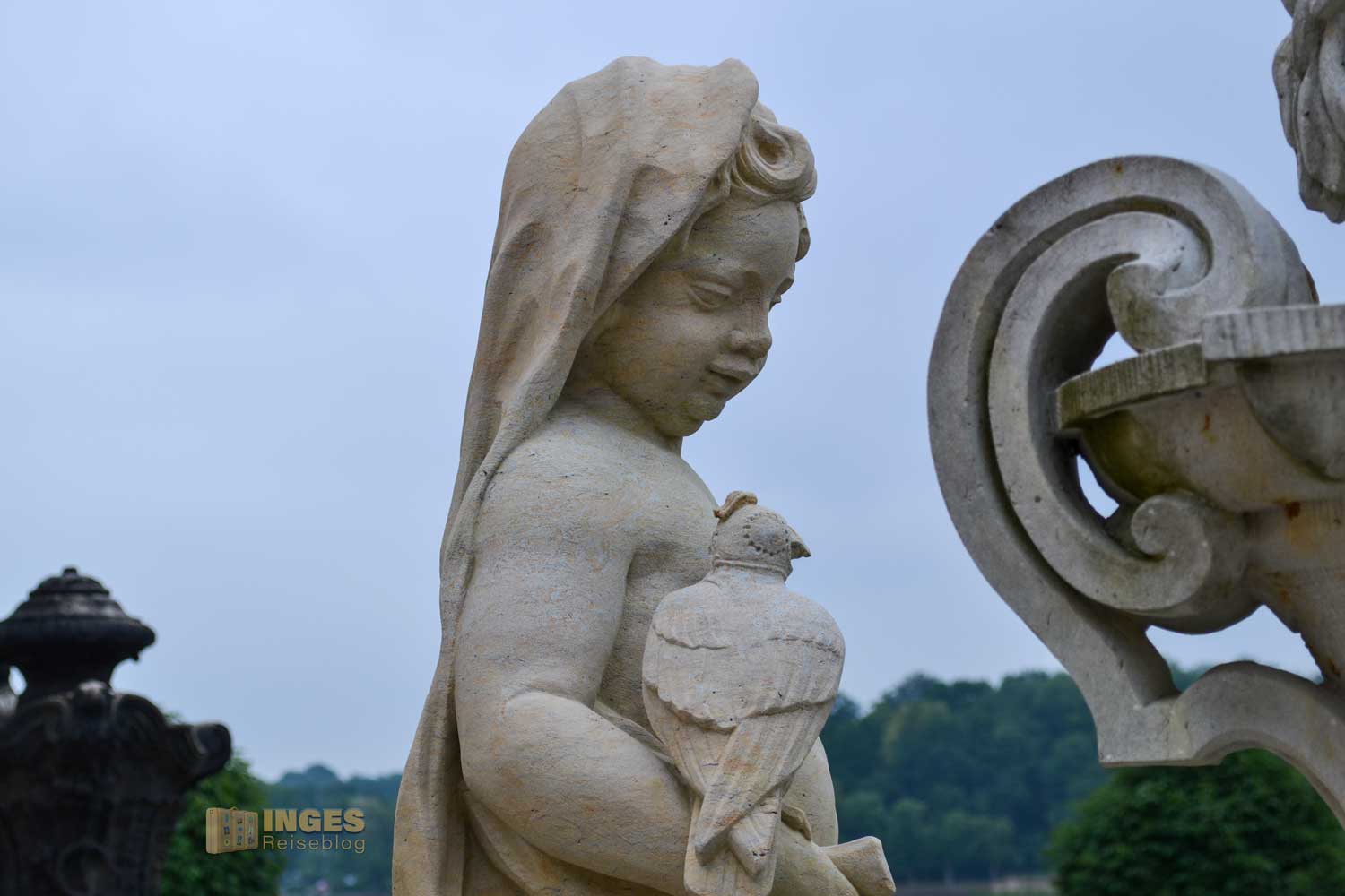 Überall auf den Balustraden der Terrasse stehen sie - die lieblichen Kinderfiguren, die ich am liebsten allesamt fotografiert hätte, die Jägerfiguren und die Vasen. Ich war fasziniert, wie ausdrucksvoll die Gesichtchen sind ... seht selber. Nicht verwunderlich, dass mir hier mein Mann immer ein Stück voraus war 🙂