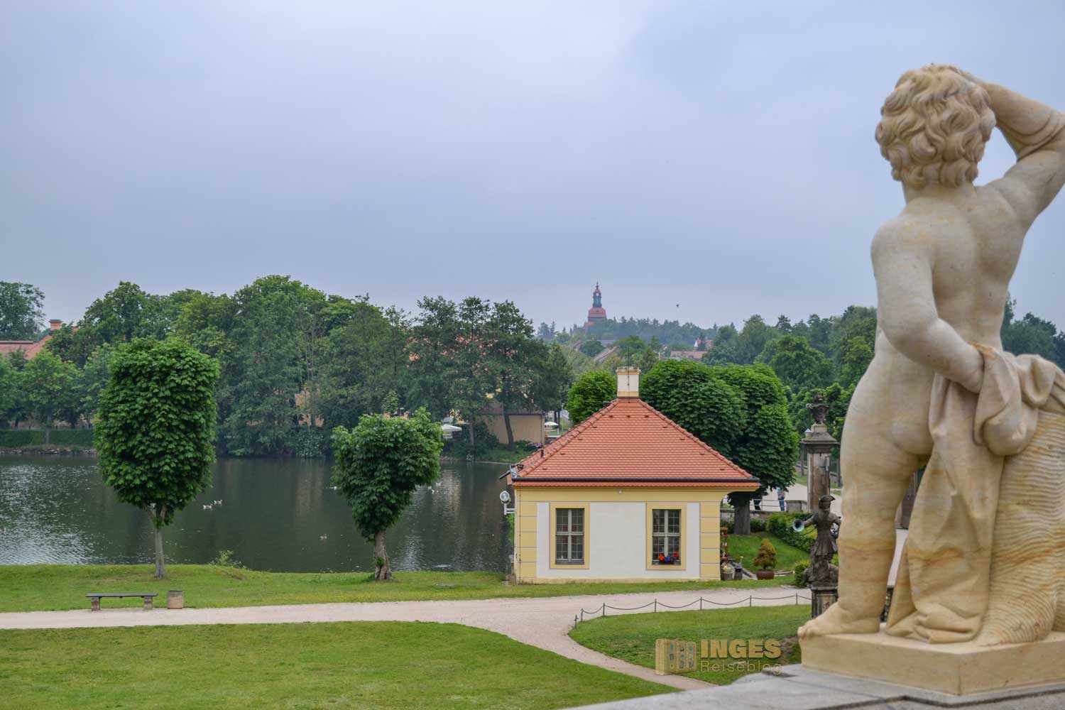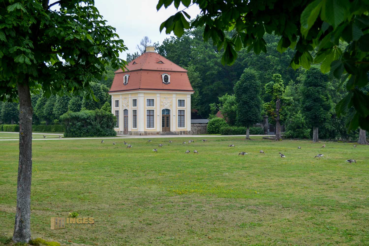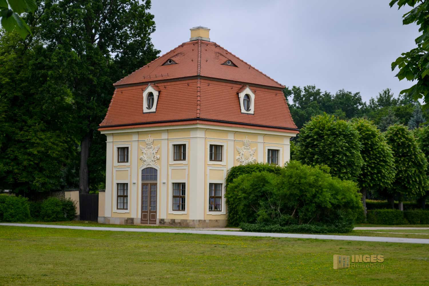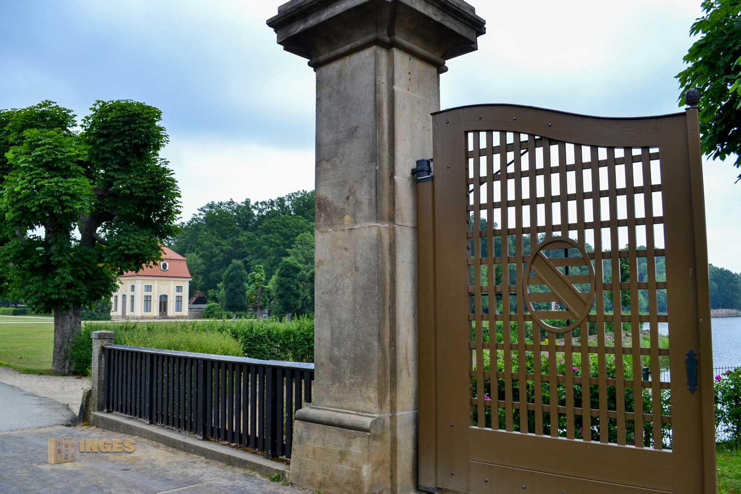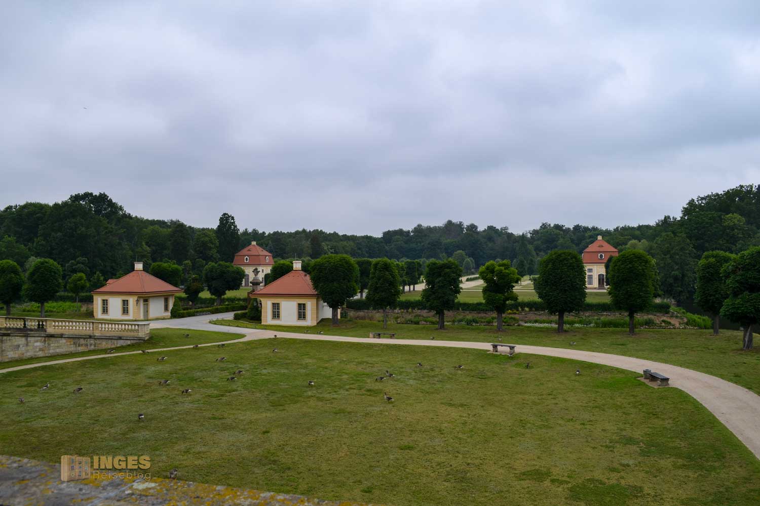 Eine kleine Brücke verbindet die Schlossinsel mit dem nach Norden, nach strengem geometrischen Plan, angelegten Park. Der Garten setzt die Nord-Süd Achse fort - von Dresden her kommend. 1728 wurde mit der Gestaltung des Barockgartens begonnen, der, als 1733 August der Starke verstarb noch nicht fertig war und in seiner Planung auch nicht fertiggestellt wurde.