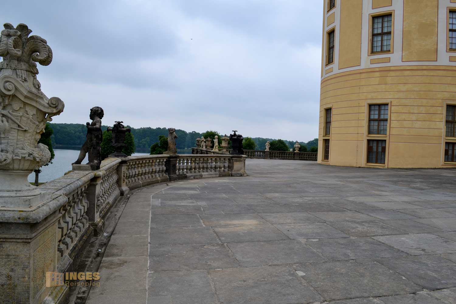 Ringsum um das Schloss geht die Terrassenanlage, zu den Seiten mit je zwei geschwungenen Treppen hinab in den Park. Es ist kein Wunder mit dieser herrlichen Kulisse, dass das Schloss Moritzburg 1973 für die Außenszenen für den bekannten Märchenfilm "Drei Haselnüsse für Aschenbrödel" ausgewählt wurde.