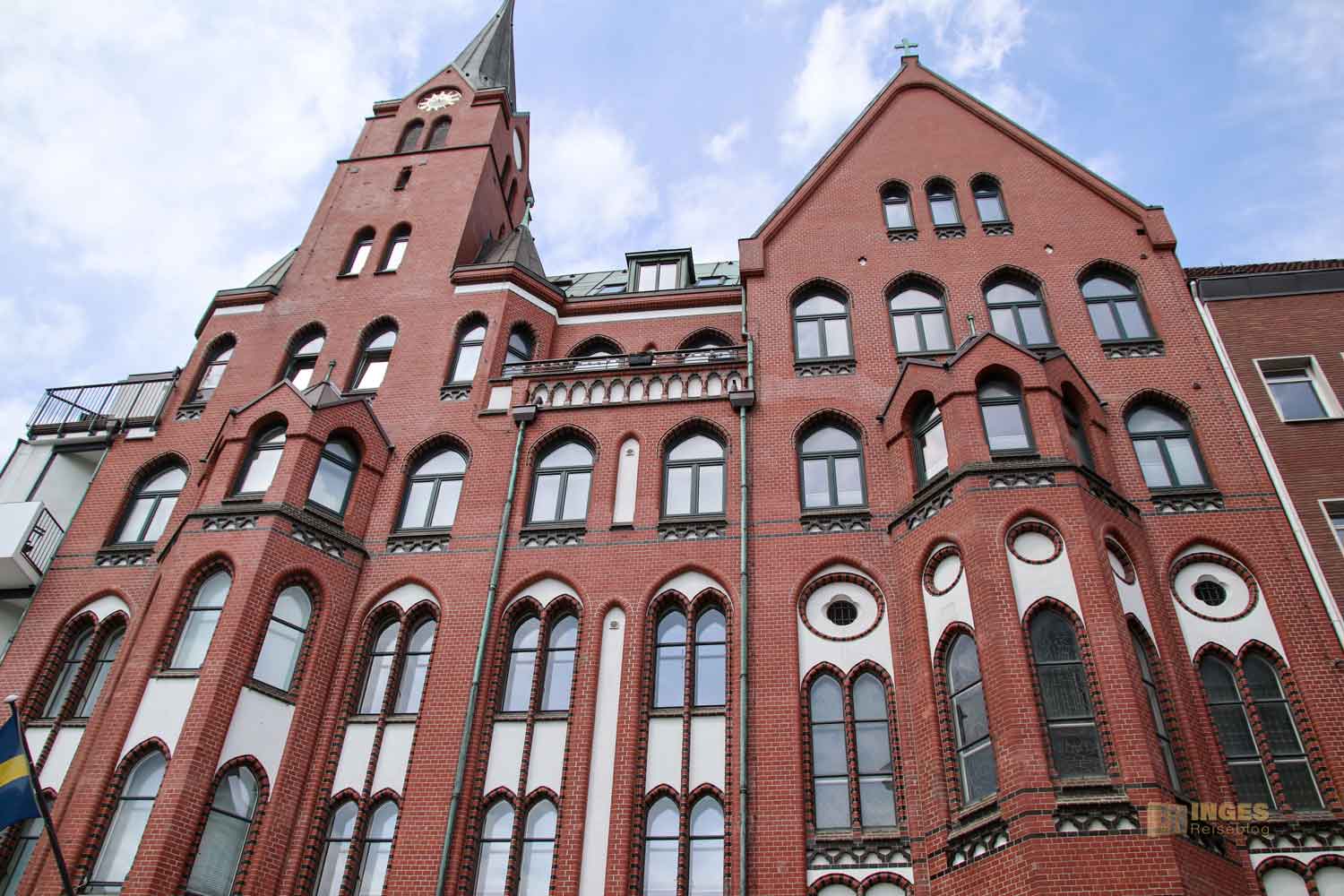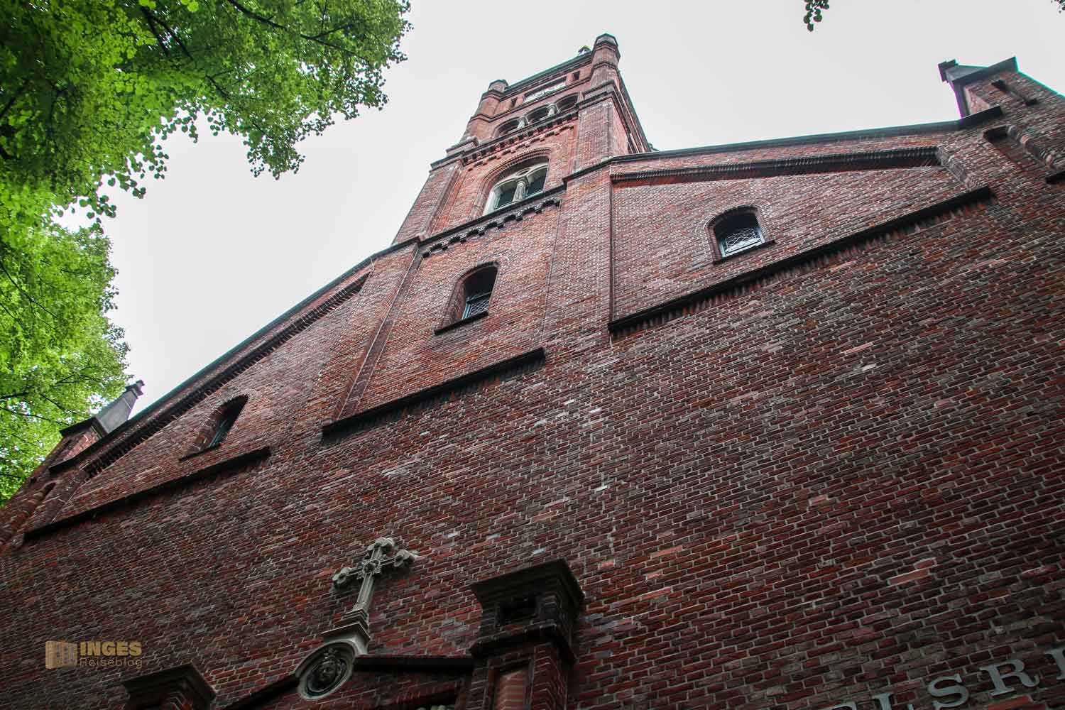 Dass im Norden die Klinkerbauweise überreichlich zu finden ist, habe ich ja schon bei der St. Pauli Kirche gemerkt. Das 1907 erbaute, denkmalgeschützte Backsteingebäude ist schon ein Hingucker, sieht aber in keinster Weise nach einer Kirche aus. Sie soll auch im Inneren ein wahres Schätzchen sein, mit ihren wertvollen Malereien und Schnitzereien. Ihr merkt schon an meiner Wortwahl "Soll", denn gesehen haben wir sie nur von außen. Unser Los "geschlossen" hat wieder voll zugeschlagen.