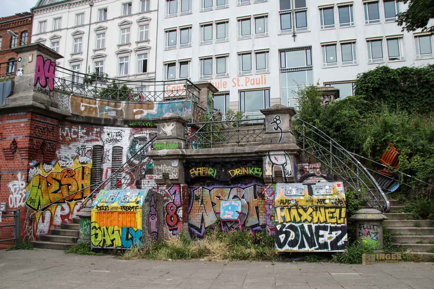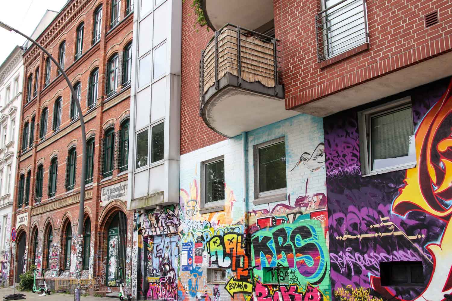Noch bevor es viele Treppen hinunter ging, kann man von oben einen Blick auf Hamburgs HafenCity werfen. Der Antonipark in der Nähe der Kirche bietet sich für diesen Blick perfekt an. Ein kleiner öffentlicher Park inmitten von vielen Wohngebäuden. Zwischen den Landungsbrücken und der Reeperbahn befinden sich die Häuser, die in den 80iger Jahren für Schlagzeilen gesorgt haben. Denn in Baugutachten wurde den so um 1900 gebauten Häusern teilweise eine Unbewohnbarkeit attestiert. Niemals, dachten sich wohl einige, denn ab Ende 1981 wurden die Häuser nach und nach besetzt, was natürlich für Ärger mit dem Eigentümer, einer Wohnungsgesellschaft, führte. Es ging die Folgejahre nicht positiv hin und her, die Wohnungen sollten von den Besetzern geräumt werden. Schlussendlich gipfelte es 1986 in einem Großeinsatz der Polizei und zu einer Großdemonstration mit so locker mal 12.000 Protestierenden.