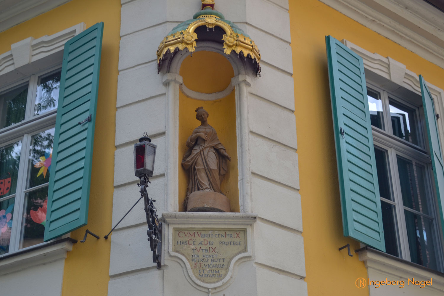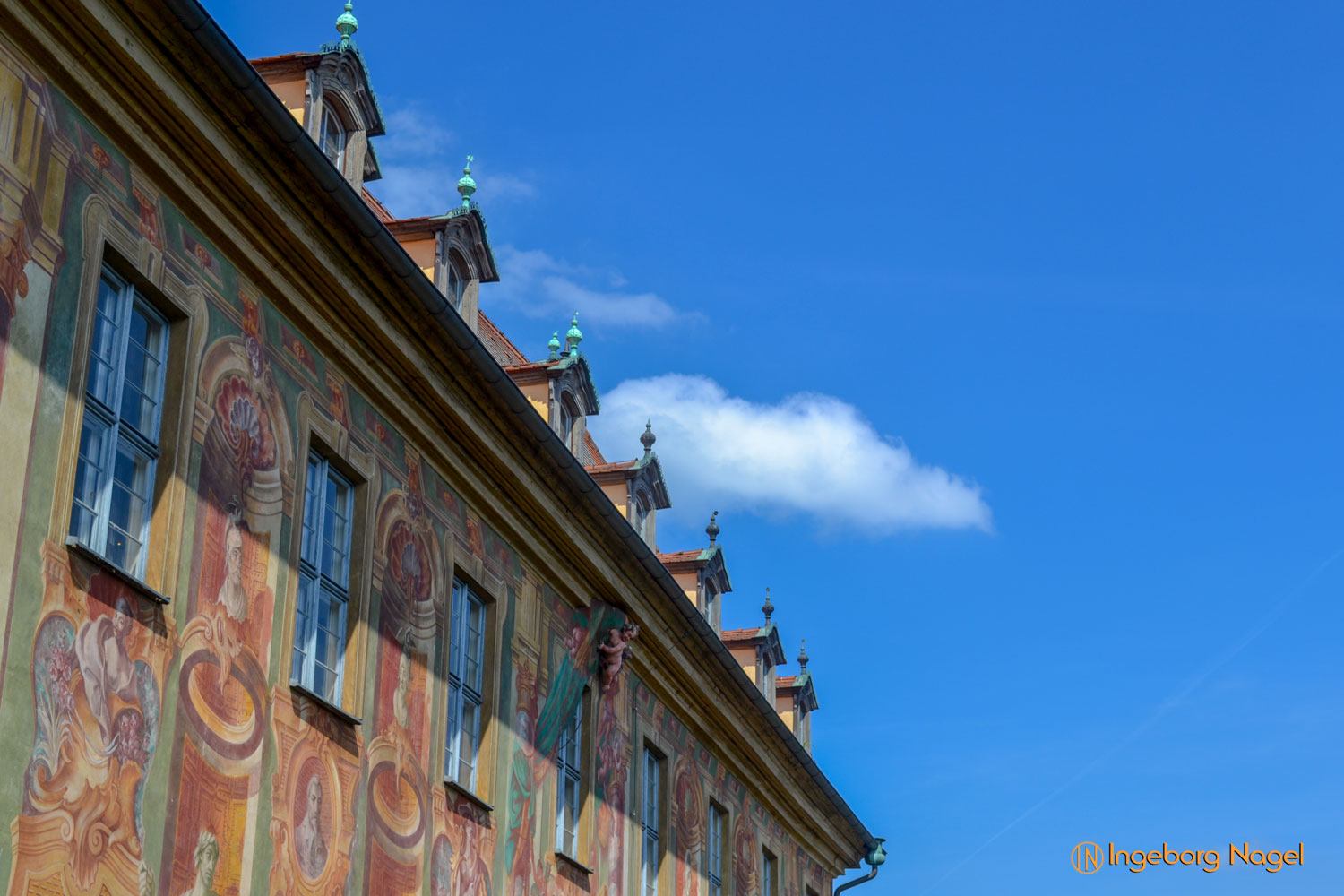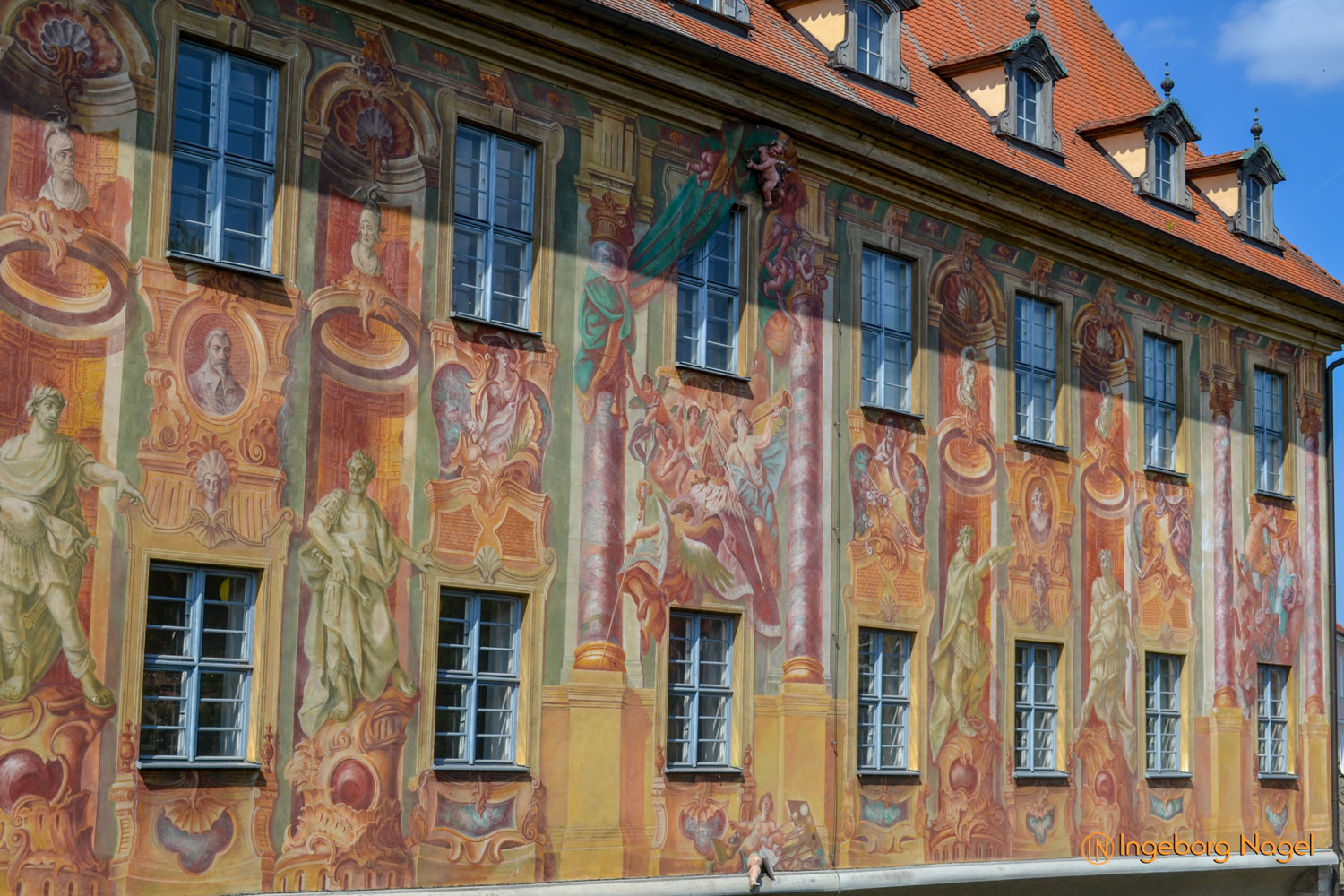 Vorbei am Maximiliansplatz und mitten hinein ins Gewühl des Wochenmarktes am Grünen Markt. Da ich meine Fotos immer ohne 'schmückendes Beiwerk', sprich Menschen bevorzuge (die DSGVO immer im Genick) gibt es aus diesem Bereich der Altstadt keine Fotos. Und so war das erste Ziel das alte Rathaus, das vor allem durch seine Fresken, die die Fassade des Baus schmücken beeindrucken. Schaut mal auf den Fotos, ob euch etwas auffällt? Durch die Scheinarchitektur wird dieser Fassade Plastizität verliehen - das Bein einer Putte ragt als Skulptur aus den Wandfresken.