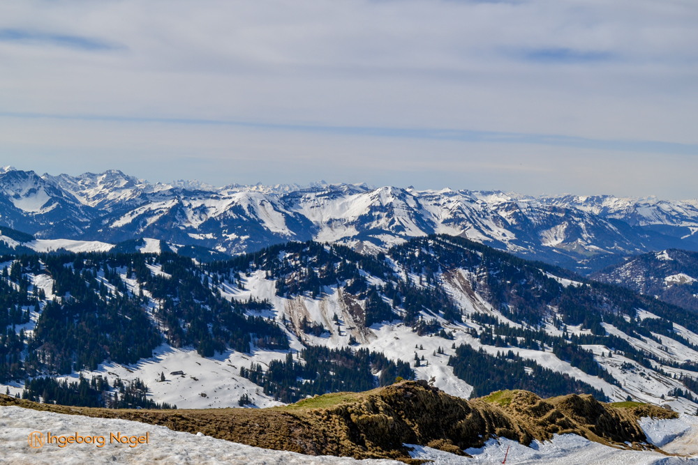 auf den Hochgrat, mit seinen 1.834 Metern der höchste Berg in den Allgäuer Alpen. Wir hatten traumhaftes Wetter und im Überschwang der Gefühle, wollte ich an den Erfolg im Eistobel anknüpfen - der Weg zum Gipfelkreuz schien ganz einfach. Schien! Ganz langsam ging es nach oben, aber auf halbem Weg war es dann vorbei. Nicht wegen der Kondition, welcher Kondition? 🙂 sondern weil ich merkte, dass ich nicht mehr schwindelfrei bin. Trotzdem sehr stolz es überhaupt gewagt zu haben, ging es wieder nach unten und wir genossen noch einige Zeit die Sonne und das herrliche Panorama, bis uns die Gondel wieder nach unten brachte.