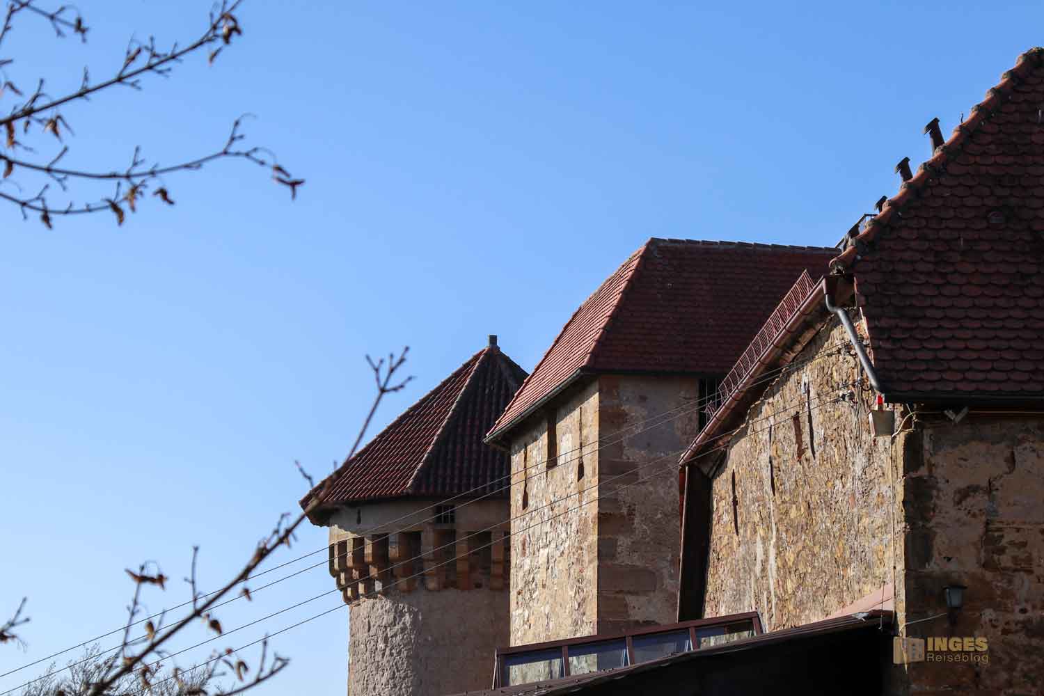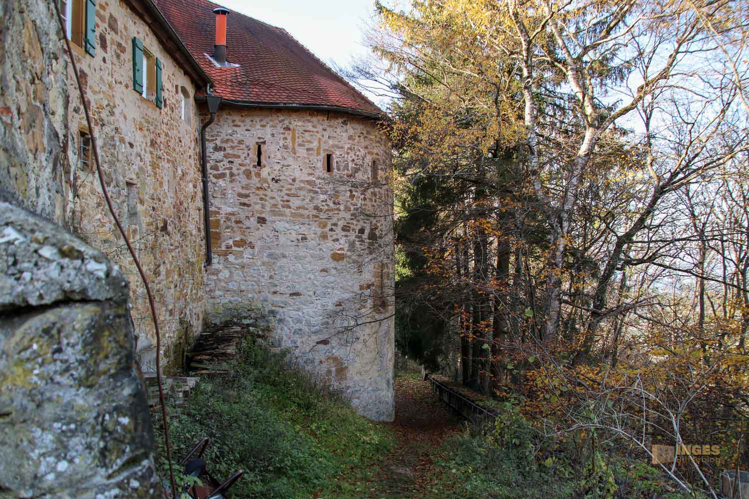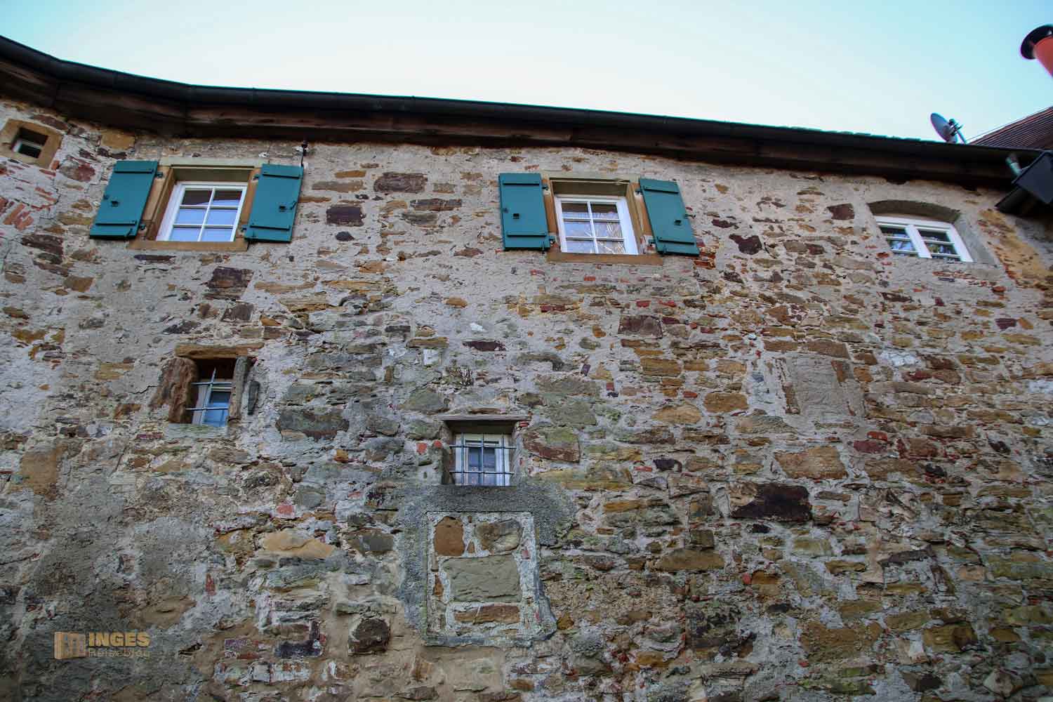 bei dem mir die gleichen Buckelquadersteine auffallen wie sie auch beim Burg Wäscherschloss verwendet wurden. Die waren für die staufische Zeit typisch, an den Außenseite ein bisschen glatt gemacht, die Innenfläche aber buckelig gelassen. Und groß hat man sie gelassen. Ich kann mir vorstellen, dass das zu damaliger Zeit ein ganz schöner Kraftakt gewesen ist, so eine Burg mit so großen Steinen zu bauen. Da bekommt das Lied 'Stein auf Stein, das Häuschen wird bald fertig sein' eine ganz andere Bedeutung. Auch die Rundbogenfenster weisen auf die Stauferzeit, in der die Burg erbaut wurde.