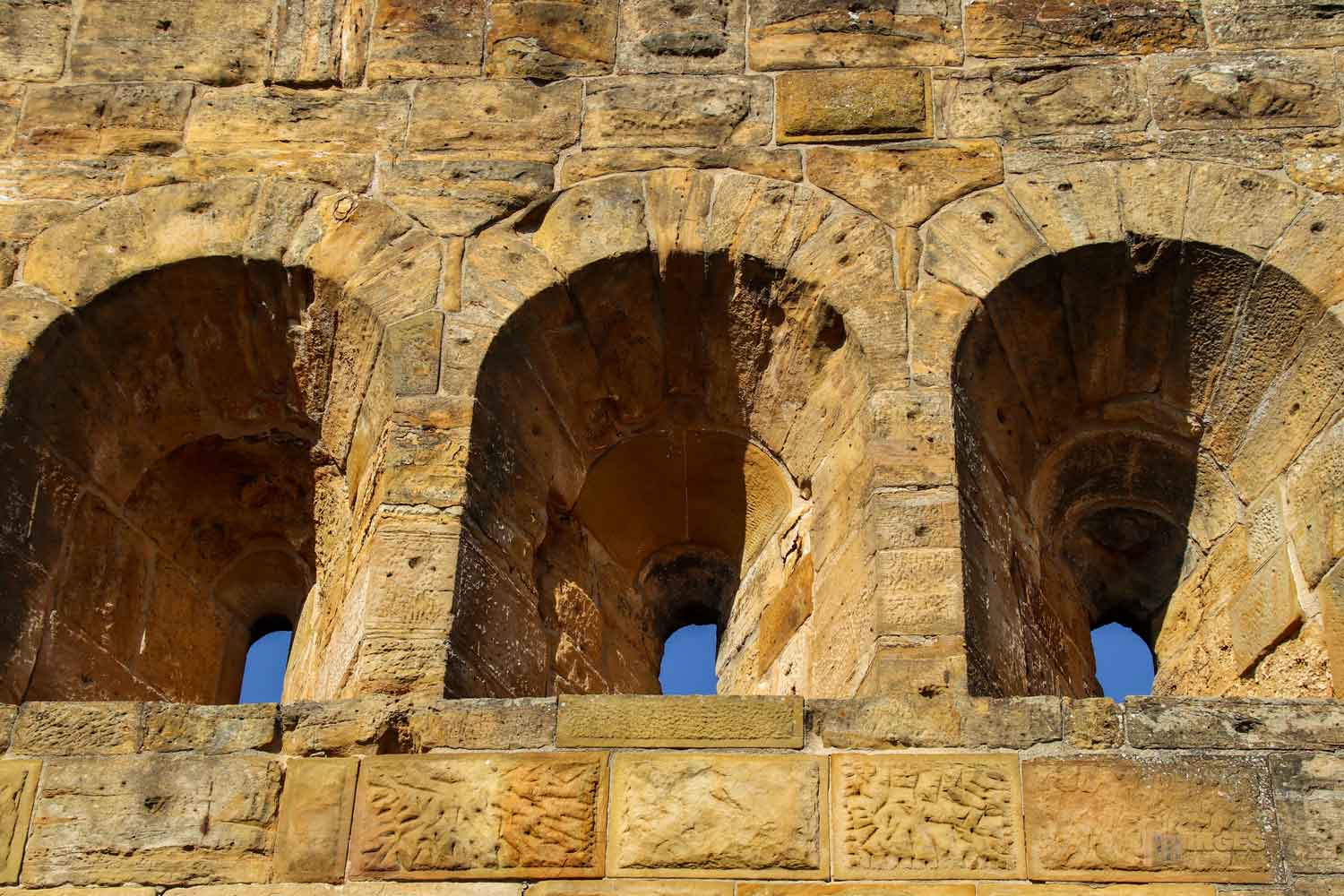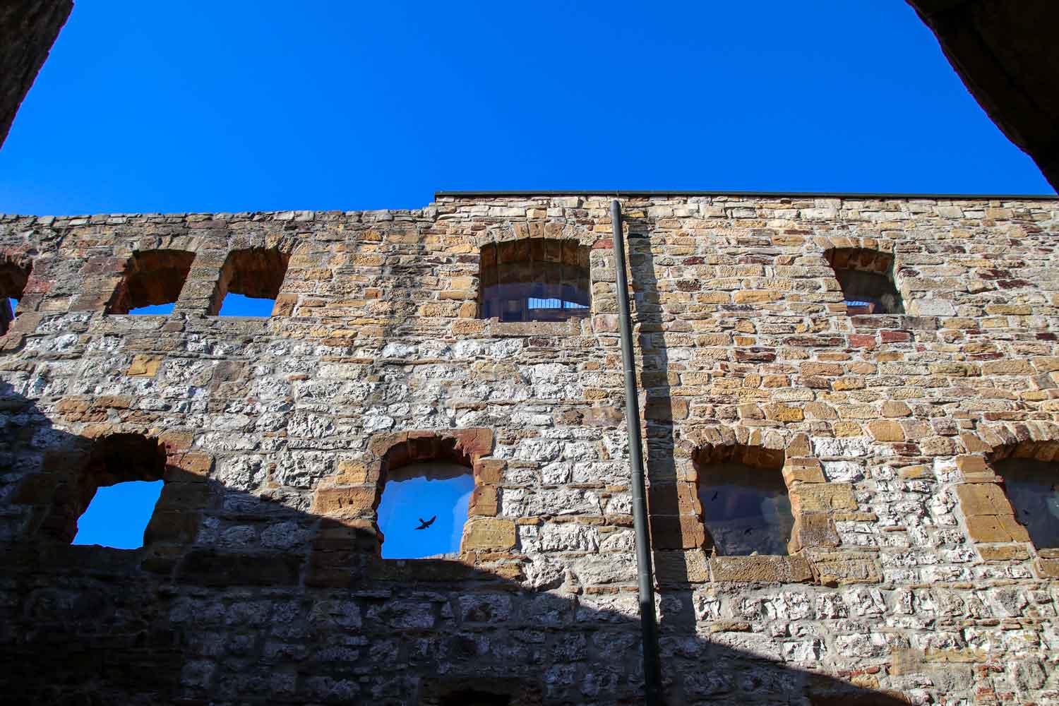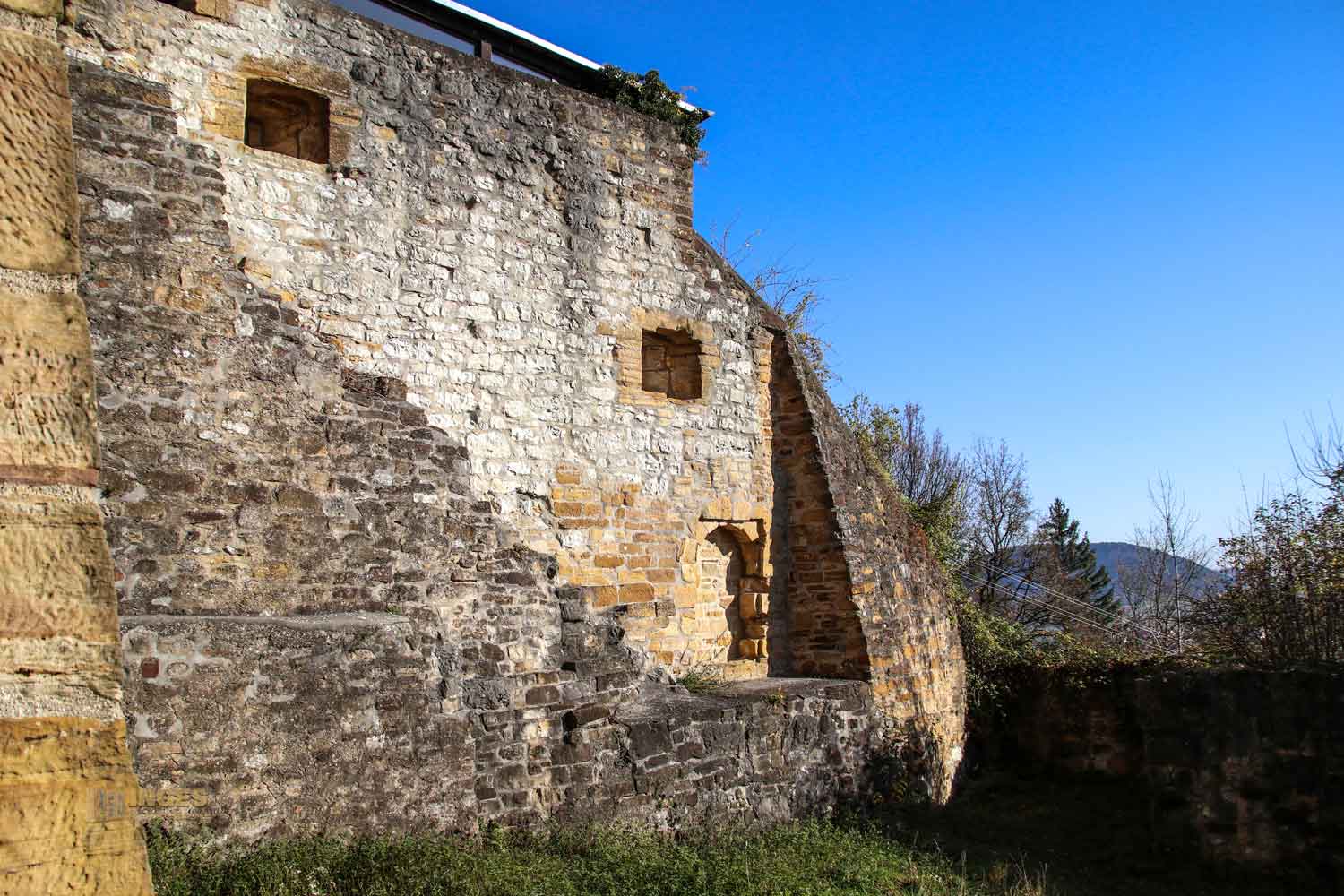 bei dem mir die gleichen Buckelquadersteine auffallen wie sie auch beim Burg Wäscherschloss verwendet wurden. Die waren für die staufische Zeit typisch, an den Außenseite ein bisschen glatt gemacht, die Innenfläche aber buckelig gelassen. Und groß hat man sie gelassen. Ich kann mir vorstellen, dass das zu damaliger Zeit ein ganz schöner Kraftakt gewesen ist, so eine Burg mit so großen Steinen zu bauen. Da bekommt das Lied 'Stein auf Stein, das Häuschen wird bald fertig sein' eine ganz andere Bedeutung. Auch die Rundbogenfenster weisen auf die Stauferzeit, in der die Burg erbaut wurde.