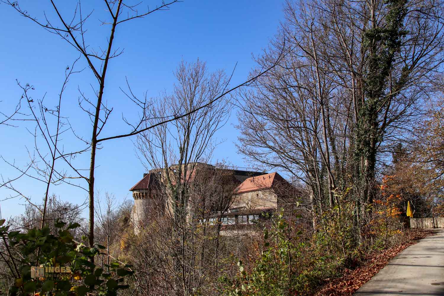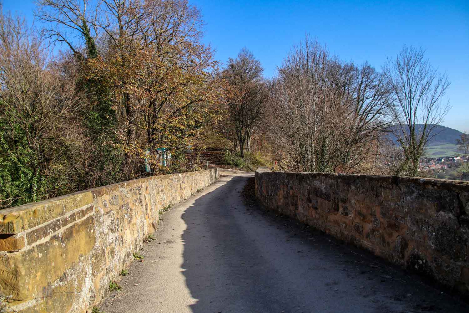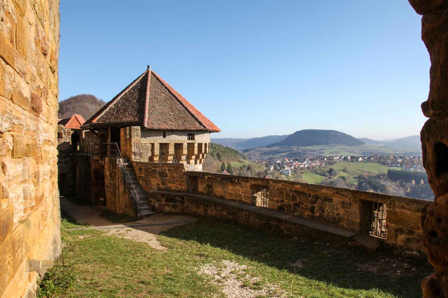 Diese Sicht geht Richtung Schwäbisch Gmünd und weiter bis in die Gegend um Schwäbisch Hall. Die Vorburg durfte auch noch teilweise mit aufs Foto. Wollt ihr anschließend weiter zur Wallfahrtskirche seht ihr schonmal den Weg nach oben.