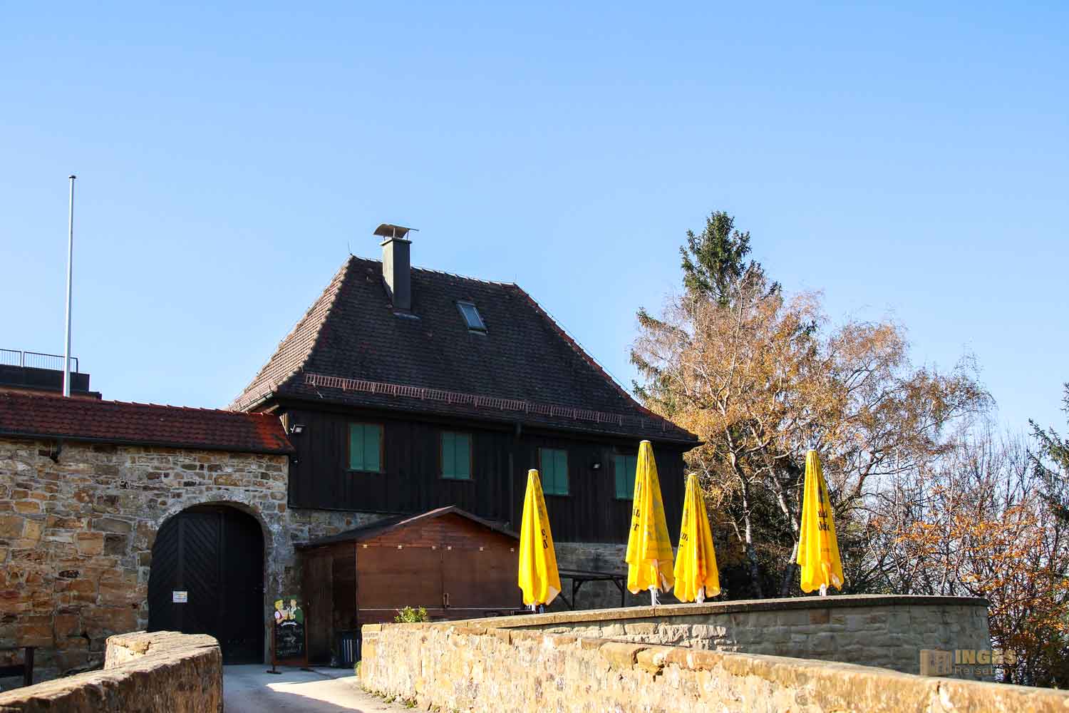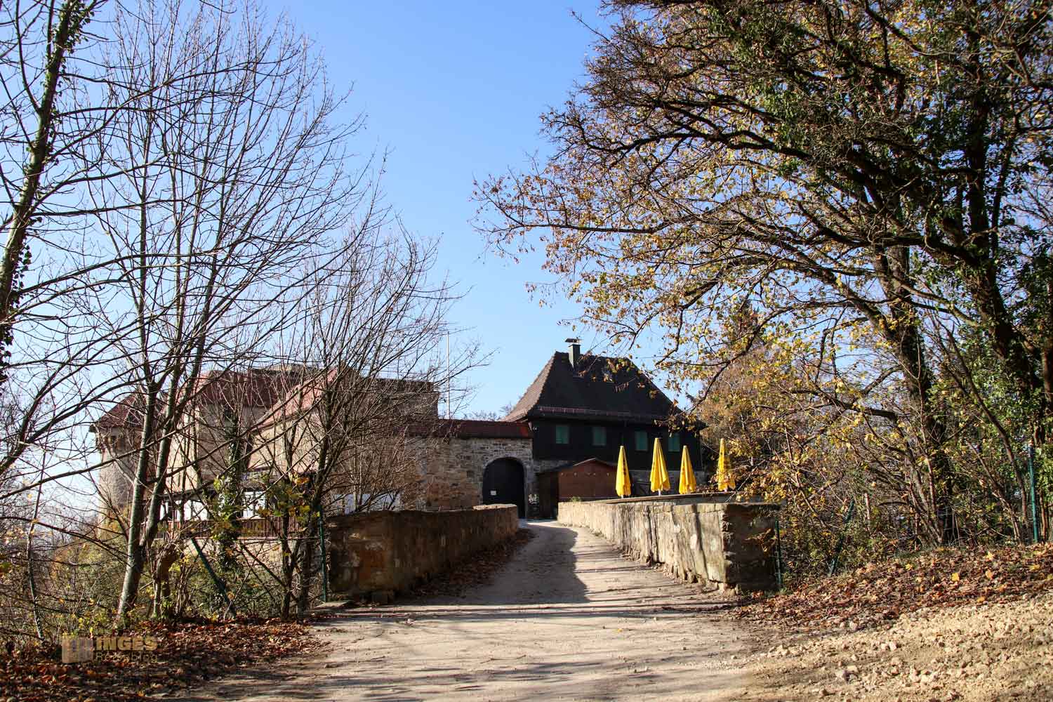 Über eine Steinbrücke geht es hinüber zur Vorburg, in der die Besucher (zu normalen Zeiten) eine geöffnete Burggaststätte vorfinden. Heute waren nur die strahlend gelben Sonnenschirme in dem kleinen Biergarten zu sehen, völlig verlassen warten sie auf bessere Zeiten.