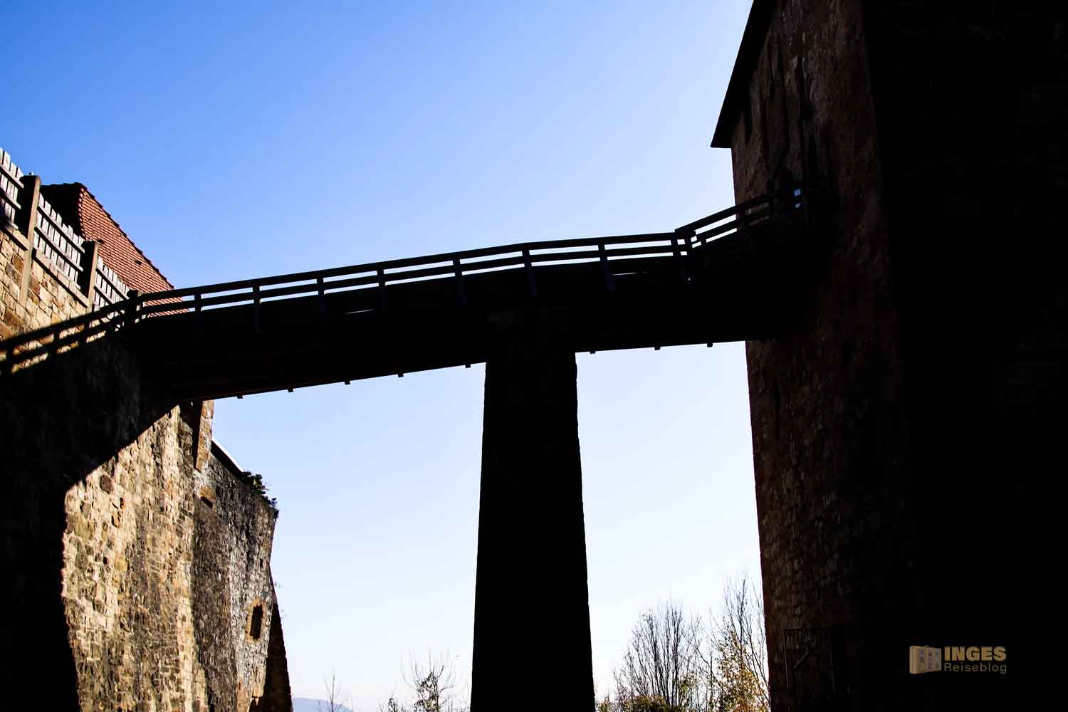 Es ist schon ein gigantisches Gefühl, so klein da unten im Burggraben zu stehen und hinauf zur Holzbrücke zu sehen, die von der Vorburg in die Kernburg führt. Ein einziger steinerner Brückenpfeiler trägt die Brücke.