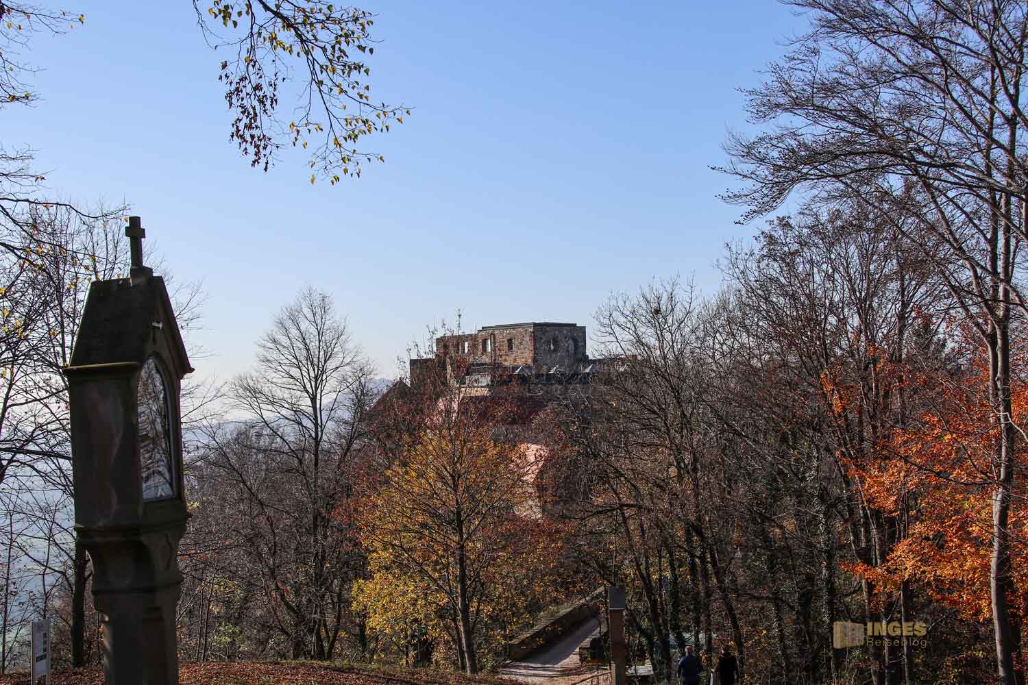 Egal ob ihr jetzt den unteren Weg wählt oder einfach weiter bergauf geht, die Ruine könnt ihr nicht verfehlen. Eigentlich war laut Internet die Ruine wegen Corona komplett für Besichtigungen geschlossen. Unser Plan war, als wir zur Ruine abgebogen sind - vielleicht können wir von außen Fotos machen.