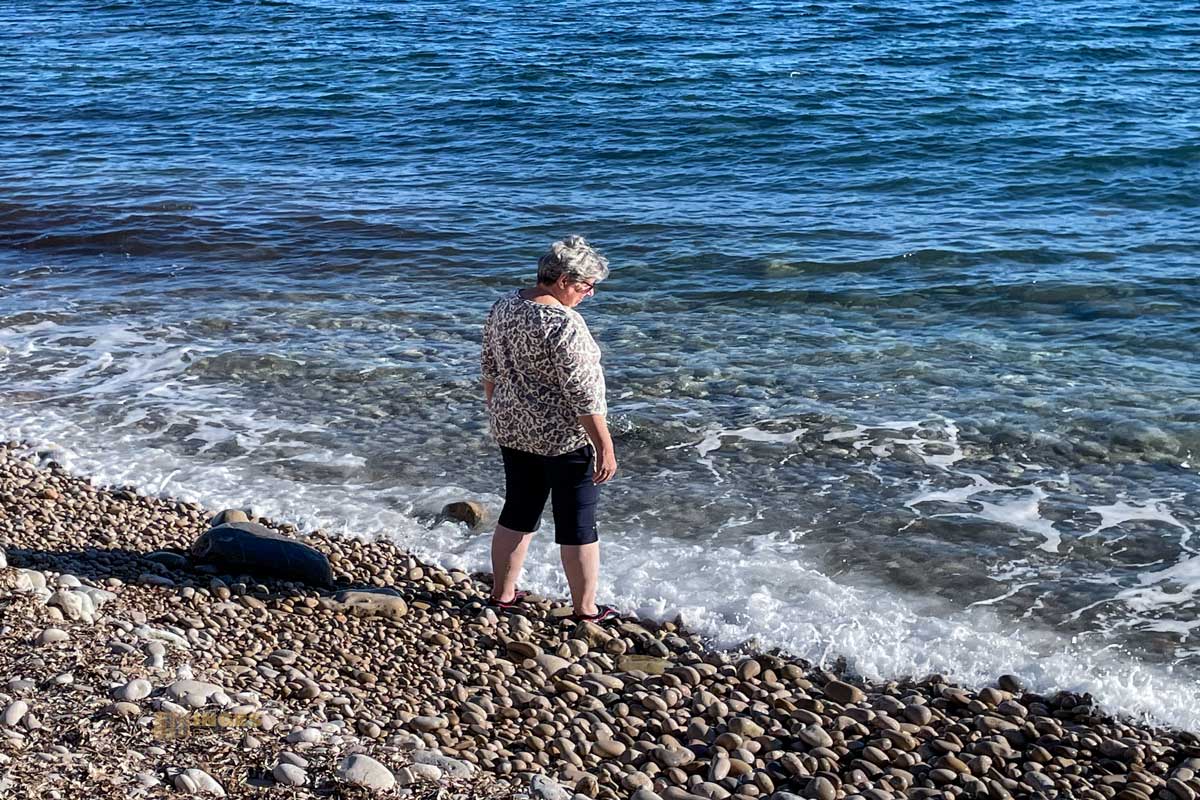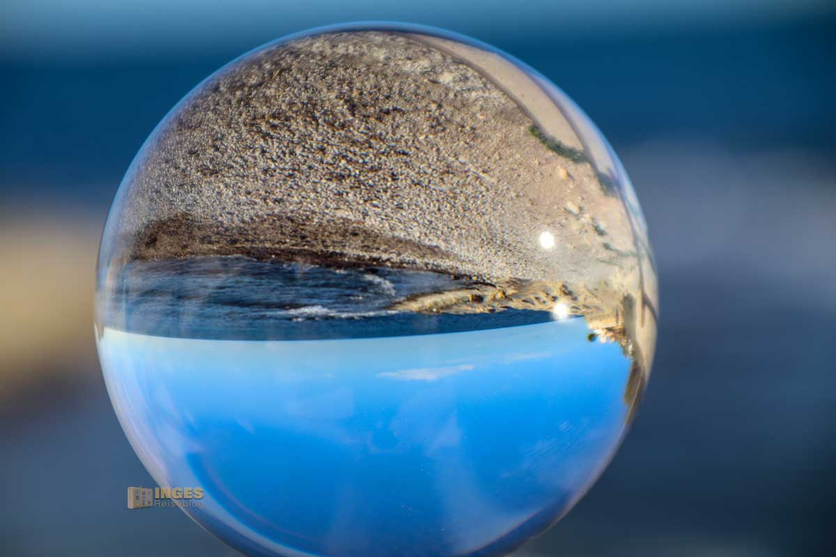 eine unserer Lieblingsbuchten. Wir genossen den Nachmittag am Kieselstrand, ich hab mich ins Wasser gewagt und kleine Spielereien mit der Glaskugel gemacht. Auch wenn es ein bisschen ungelenk aussieht, wie ich da so im Wasser stehe. Der Untergrund waren Kiesel, und ich merkte mal wieder: Inge, du darfst üben. Aber solange es nur solche Überbleibsel sind, wäre das Meckern auf allerhöchstem Niveau. Übrigens, das Wasser war überhaupt nicht kalt - und wir haben den 08.02..