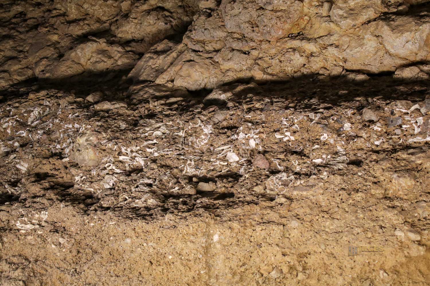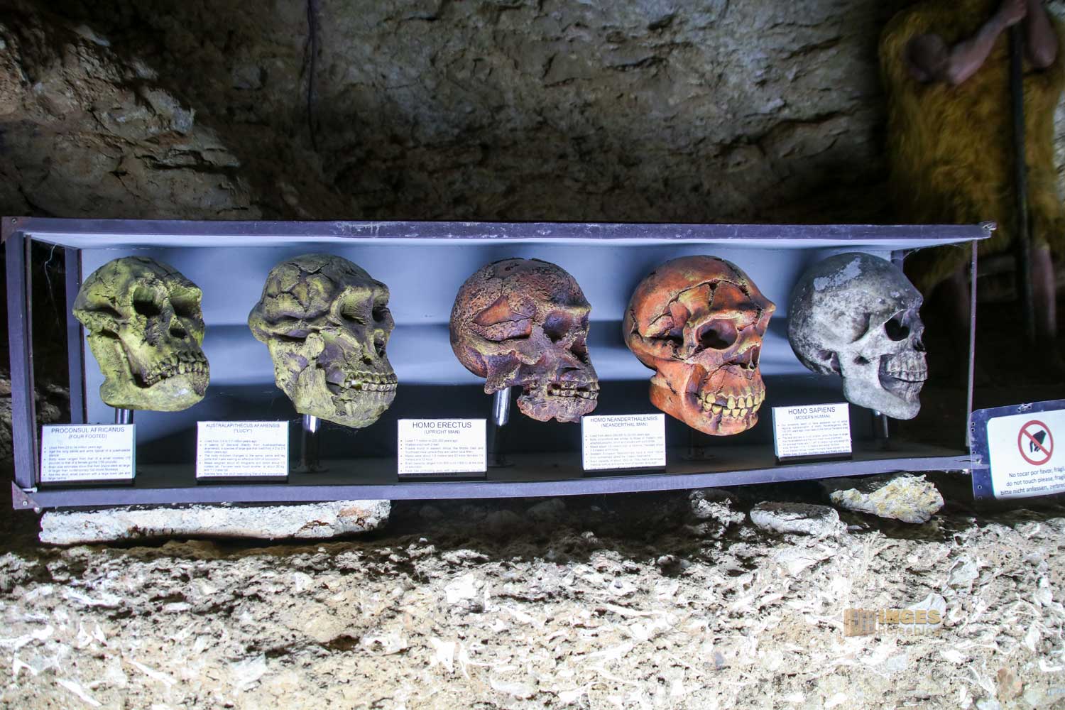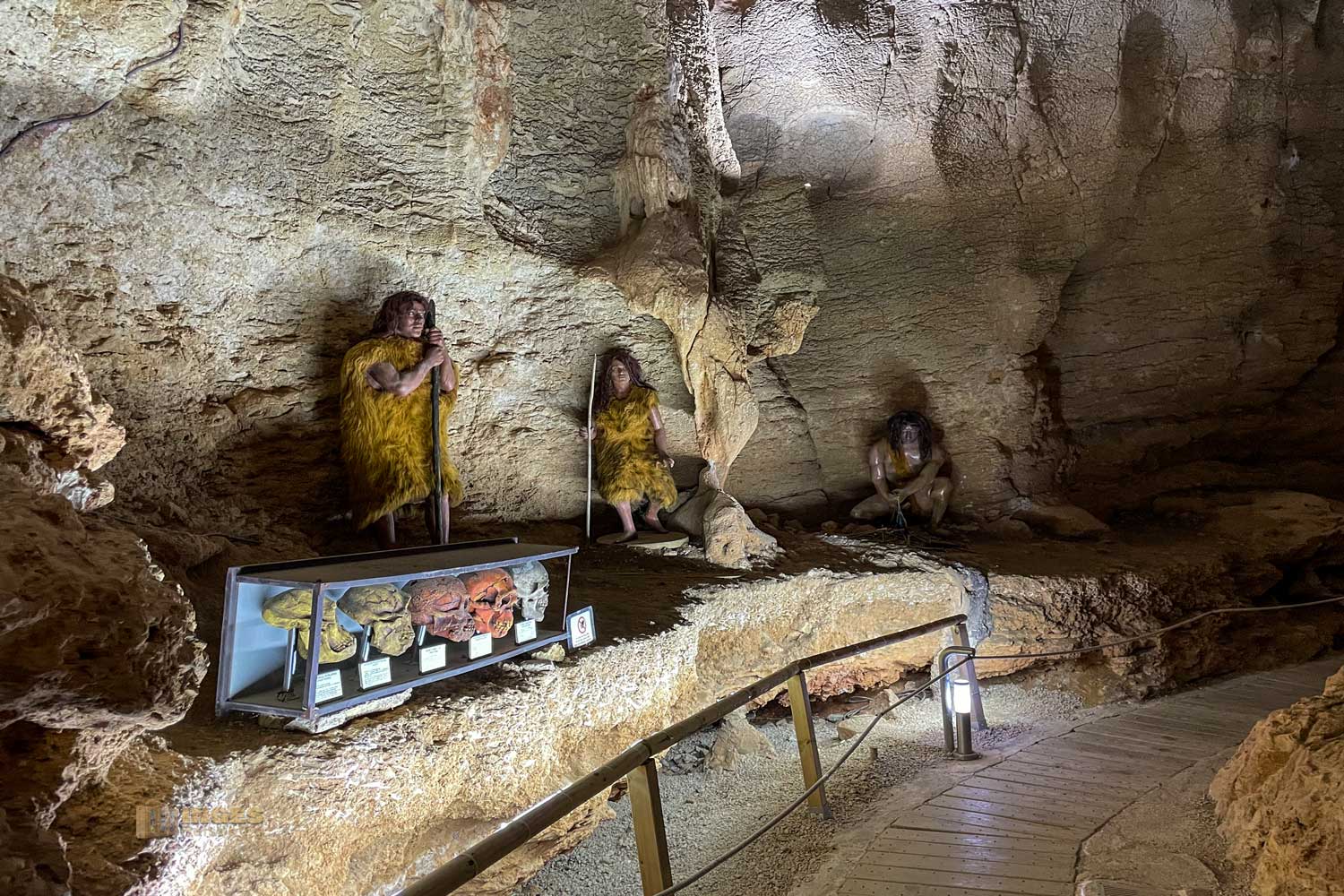 So ca. 1 km von Benidoleig befindet sich der Eingang der Cova de les Calaveras, wie sie auf valencianisch genannt wird. Ein kleines Eintrittsgeld wird fällig, dann kann man auf einem Weg auf eigene Faust 440 Meter durch die Höhle gehen. Im Eingangsbereich, bzw. der Halle wird schon deutlich, dass es Spuren aus der Altsteinzeit in der Höhle gab. Dass man im 18. Jahrhundert von zwölf Menschen Skelettreste hier fand, kann man ja ausblenden. Wer an den Infotafeln aber liest, der wird an dieser Wand nicht vorbeikommen, die eben diese Funde mit Knochenresten zeigt. Übersetzt bedeutet Calaveras auch 'Schädelhöhle'.