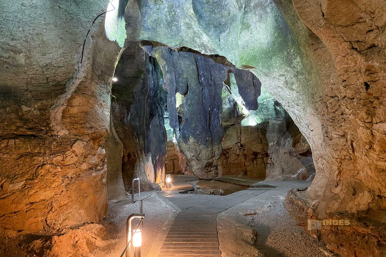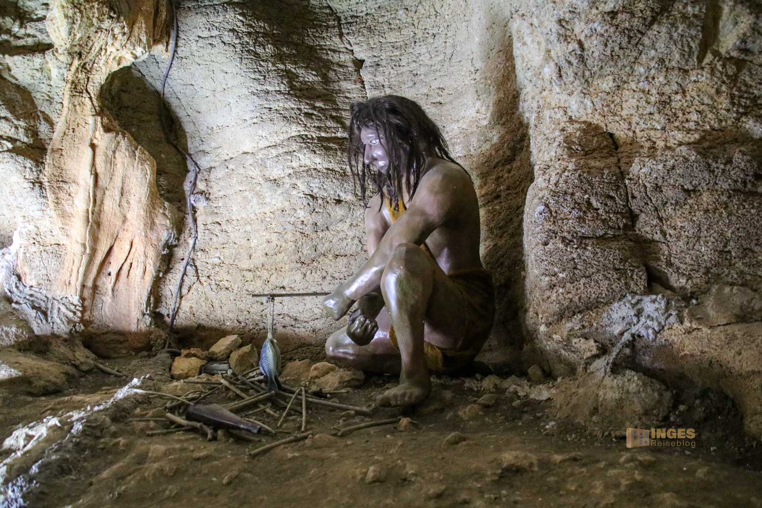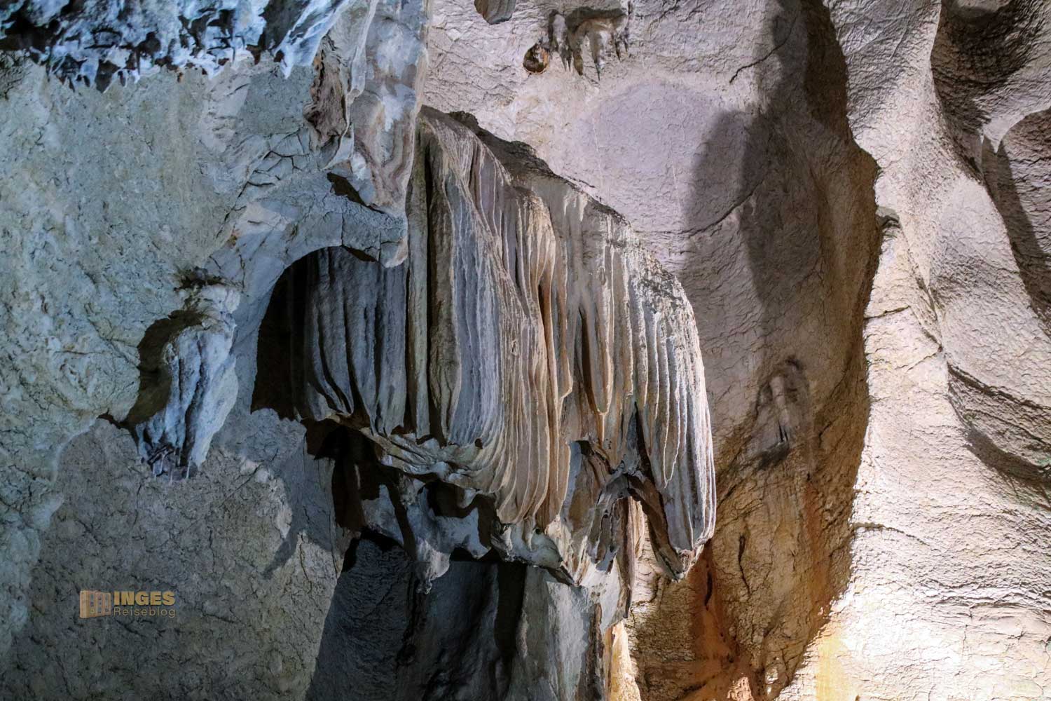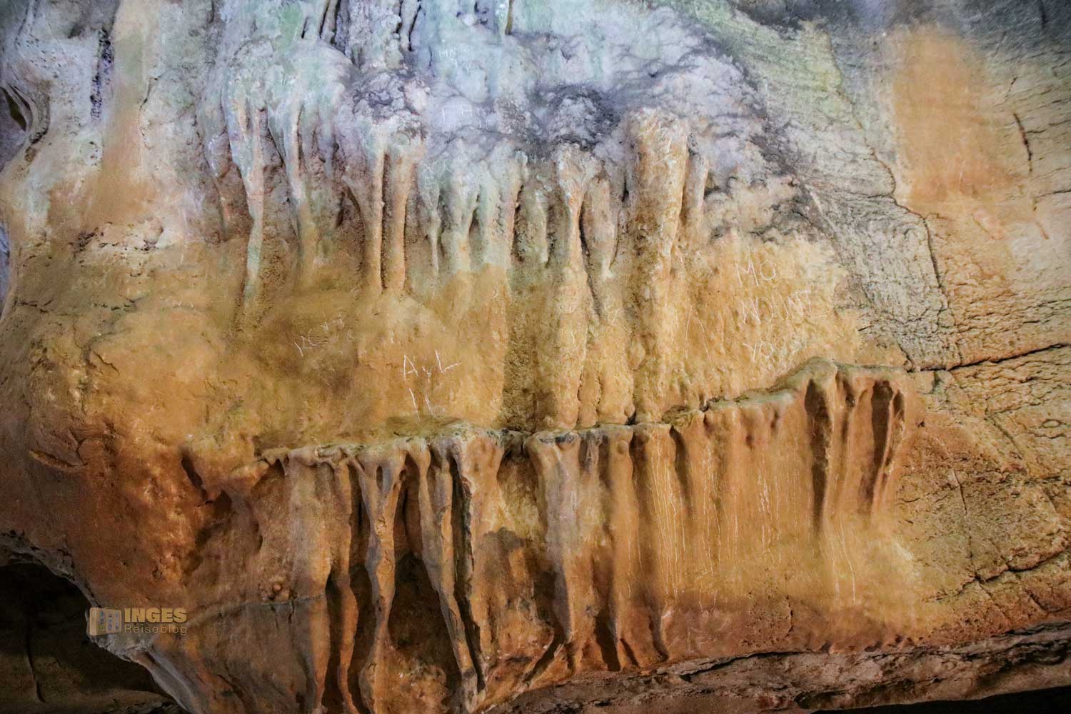Bei einer konstanten Temperatur so um die 18 Grad und mit dem vorhandenen Wasser ließ sich die Höhle gut als Wohnhöhle nutzen. Rauch konnte durch drei Öffnungen durch den Berg abziehen, und am Höhleneingang hielt man Raubtiere mit einem offenen Feuer ab. Mit uns war nur noch eine Familie mit Kindern auf dem hölzernen Weg unterwegs. Neben dem lassen sich immer wieder Stalagmiten und Stalaktiten entdecken. Kommt mal mit ....