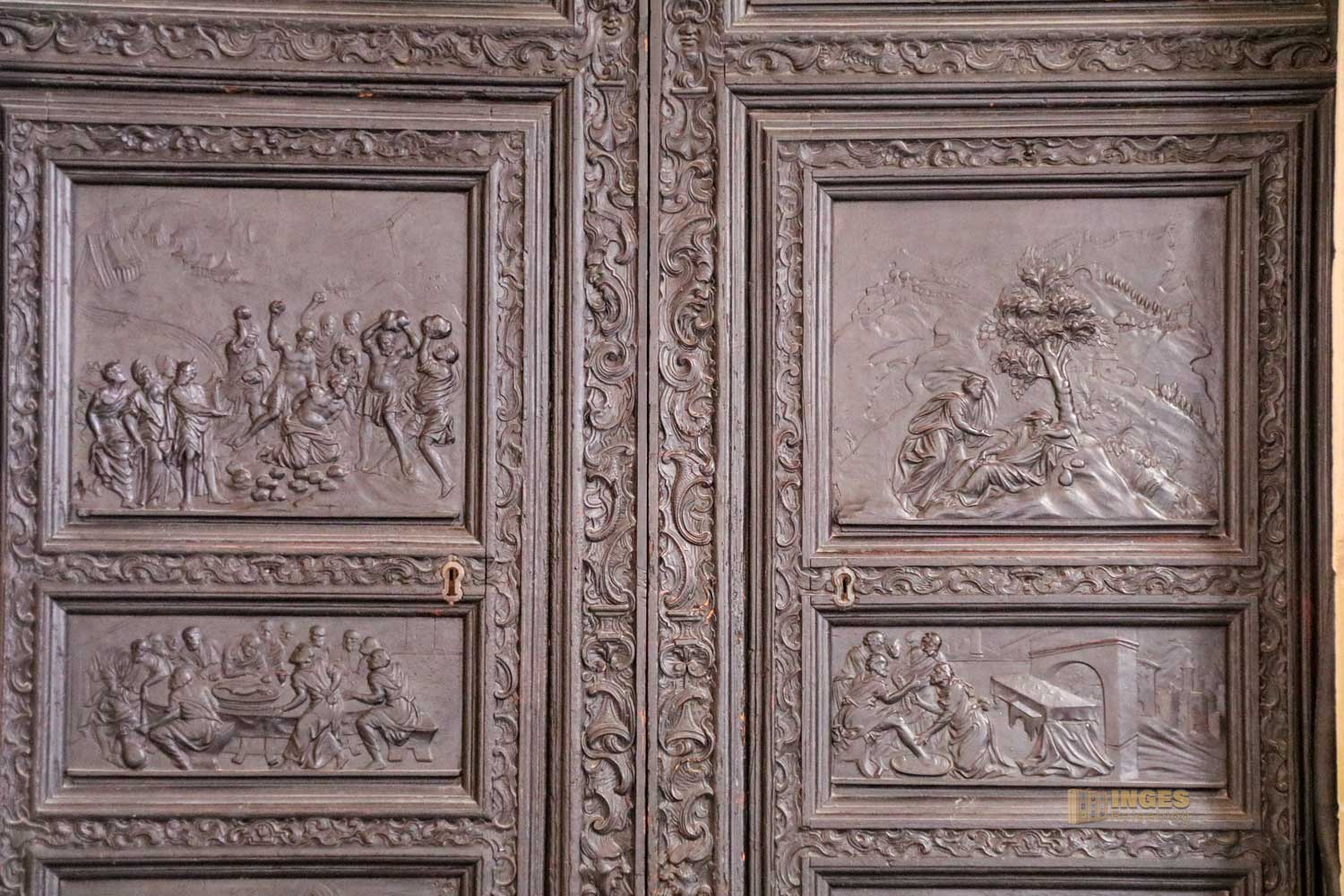 Gegen eine Spende kann man über den Kreuzgang in die Kirche gelangen. Auf diesem Weg gilt auch gleich dem Kirchenschatz einen Blick. Und nicht nur dem - man sollte sich die Türe genauer anschauen. Ich liebe solche Kirchentüren, die biblische Szenen darstellen und habe solche auch schon des Öfteren in meinem heimatlichen Umfeld gefunden.