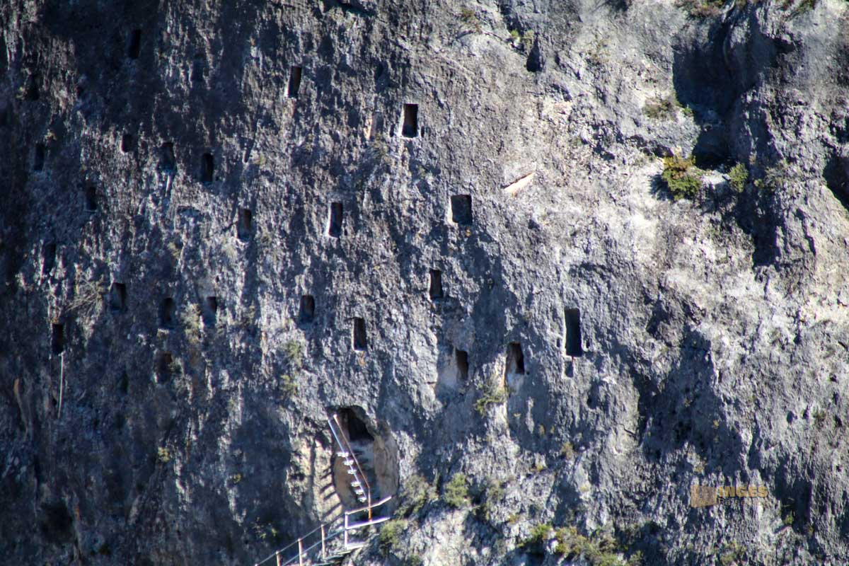 Ohne Führung geht hier gar nix. Und eine solche ist auch nicht für alle Menschen empfohlen. Als ich vom Ort zu den Höhlen hinüberblickte, war der schon im Geiste bei mir durchgestrichen. Was hätte ich früher solche Besichtigungen geliebt. Aber seit meinen kleinen Schlaganfällen tue ich mir schwer mit Höhe und Tiefe, und wie eine gelenkige Gemse kletter ich auch nicht mehr solche Treppen hoch.
