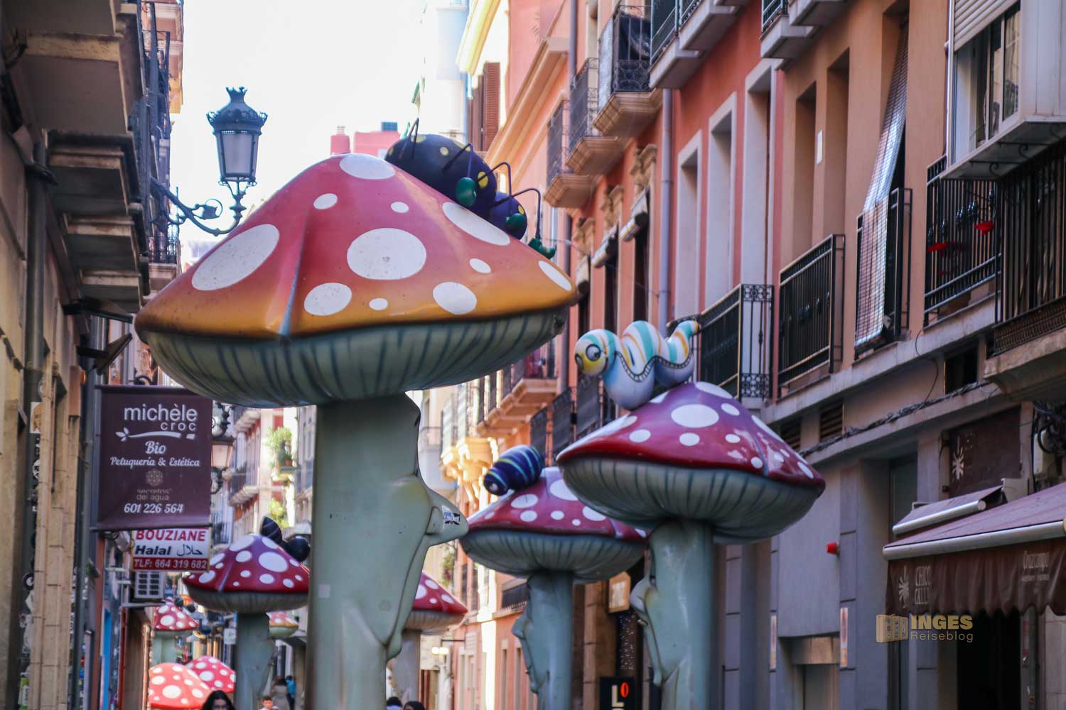 2013 wurden die überdimensionalen, bunt bemalten Fliegenpilze aufgestellt. Auf oder zwischen den Pilzen sitzen lustige Ameisen, Schnecken und anderes Getier. Das Ziel mit dieser Kunstaktion war, die Straße vor dem wirtschaftlichen Untergang zu bewahren und sie so wieder aufzuwerten. Hmm ... das kann man jetzt so und so sehen. Es gab ein paar kleine Lokale, wo mich keines wirklich angesprochen hätte (außer ein paar Cafés) und ein paar kleine Lädelchen.