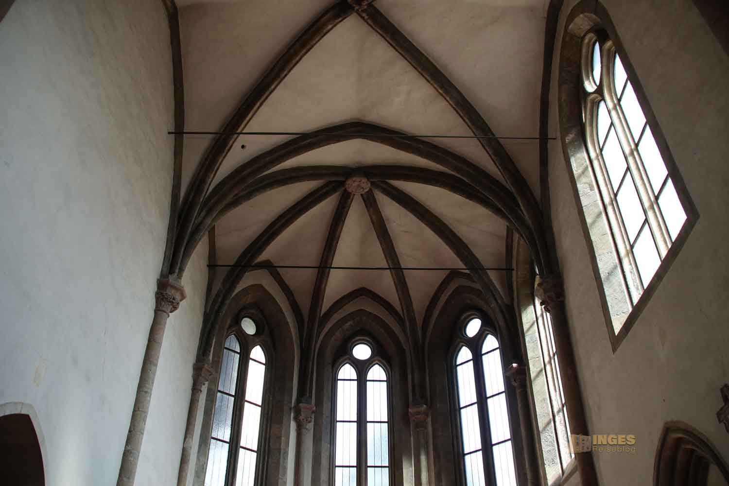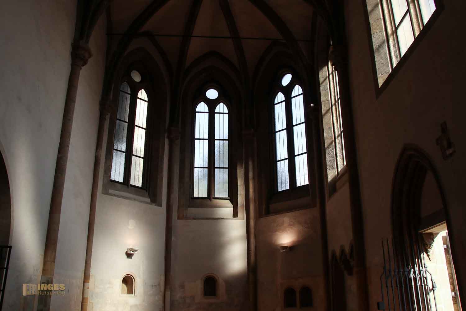 der für Musikveranstaltungen genutzt wird. 37 Meter geht es nach oben mit einer modernen Holzdecke. Im ersten Moment sah ich mich mit den vielen Stuhlreihen in die Bethlemskapelle in der Altstadt von Prag versetzt. Auch sie wird für Veranstaltungen genutzt.